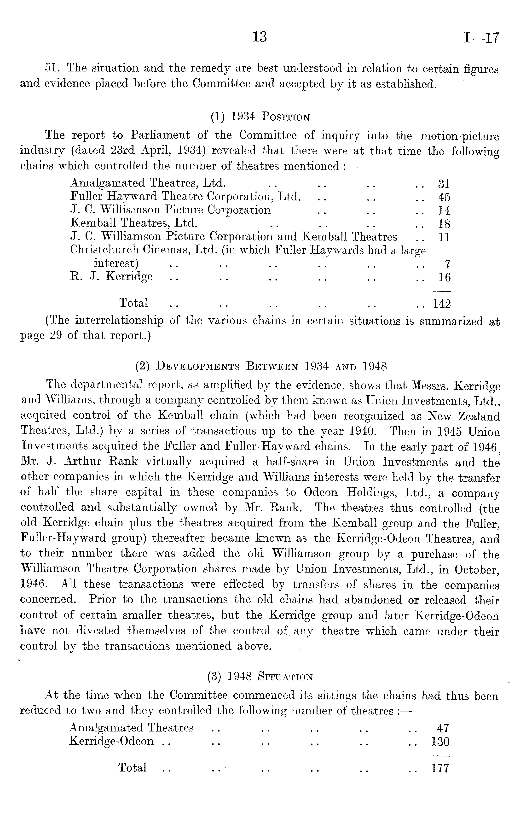51. The situation and the remedy are best understood in relation to certain figures and evidence placed before the Committee and accepted by it as established. (1) 1934 Position The report to Parliament of the Committee of inquiry into the motion-picture industry (dated 23rd April, 1934) revealed that there were at that time the following chains which controlled the number of theatres mentioned : Amalgamated Theatres, Ltd. .. .. .. .. 31 Fuller Hayward Theatre Corporation, Ltd. .. .. .. 45 J. C. Williamson Picture Corporation .. .. 14 Kemball Theatres, Ltd. .. .. .. .. 18 J. C. Williamson Picture Corporation and Kemball Theatres .. 11 Christchurch Cinemas, Ltd. (in which Fuller Haywards had a large interest) .. .... .. .. 7 R. J. Kerridge .. .. .. .. .. 16 Total .. .. .. .. .. .. 142 (The interrelationship of the various chains in certain situations is summarized at page 29 of that report.) (2) Developments Between 1934 and 1948 The departmental report, as amplified by the evidence, shows that Messrs. Kerridge and Williams, through a company controlled by them known as Union Investments, Ltd., acquired control of the Kemball chain (which had been reorganized as New Zealand Theatres, Ltd.) by a series of transactions up to the year 1940. Then in 1945 Union Investments acquired the Fuller and Fuller-Hayward chains. In the early part of 1946 5 Mr. J. Arthur Rank virtually acquired a half-share in Union Investments and the other companies in which the Kerridge and Williams interests were held by the transfer of half the share capital in these companies to Odeon Holdings, Ltd., a company controlled and substantially owned by Mr. Rank. The theatres thus controlled (the old Kerridge chain plus the theatres acquired from the Kemball group and the Fuller, Fuller-Hayward group) thereafter became known as the Kerridge-Odeon Theatres, and to their number there was added the old Williamson group by a purchase of the Williamson Theatre Corporation shares made by Union Investments, Ltd., in October, 1946. All these transactions were effected by transfers of shares in the companies concerned. Prior to the transactions the old chains had abandoned or released their control of certain smaller theatres, but the Kerridge group and later Kerridge-Odeon have not divested themselves of the control of. any theatre which came under their control by the transactions mentioned above. (3) 1948 Situation At the time when the Committee commenced its sittings the chains had thus been reduced to two and they controlled the following number of theatres Amalgamated Theatres .. .. .. .. 47 Kerridge-Odeon .. .. .. .. .. .. 130 Total .. .. .. .. .. .. 177