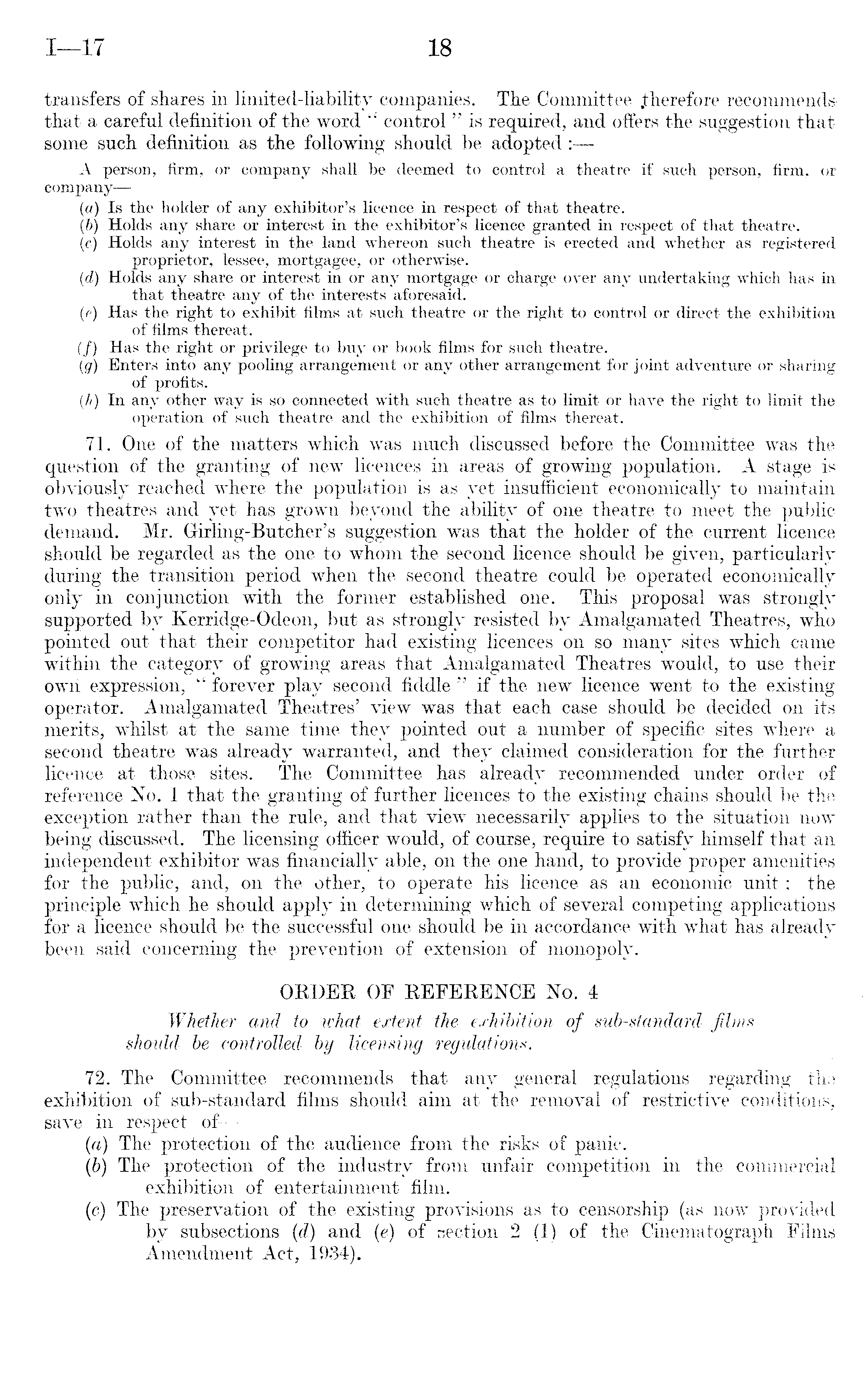 transfers of shares in limited-liability companies. The Committee .therefore recommends that a careful definition of the word " control " is required, and offers the suggestion that some such definition as the following should be adopted : A person, firm, or company shall be deemed to control a theatre if such person, firm, or company—(a) Is the holder of any exhibitor's licence in respect of that theatre. (b) Holds any share or interest in the exhibitor's licence granted in respect of that theatre. (c) Holds any interest in the land whereon such theatre is erected and whether as registered proprietor, lessee, mortgagee, or otherwise. (d) Holds any share or interest in or any mortgage or charge over any undertaking which has in that theatre any of the interests aforesaid. (e) Has the right to exhibit films at such theatre or the right to control or direct the exhibition of films thereat. (/) Has the right or privilege to buy or book films for such theatre. (g) Enters into any pooling arrangement or any other arrangement for joint adventure or sharing of profits. (A) In any other way is so connected with such theatre as to limit or have the right to limit the operation of such theatre and the exhibition of films thereat. 71. One of the matters which was much discussed before the Committee was the question of the granting of new licences in areas of growing population. A stage is obviously reached where the population is as yet insufficient economically to maintain two theatres and yet has grown beyond the ability of one theatre to meet the public demand. Mr. Girling-Butcher's suggestion was that the holder of the current licence should be regarded as the one to whom the second licence should be given, particularly during the transition period when the second theatre could be operated economically only in conjunction with the former established one. This proposal was strongly supported by Kerridge-Odeon, but as strongly resisted by Amalgamated Theatres, who pointed out that their competitor had existing licences on so many sites which came within the category of growing areas that Amalgamated Theatres would, to use their owii expression, " forever play second fiddle " if the new licence went to the existing operator. Amalgamated Theatres' view was that each case should be decided on its merits, whilst at the same time they pointed out a number of specific sites where a second theatre was already warranted, and they claimed consideration for the further licence at those sites. The Committee has already recommended under order of reference No. 1 that the granting of further licences to the existing chains should be the exception rather than the rule, and that view necessarily applies to the situation now being discussed. The licensing officer would, of course, require to satisfy himself that an independent exhibitor was financially able, on the one hand, to provide proper amenities for the public, and, on the other, to operate his licence as an economic unit; the principle which he should apply in determining which of several competing applications for a licence should be the successful one should be in accordance with what has already been said concerning the prevention of extension of monopoly. ORDER OF REFERENCE No. 4 Whether and to what extent the exhibition of sub-standard films should be controlled by licensing regulations. 72. The Committee recommends that any general regulations regarding the exhibition of sub-standard films should aim at the removal of restrictive conditions, save in respect of — (a) The protection of the audience from the risks of panic. (b) The protection of the industry from unfair competition in the commercial exhibition of entertainment film. (c) The preservation of the existing provisions as to censorship (as now provided by subsections (d) and (e) of section 2 (1) of the Cinematograph Films Amendment Act, 1934).