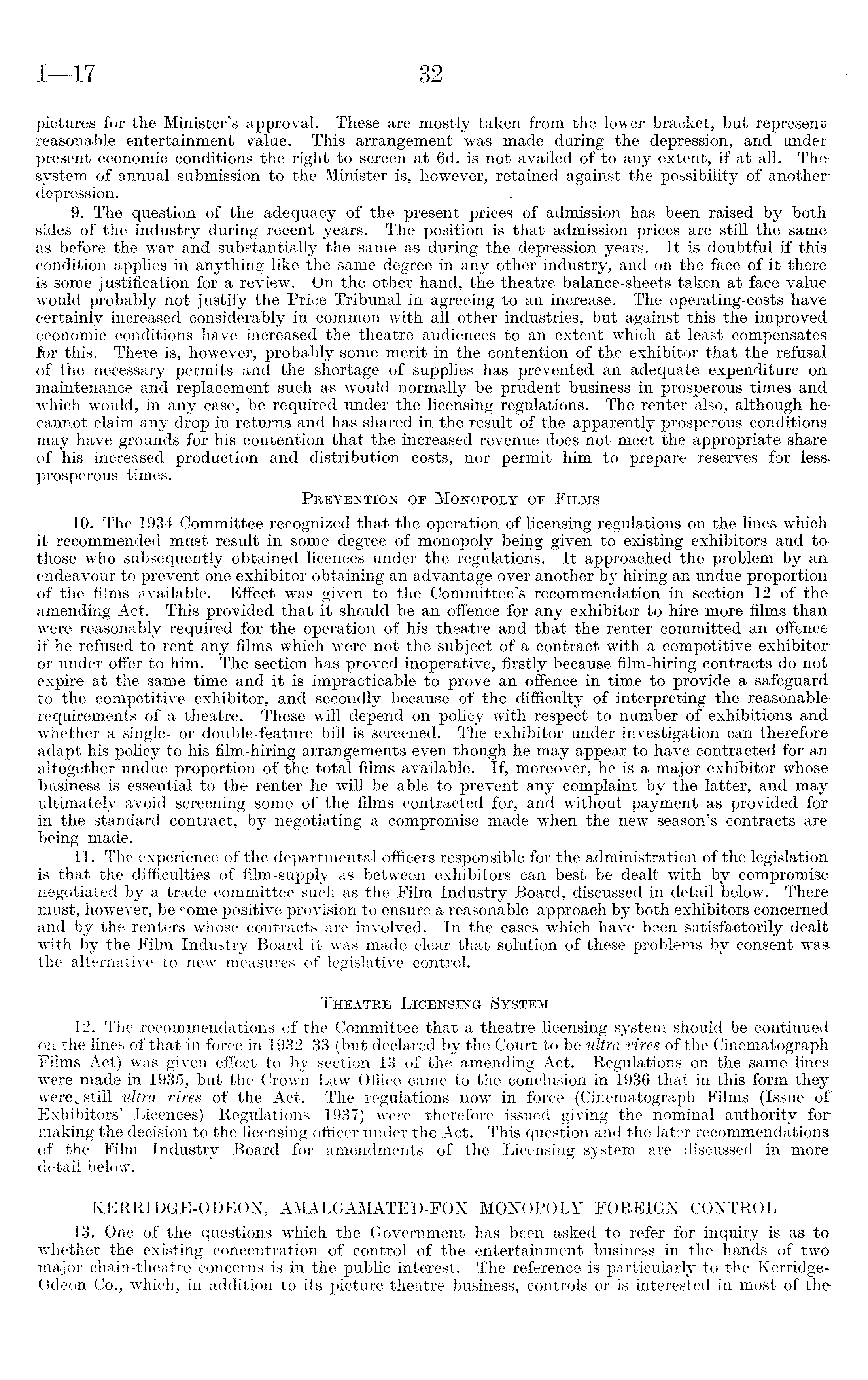 pictures for the Minister's approval. These are mostly taken from the lower bracket, but represent reasonable entertainment value. This arrangement was made during the depression, and under present economic conditions the right to screen at 6d. is not availed of to any extent, if at all. The system of annual submission to the Minister is, however, retained against the possibility of another depression. 9. The question of the adequacy of the present prices of admission has been raised by both sides of the industry during recent years. The position is that admission prices are still the same as before the war and substantially the same as during the depression years. It is doubtful if this condition applies in anything like the same degree in any other industry, and on the face of it there is some justification for a review. On the other hand, the theatre balance-sheets taken at face value would probably not justify the Pri<;e Tribunal in agreeing to an increase. The operating-costs have certainly increased considerably in common with all other industries, but against this the improved economic conditions have increased the theatre audiences to an extent which at least compensates for this. There is, however, probably some merit in the contention of the exhibitor that the refusal of the necessary permits and the shortage of supplies has prevented an adequate expenditure on maintenance and replacement such as would normally be prudent business in prosperous times and which would, in any case, be required under the licensing regulations. The renter also, although he cannot claim any drop in returns and has shared in the result of the apparently prosperous conditions may have grounds for his contention that the increased revenue does not meet the appropriate share of his increased production and distribution costs, nor permit him to prepare reserves for lessprosperous times. Prevention oe Monopoly of Films 10. The 1934 Committee recognized that the operation of licensing regulations on the lines which it recommended must result in some degree of monopoly being given to existing exhibitors and to those who subsequently obtained licences under the regulations. It approached the problem by an endeavour to prevent one exhibitor obtaining an advantage over another by hiring an undue proportion of the films available. Effect was given to the Committee's recommendation in section 12 of the amending Act. This provided that it should be an offence for any exhibitor to hire more films than were reasonably required for the operation of his theatre and that the renter committed an offence if he refused to rent any films which were not the subject of a contract with a competitive exhibitor or under offer to him. The section has proved inoperative, firstly because film-hiring contracts do not expire at the same time and it is impracticable to prove an offence in time to provide a safeguard to the competitive exhibitor, and secondly because of the difficulty of interpreting the reasonable requirements of a theatre. These will depend on policy with respect to number of exhibitions and whether a single- or double-feature bill is screened. The exhibitor under investigation can therefore adapt his policy to his film-hiring arrangements even though he may appear to have contracted for an altogether undue proportion of the total films available. If, moreover, he is a major exhibitor whose business is essential to the renter he will be able to prevent any complaint by the latter, and may ultimately avoid screening some of the films contracted for, and without payment as provided for in the standard contract, by negotiating a compromise made when the new season's contracts are being made. 11. The experience of the departmental officers responsible for the administration of the legislation is that the difficulties of film-supply as between exhibitors can best be dealt with by compromise negotiated by a trade committee such as the Film Industry Board, discussed in detail below. There must, however, be "ome positive provision to ensure a reasonable approach by both exhibitors concerned and by the renters whose contracts are involved. In the cases which have been satisfactorily dealt with by the Film Industry Board it was made clear that solution of these problems by consent was the alternative to new measures of legislative control. Theatre Licensing System 12. The recommendations of the Committee that a theatre licensing system should be continued on the lines of that in force in 1932-33 (but declared by the Court to be ultra vires of the Cinematograph Films Act) was given effect to by section 13 of the amending Act. Regulations on the same lines; were made in 1935, but the Crown Law Office came to the conclusion in 1936 that in this form they still ultra vires of the Act. The regulations now in force (Cinematograph Films (Issue of Exhibitors' Licences) Regulations 1937) were therefore issued giving the nominal authority for making the decision to the licensing officer under the Act. This question and the later recommendations of the Film Industry Board for amendments of the Licensing system are discussed in more detail below. KERRIDGE - ODE ON, AMALGAMATED-FOX MONOPOLY FOREIGN CONTROL 13. One of the questions which the Government has been asked to refer for inquiry is as to whether the existing concentration of control of the entertainment business in the hands of two major chain-theatre concerns is in the public interest. The reference is particularly to the KerridgeOdeon Co., which, in addition to its picture-theatre business, controls or is interested in most of the