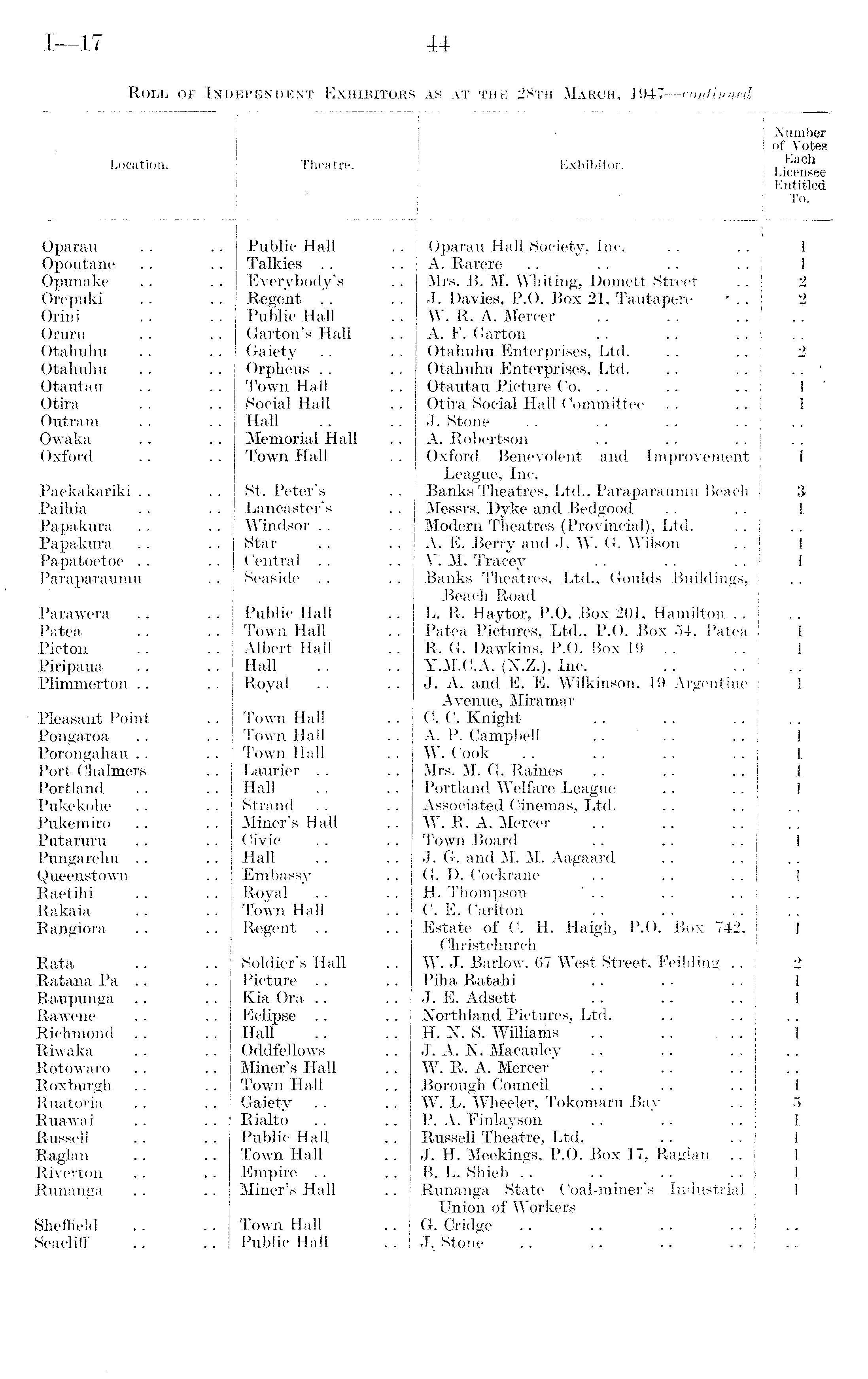 Number of Votes Location. Theatre. Exhibitor. Each Licensee Entitled To. Oparau Public Hall Oparau Hall Society, Inc. | 1 Opoutane Talkies A. Rarere | 1 Opunake Everybody's Mrs. B. M. Whiting, Domett Street 2 " Orepuki Regent J. Davies, P.O. Box 21, Tautapere 2 Orini Public Hall W. R. A. Mercer Oruru Garton's Hall A. P. Garton i Otahuhu Gaiety Otahuhu Enterprises, Ltd. 1 ' 2 Otahuhu Orpheus Town Hall Otahuhu Enterprises, Ltd. ... 1 0taut an Otautau Picture Co. i 1 ' Otira Social Hall Otira Social Hall Committee 1 1 Outram Hall J. Stone | Owaka Memorial Hall A. Robertson Oxford Town Hall Oxford Benevolent and Improvement League, Inc. i Paekakariki St. Peter's Banks Theatres, Ltd., Paraparaumu Beach 3 Paihia Lancaster's Messrs. Dyke and Bedgood 1 Papakura Windsor Modern Theatres (Provincial), Ltd. Papakura Star A. E. Berry and J. W. G. Wilson 1 Papatoetoe .. Central V. M. Tracey 1 Paraparaumu Seaside Banks Theatres, Ltd., Goulds Buildings, Beach Road " Parawera Public Hall L. R. Haytor, P.O. Box 201, Hamilton .. Patea Town Hall Patea Pictures, Ltd., P.O. Box 54, Patea 1 Picton Albert Hall R. G. Dawkins, P.O. Box 19 1 Piripaua Hall Y.M.C.A. (N.Z.), Inc. Plimmerton Royal J. A. and E. E. Wilkinson, 19 Argentine 1 Avenue, Miramar Pleasant Point Town Hall C. C. Knight Pongaroa Town Hall A. P. Campbell .. 1 Porongahau Town Hall W. Cook 1 Port Chalmers Laurier Mrs. M. G. Raines 1 Portland Hall Portland Welfare League 1 Pukekohe Strand Associated Cinemas, Ltd. Pukemiro Miner's Hall W. R. A. Mercer Putaruru .. Civic Town Board I Pungarehu . . Hall J. G. and M. M. Aagaard Queenstown Embassy G. D. Cochrane 1 Raetihi Royal Town Hall H. Thompson ' .. .. .. | Rakaia C. E. Carlton Rangiora Regent Estate of C. H. Haigh, P.O. Box 742, 1 Christchurch Rata Soldier's Hall W. J. Barlow, 67 West Street, Feilding .. Ratana Pa .. Picture Piha Ratahi I Raupunga Kia Ora J. E. Adsett 1 Rawene Eclipse, Northland Pictures, Ltd. Richmond . . Hall H. N. S. Williams .. i Riwaka Oddfellows J. A. N. Macauley Rotowaro Miner's Hall W. R. A. Mercer Roxburgh Town Hall Borough Council i Ruatoria Gaiety W. L. Wheeler, Tokomaru Bay Ruawai Rialto P. A. Finlayson I Russell Public Hall Russell Theatre, Ltd. I Raglan Town Hall J. H. Meekings, P.O. Box 17, Raglan .. i Riverton Empire B. L. Shieb I Runanga Miner's Hall Runanga State Coal-miner's Industrial i Union of Workers Sheffield Town Hall G. Cridge Seacliff .. ..I Public Hall J. Stone