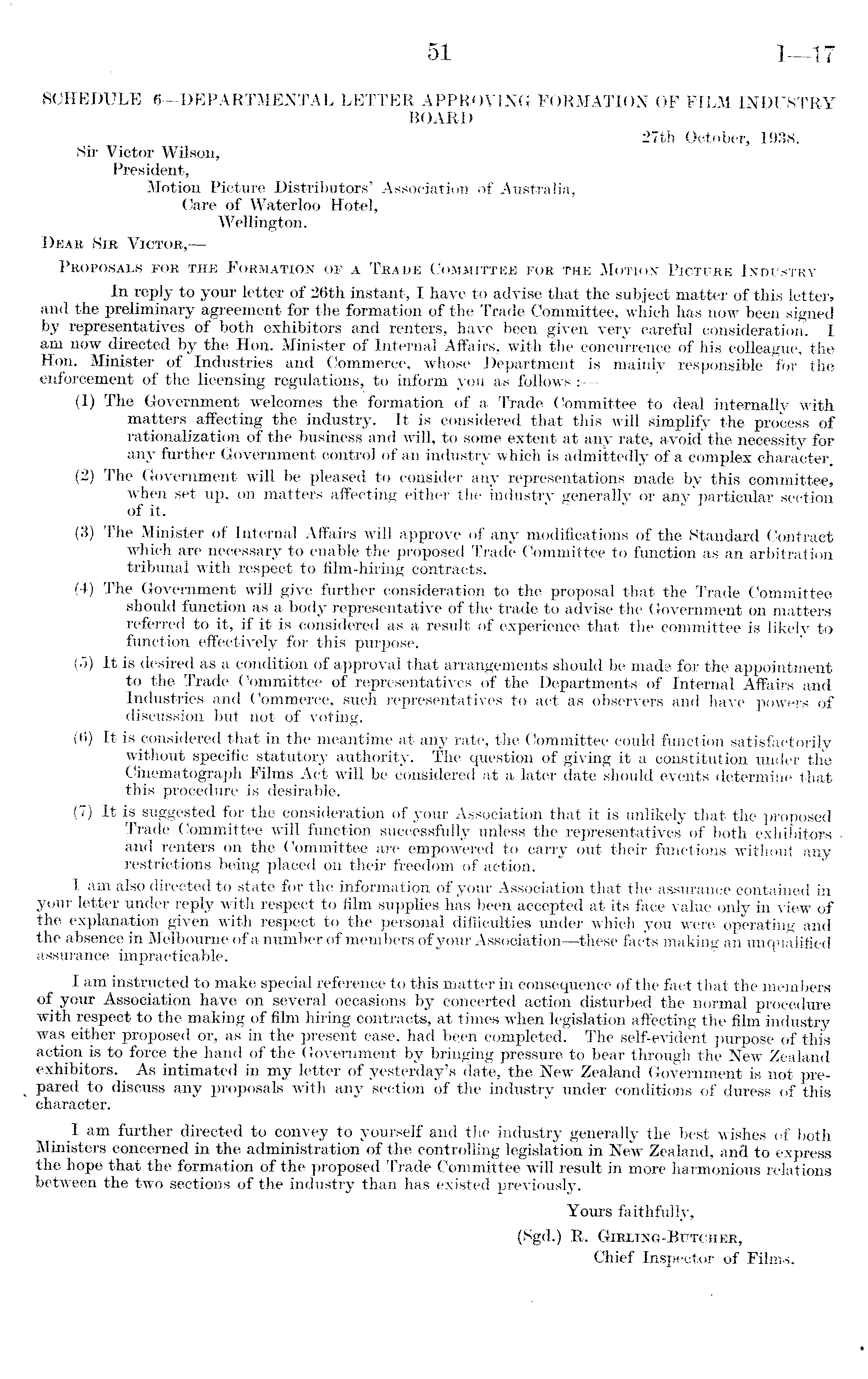 SCHEDULE 6—DEPARTMENTAL LETTER APPROVING FORMATION OF FILM INDUSTRY BOARD 27th October, 1938. Sir Victor Wilson, President, Motion Picture Distributors' Association of Australia, Care of Waterloo Hotel, Wellington. Dear Sir Victor, — Proposals for the Formation of a Trade Committee for the Motion Picture Industry In reply to your letter of 26th instant, I have to advise that the subject matter of this letter, and the preliminary agreement for the formation of the Trade Committee, which has now been signed by representatives of both exhibitors and renters, have been given very careful consideration. I am now directed by the Hon. Minister of Internal Affairs, with the concurrence of his colleague, the Hon. Minister of Industries and Commerce, whose Department is mainly responsible for the enforcement of the licensing regulations, to inform you as follows : (1) The Government welcomes the formation of a Trade Committee to deal internally with matters aiFecting the industry. It is considered that this will simplify the process of rationalization of the business and will, to some extent at any rate, avoid the necessity for any further Government control of an industry which is admittedly of a complex character. (2) The Government will be pleased to consider any representations made by this committee, when set up, on matters aiFecting either the industry generally or any particular section of it. (3) The Minister of Internal Affairs will approve of any modifications of the Standard Contract which are necessary to enable the proposed Trade Committee to function as an arbitration tribunal with respect to film-hiring contracts. (4) The Government will give further consideration to the proposal that the Trade Committee should function as a body representative of the trade to advise the Government on matters referred to it, if it is considered as a result of experience that the committee is likely to function effectively for this purpose. (5) It is desired as a condition of approval that arrangements should be made for the appointment to the Trade Committee of representatives of the Departments of Internal Affairs and Industries and Commerce, such representatives to act as observers and have powers of discussion but not of voting. (6) It is considered that in the meantime at any rate, the Committee could function satisfactorily without specific statutory authority. The question of giving it a constitution under the Cinematograph Films Act will be considered at a later date should events determine that this procedure is desirable. (7) It is suggested for the consideration of your Association that it is unlikely that the proposed Trade Committee will function successfully unless the representatives of both exhibitors and renters on the Committee are empowered to carry out their functions without any restrictions being placed on their freedom of action. I am also directed to state for the information of your Association that the assurance contained in your letter under reply with respect to film supplies has been accepted at its face value only in view of the explanation given with respect to the personal difficulties under which you were operating and the absence in Melbourne of a number of members of your Association —these facts making an unqualified assurance impracticable. I am instructed to make special reference to this matter in consequence of the fact that the members of your Association have on several occasions by concerted action disturbed the normal procedure with respect to the making of film hiring contracts, at times when legislation affecting the film industry was either proposed or, as in the present case, had been completed. The self-evident purpose of this action is to force the hand of the Government by bringing pressure to bear through the New Zealand exhibitors. As intimated in my letter of yesterday's date, the New Zealand Government is not prepared to discuss any proposals with any section of the industry under conditions of duress of this character. I am further directed to convey to yourself and the industry generally the best wishes of both Ministers concerned in the administration of the controlling legislation in New Zealand, and to express the hope that the formation of the proposed Trade Committee will result in more harmonious relations between the two sections of the industry than has existed previously. Yours faithfully, (Sgd.) R. Girling-Butcher, Chief Inspector of Films.