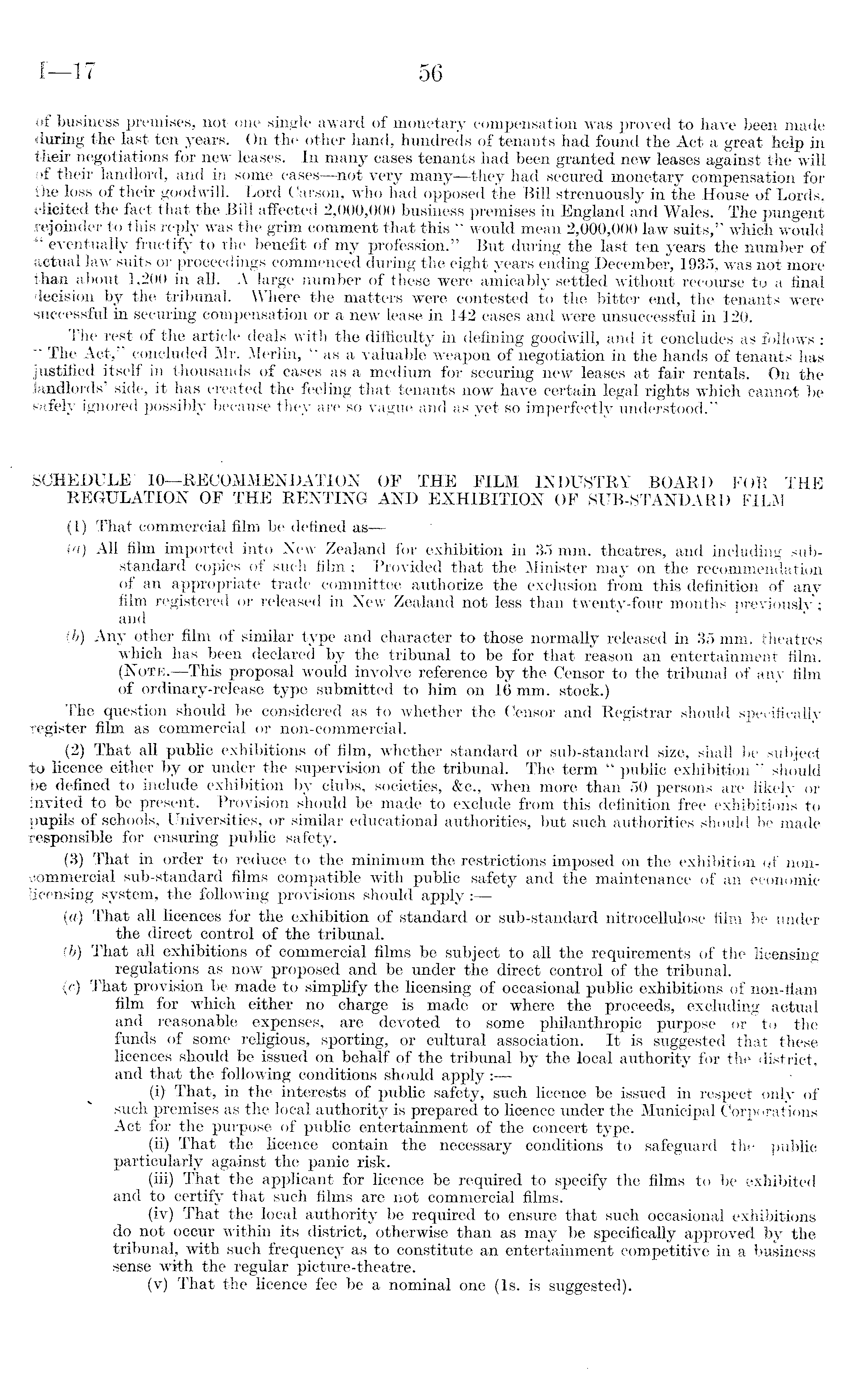 of business premises, not one single award of monetary compensation was proved to have been made during the last ten years. On the other hand, hundreds of tenants had found the Act a great help in their negotiations for new leases. In many cases tenants had been granted new leases against the will of their landlord, and in some cases—not very many—they had secured monetary compensation for the loss of their goodwill. Lord Carson, who had opposed the Bill strenuously in the House of Lords, elicited the fact that the Bill affected 2,000,000 business premises in England and Wales. The pungent rejoinder to this reply was the grim comment that this " would mean 2,000,000 law suits," which would *" eventually fructify to the benefit of my profession." But during the last ten years the number of actual law suits or proceedings commenced during the eight years ending December, 1935, was not more than about 1,200 in all. A large number of these were amicably settled without recourse to a final decision by the tribunal. Where the matters were contested to the bitter end, the tenants were successful in securing compensation or a new lease in 142 cases and were unsuccessful in 120. The rest of the article deals with the difficulty in defining goodwill, and it concludes as follows : The Act," concluded Mr. Merlin, "as a valuable weapon of negotiation in the hands of tenants has justified itself in thousands of cases as a medium for securing new leases at fair rentals. On the landlords' side, it has created the feeling that tenants now have certain legal rights which cannot be safely ignored possibly because they are so vague and as yet so imperfectly understood." SCHEDULE 10—RECOMMENDATION OF THE FILM INDUSTRY BOARD FOR THE REGULATION OF THE RENTING AND EXHIBITION OF SUB-STANDARD FILM (1) That commercial film be defined as—(a) All film imported into New Zealand for exhibition in 35 mm. theatres, and including substandard copies of such film ; Provided that the Minister may on the recommendation of an appropriate trade committee authorize the exclusion from this definition of any film registered or released in New Zealand not less than twenty-four months previouslv ; and {b) Any other film of similar type and character to those normally released in 35 mm. theatres which has been declared by the tribunal to be for that reason an entertainment film. (Note. —This proposal would involve reference by the Censor to the tribunal of any film of ordinary-release type submitted to him on 16 mm. stock.) The question should be considered as to whether the Censor and Registrar should specifically register film as commercial or non-commercial. (2) That all public exhibitions of film, whether standard or sub-standard size, shall be subject to licence either by or under the supervision of the tribunal. The term " public exhibition " should be defined to include exhibition by clubs, societies, &c., when more than 50 persons are likely or invited to be present. Provision should be made to exclude from this definition free exhibitions to pupils of schools, Universities, or similar educational authorities, but such authorities should be made responsible for ensuring public safety. (3) That in order to reduce to the minimum the restrictions imposed on the exhibition qf noncommercial sub-standard films compatible with public safety and the maintenance of an economic licensing system, the following provisions should apply:— (а) That all licences for the exhibition of standard or sub-standard nitrocellulose film be under the direct control of the tribunal. (б) That all exhibitions of commercial films be subject to all the requirements of the licensing regulations as now proposed and be under the direct control of the tribunal. (c) That provision be made to simplify the licensing of occasional public exhibitions of non-flam film for which either no charge is made or where the proceeds, excluding actual and reasonable expenses, are devoted to some philanthropic purpose or to the funds of some religious, sporting, or cultural association. It is suggested that these licences should be issued on behalf of the tribunal by the local authority for the district, and that the following conditions should apply : (i) That, in the interests of public safety, such licence be issued in respect only of such premises as the local authority is prepared to licence under the Municipal Corporations Act for the purpose of public entertainment of the concert type. (ii) That the licence contain the necessary conditions to safeguard the public particularly against the panic risk. (iii) That the applicant for licence be required to specify the films to be exhibited and to certify that such films are not commercial films. (iv) That the local authority be required to ensure that such occasional exhibitions do not occur within its district, otherwise than as may be specifically approved by the tribunal, with such frequency as to constitute an entertainment competitive in a business sense with the regular picture-theatre. (v) That the licence fee be a nominal one (Is. is suggested).