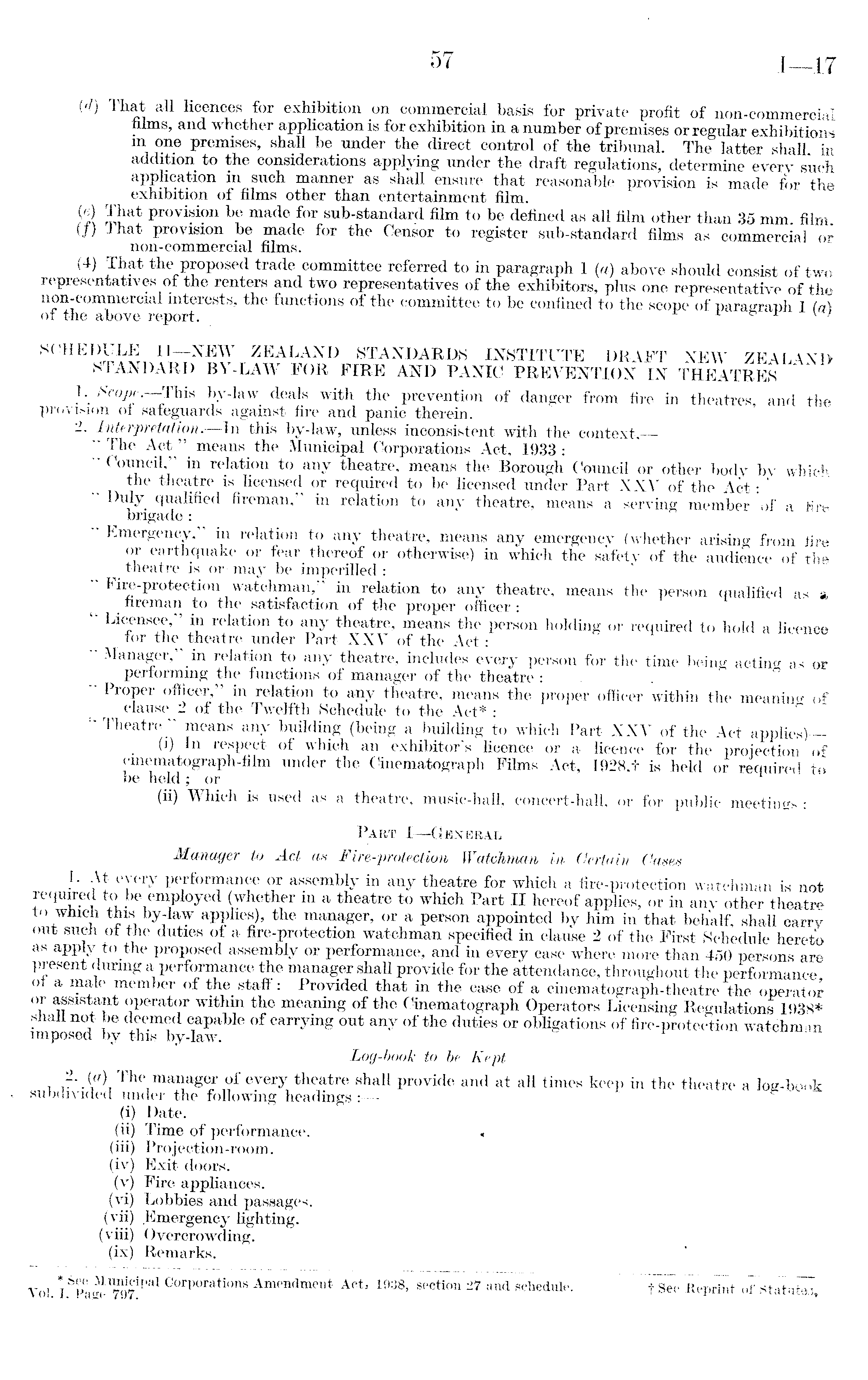(d) That all licences for exhibition on commercial basis for private profit of non-commercial films, and whether application is for exhibition in a number of premises or regular exhibitions m one premises, shall be under the direct control of the tribunal. The latter shall in addition to the considerations applying under the draft regulations, determine every such application m such manner as shall ensure that reasonable provision is made for the exhibition of films other than entertainment film. (e) That provision be made for sub-standard film to be defined as all film other than 35 mm film (/) lhat provision be made for the Censor to register sub-standard films as commercial or non-commercial films. (4) That the proposed trade committee referred to in paragraph 1 (a) above should consist of two representatives of the renters and two representatives of the exhibitors, plus one representative of the non-commercial interests, the functions of the committee to be confined to the scope of paragraph I (a) of the above report. r * 6 v ' SCHEDULE 11—NEW ZEALAND STANDARDS INSTITUTE DRAFT NEW ZEALAND STANDARD BY-LAW FOR FIRE AND PANIC PREVENTION IN THEATRES 1. Scope .—This by-law deals with the prevention of danger from fire in theatres, and the provision of safeguards against fire and panic therein. 2. Interpretation.—ln this by-law, unless inconsistent with the context, The Act " means the Municipal Corporations Act, 1933 : • Council" in relation to any theatre, means the Borough Council or other body by which « the theatre is licensed or required to be licensed under Part NXV of the Act • • Duly qualified fireman," in relation to any theatre, means a serving member of a fire brigade : Emergency," in relation to any theatre, means any emergency (whether arising from fire or earthquake or fear thereof or otherwise) in which the safety of the audience of the theatre is or - may be imperilled: " Fire-protection watchman," in relation to any theatre, means the person qualified as a nreman to the satisfaction of the proper officer : Licensee," in relation to any theatre, means the person holding or required to hold a licence for the theatre under Part XXV of the Act: " Manager," in relation to any theatre, includes every person for the time being acting as or performing the functions of manager of the theatre : " Proper officer," in relation to any theatre, means the proper officer within the meaning of clause 2 of the Twelfth Schedule to the Act* : Theatre " means any building (being a building to which Part XXV of the Act applies)— (i) In respect of which an exhibitor's licence or a licence for the projection of cmematograph-film under the Cinematograph Films Act, 1928,t is held or required to be held ; or (ii) Which is used as a theatre,, music-hall, concert-hall, or for public meetings : Part I—General Manager to A.ct as Fire-protection Watchman in Certain Gases I. At every performance or assembly in any theatre for which a fire-protection watchman is not required to be employed (whether in a theatre to which Part II hereof applies, or in any other theatre to wnich this by-law applies), the manager, or a person appointed by him in that behalf, shall carrv out such of the duties of a fire-protection watchman specified in clause 2 of the First Schedule hereto as apply to the proposed assembly or performance, and in every case where more than 450 persons are present during a performance the manager shall provide for the attendance, throughout the performance oi a male member of the_ staff: Provided that in the case of a cinematograph-theatre the operator or assistant operator within the meaning of the Cinematograph Operators Licensing Regulations 1938* shall not be deemed capable of carrying out any of the duties or obligations of fire-protection watchman imposed by this by-law. Log-book to be Kept , . { a \ The manager of every theatre shall provide and at all times keep in the theatre a log-book subdivided under the following headings : 6 (i) Date. (ii) Time of performance. > (iii) Projection-room. (iv) Exit doors. (v) Fire appliances. (vi) Lobbies and passages. (vii) Emergency lighting. (viii) Overcrowding. (ix) Remarks. s