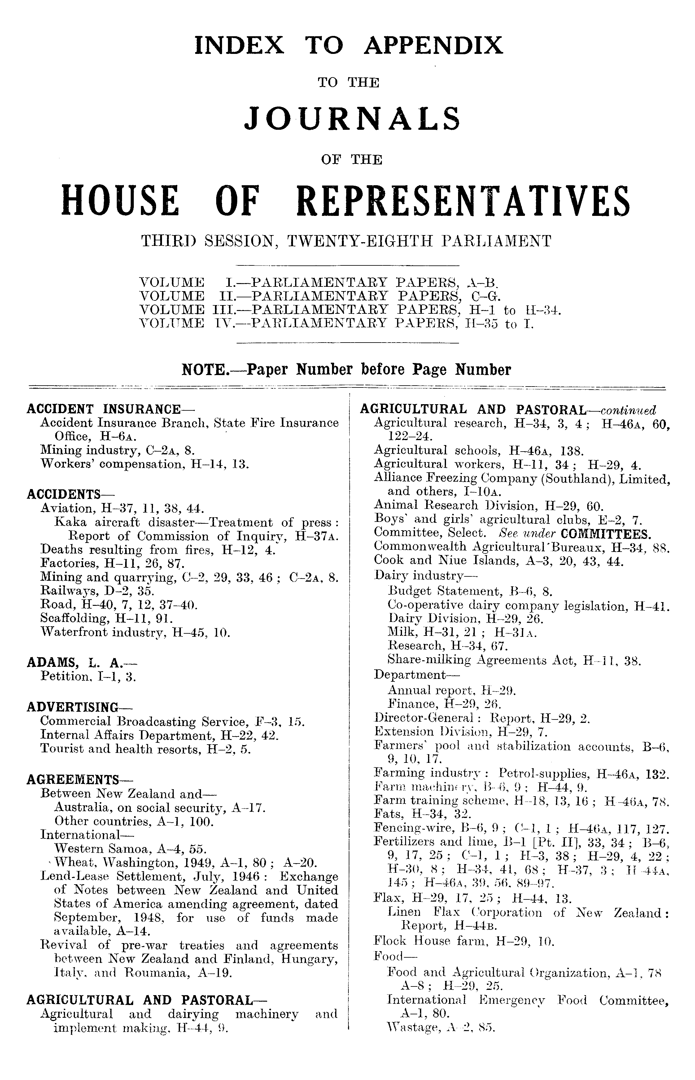 ACCIDENT INSURANCE— Accident Insurance Branch, State Fire Insurance Office, H-6a. Mining industry, C-2a, 8. Workers' compensation, H-14, 13. ACCIDENTS— Aviation, H-37, 11, 38, 44. Kaka aircraft disaster—Treatment of press : Report of Commission of Inquiry, H-37 a. Deaths resulting from fires, H-12, 4. Factories, H-11, 26, 87. Mining and quarrying, C-2, 29, 33, 46 ; C-2a, 8. Railways, D-2, 35. Road, H-40, 7, 12, 37-40. Scaffolding, H-11, 91. Waterfront industry, H-45, 10. ADAMS, L. A. Petition, 1-1, 3. ADVERTISING— Commercial Broadcasting Service, F-3, 15. Internal Affairs Department, H-22, 42. Tourist and health resorts, H-2, 5. AGREEMENTS— Between New Zealand and— Australia, on social security, A-17. Other countries, A-l, 100. International— Western Samoa, A-4, 55. -Wheat, Washington, 1949, A-l, 80 ; A-20. Lend-Lease Settlement, July, 1946 : Exchange of Notes between New Zealand and United States of America amending agreement, dated September, 1948, for use of funds made available, A—l 4. Revival of pre-war treaties and agreements between New Zealand and Finland, Hungary, Italy, and Roumania, A-l 9. AGRICULTURAL AND PASTORAL— Agricultural and dairying machinery and implement making, H-44, 9.