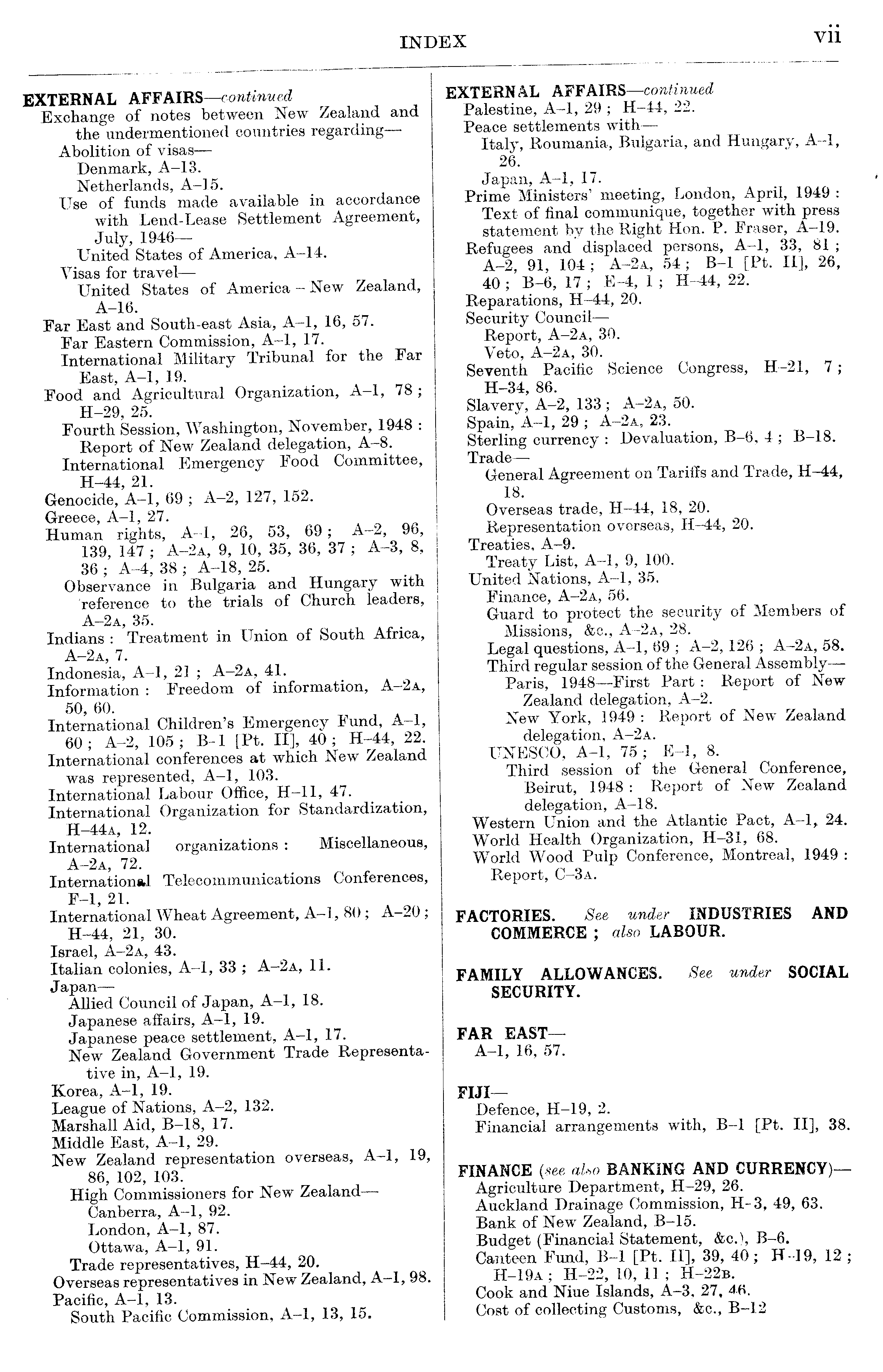 EXTERNAL AFFAIRS —continued Palestine, A-l, 29 ; H-44, 22. Peace settlements with— Italy, Roumania, Bulgaria, and Hungary, A-l, 26. Japan, A-l, 17. Prime Ministers' meeting, London, April, 1949 : Text of final communique, together with press statement by the Right Hon. P. Fraser, A-19. Refugees and displaced persons, A-l, 33, 81 ; A-2, 91, 104; A-2a, 54; B-l [Pt. ll], 26, 40 ; B-6, 17 ; E-4, 1 ; H-44, 22. Reparations, H-44, 20. Security Council — Report, A-2a, 30. Veto, A—2a, 30. Seventh Pacific Science Congress, H-21, 7; H-34, 86. Slavery, A-2, 133 ; A-2a, 50. Spain, A-l, 29 ; A—2a, 23. Sterling currency : Devaluation, B-6, 4 ; B—lB. Trade — General Agreement on Tariffs and Trade, H-44, 18. Overseas trade, H-44, 18, 20. Representation overseas, H-44, 20. Treaties, A-9. Treaty List, A-l, 9, 100. United Nations, A-l, 35. Finance, A-2 a, 56. Guard to protect the security of Members of Missions, &c., A-2a, 28. Legal questions, A-l, 69 ; A-2, 126 ; A-2a, 58. Third regular session of the General Assembly— Paris, 1948 —First Part: Report of New Zealand delegation, A-2. New York, 1949 : Report of New Zealand delegation, A-2a. UNESCO, A-l, 75 ; E-l, 8. Third session of the General Conference, Beirut, 1948 : Report of New Zealand delegation, A-l 8. Western Union and the Atlantic Pact, A-l, 24. World Health Organization, H-31, 68. World Wood Pulp Conference, Montreal, 1949 : Report, C-3a. FACTORIES. See under INDUSTRIES AND COMMERCE ; also LABOUR. FAMILY ALLOWANCES. See under SOCIAL SECURITY. FAR EAST— A-l, 16, 57. FIJI— Defence, H-19, 2. Financial arrangements with, B-l [Pt. ll], 38. FINANCE (see aha BANKING AND CURRENCY)— Agriculture Department, H-29, 26. Auckland Drainage Commission, H-3, 49, 63. Bank of New Zealand, B-15. Budget (Financial Statement, &e.), B-6. Canteen Fund, B-l [Pt. ll], 39, 40; H 19, 12 ; H-19a ; H-22, 10, 11 ; H-228. Cook and Niue Islands, A-3, 27, 46, Cost of collecting Customs, &c., B-12