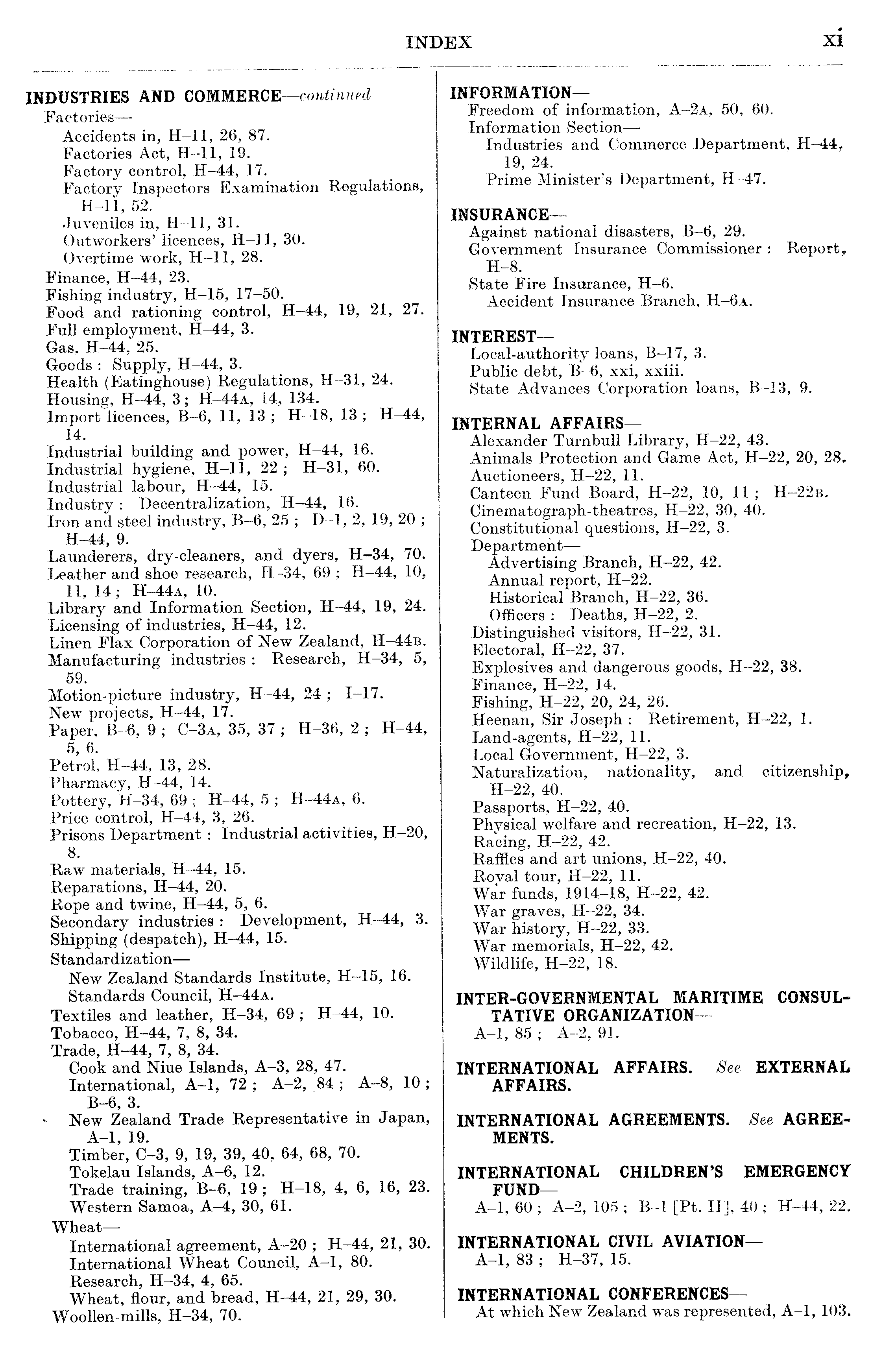 INFORMATION— Freedom of information, A-2a, 50, 60. Information SectionIndustries and Commerce Department, H-44, 19, 24. Prime Minister's Department, H—47. INSURANCE— Against national disasters, B-6, 29. Government Insurance Commissioner : Report, H-8. State Fire Insurance, H-6. Accident Insurance Branch, H—6a. INTEREST— Local-authority loans, B-17, 3. Public debt, B-6, xxi, xxiii. State Advances Corporation loans, B-13, 9. INTERNAL AFFAIRS— Alexander Turnbull Library, H-22, 43. Animals Protection and Game Act, H-22, 20, 28. Auctioneers, H-22, 11. Canteen Fund Board, H-22, 10, 11 ; H-22b. Cinematograph-theatres, H-22, 30, 40. Constitutional questions, H-22, 3. Department —• Advertising Branch, H-22, 42. Annual report, H-22. Historical Branch, H-22, 36. Officers : Deaths, H—22, 2. Distinguished visitors, H-22, 31. Electoral, H-22, 37. Explosives and dangerous goods, H-22, 38. Finance, H-22, 14. Fishing, H-22, 20, 24, 26. Heenan, Sir Joseph : Retirement, H-22, 1. Land-agents, H-22, 11. Local Government, H-22, 3. Naturalization, nationality, and citizenship, H-22, 40. Passports, H-22, 40. Physical welfare and recreation, H-22, 13. Racing, H-22, 42. Raffles and art unions, H-22, 40. Royal tour, H-22, 11. War funds, 1914-18, H-22, 42. War graves, H-22, 34. War history, H-22, 33. War memorials, H-22, 42. Wildlife, H-22, 18. INTER-GOVERNMENTAL MARITIME CONSULTATIVE ORGANIZATION— A-l, 85 ; A-2, 91. INTERNATIONAL AFFAIRS. See EXTERNAL AFFAIRS. INTERNATIONAL AGREEMENTS. See AGREEMENTS. INTERNATIONAL CHILDREN'S EMERGENCY FUND— A-l, 60 ; A-2, 105 ; B-l [Pt. ll], 40 ; H-44, 22. INTERNATIONAL CIVIL AVIATION— A-l, 83 ; H-37, 15. INTERNATIONAL CONFERENCES— At which New Zealand was represented, A-l, 103.