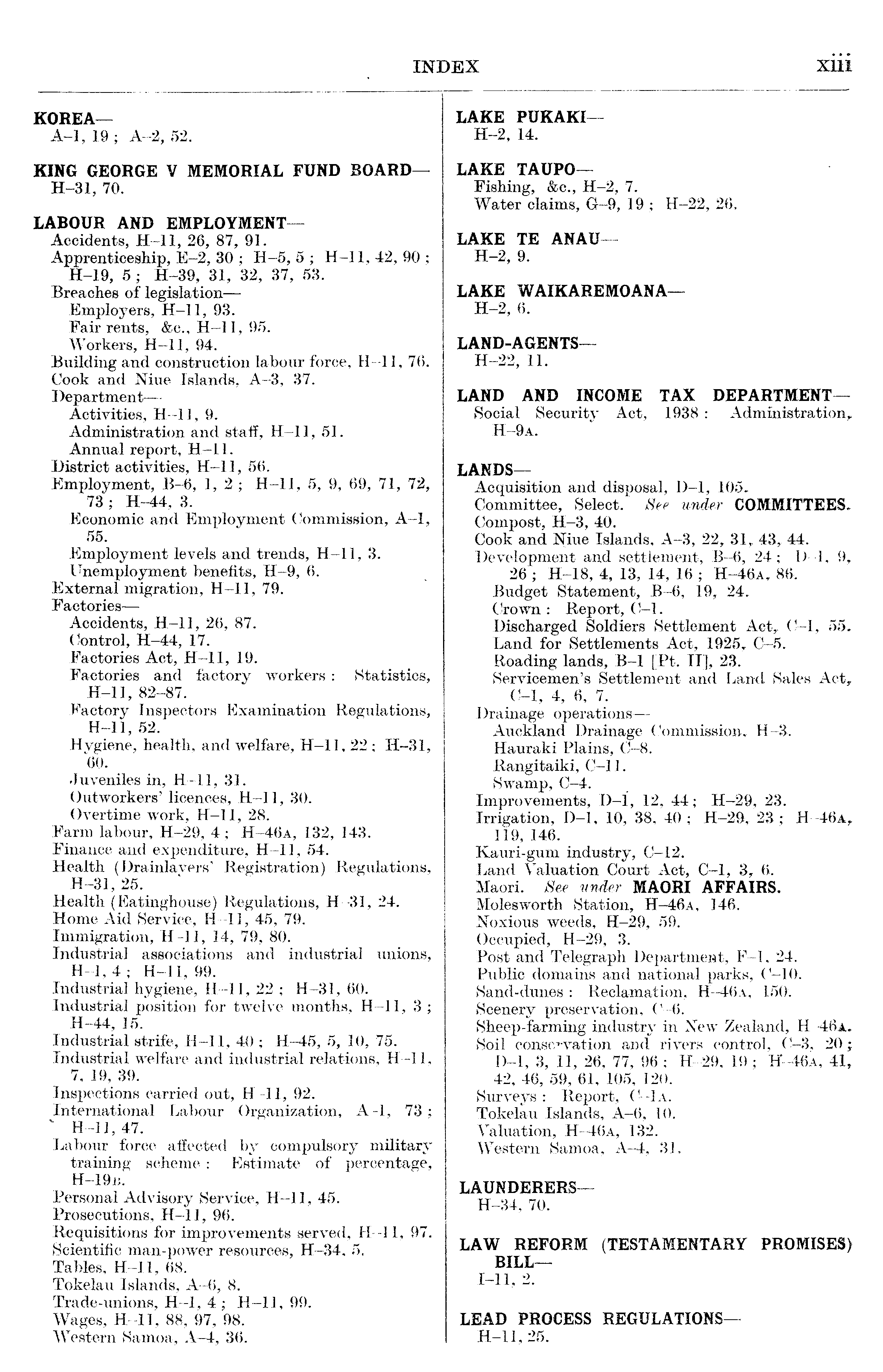 LAKE PUKAKI— H-2, 14. LAKE TAUPO — Fishing, &c., H-2, 7. Water claims, G-9, 19 ; H-22, 26. LAKE TE ANAU— H-2, 9. LAKE WAIKAREMOANA — H-2, 6. LAND-AGENTS— H-22, 11. LAND AND INCOME TAX DEPARTMENT— Social Security Act, 1938 : Administration, H-9a. LANDS— Acquisition and disposal, D-l, 105. Committee, Select. See under COMMITTEES. Compost, H-3, 40. Cook and Niue Islands, A-3, 22, 31, 43, 44. Development and settlement, B-6, 24; I>-1, 9, 26 ; H-18, 4, 13, 14, 16 ; H-46a, 86, Budget Statement, B-6, 19, 24. Crown : Report, C-l. Discharged Soldiers Settlement Act, C-l, 55. Land for Settlements Act, 1925, C—s, Roading lands, B-l [Pt. ll], 23. Servicemen's Settlement and Land Sales Act, C-l, 4, 6, 7. Drainage operations— Auckland Drainage Commission, H-3. Hauraki Plains, C-8. Rangitaiki, C-11. Swamp, C-4. Improvements, D-l, 12, 44; H—29, 23. Irrigation, D-l, 10, 38, 40 ; H-29, 23 ; H-46a, 119, 146. Kauri-gum industry, C—l2. Land Valuation Court Act, C-l, 3, 6. Maori. See under MAORI AFFAIRS. Molesworth Station, H-46a, 146. Noxious weeds, H-29, 59. Occupied, H-29, 3. Post and Telegraph Department, F—l, 24. Public domains and national parks, C—lo. Sand-dunes: Reclamation, H—46a, 150'. Scenery preservation, C-6. Sheep-farming industry in New Zealand, H-46a. Soil conservation and rivers control, C—3, 20; D-l, 3, 11, 26; 77, 96 ; H-29, 19 ; H-46a, 41, 42, 46, 59, 61, 105, 120. Surveys : Report, C-l a. Tokelau Islands, A-6, 10. Valuation, H-46a, 132. Western Samoa, A-4, 31. LAUNDERERS— H-34, 70. LAW REFORM (TESTAMENTARY PROMISES) BILL—--1-11, 2. LEAD PROCESS REGULATIONS— H-11, 25.