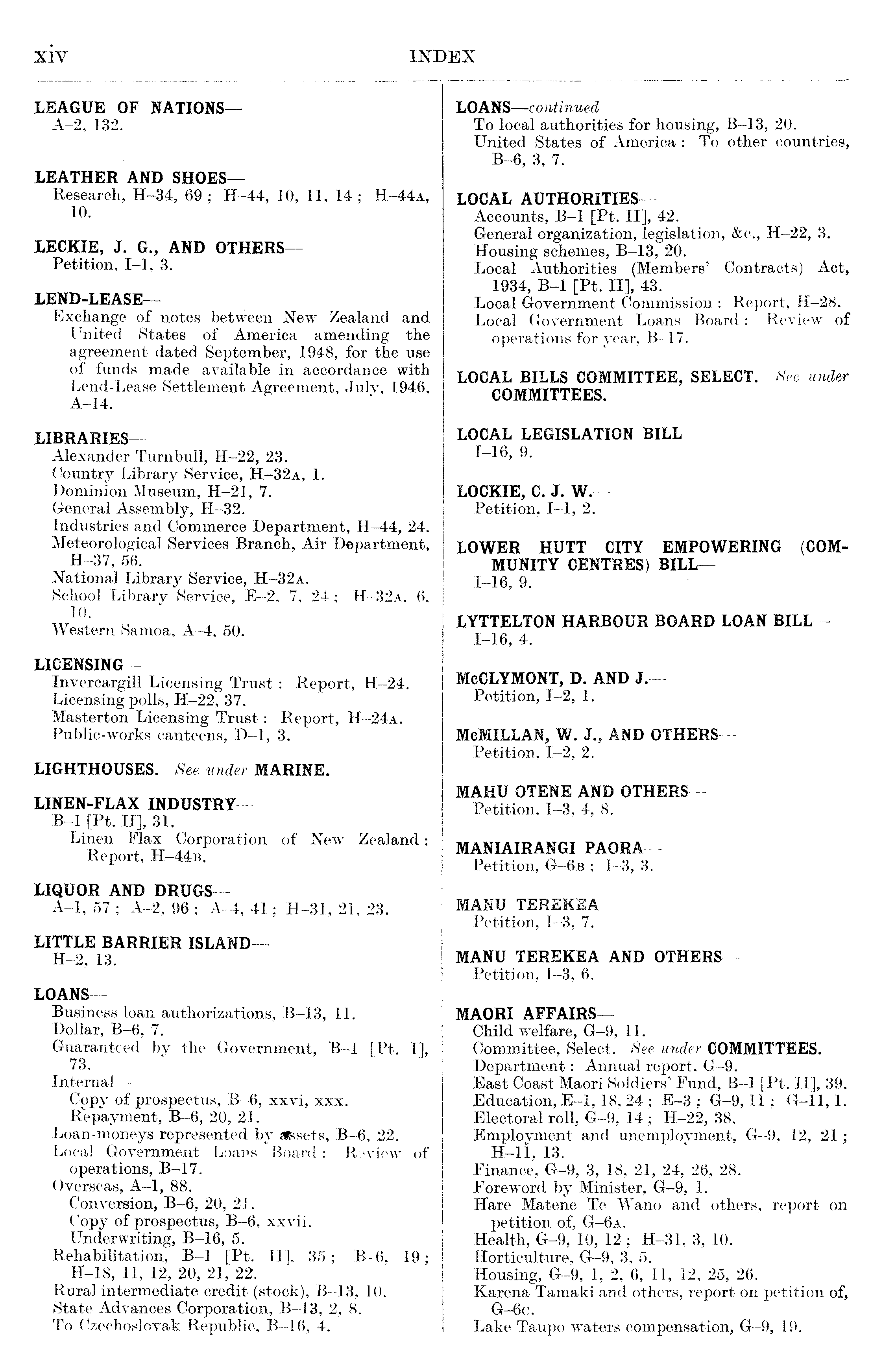LEAGUE OF NATIONS— A-2, 132. LEATHER AND SHOES— Research, H-34, 69 ; H-44, 10, 11, 14 ; H-44a, 10. LECKIE, J. G., AND OTHERS— Petition, 1-1, 3. LEND-LEASE— Exchange of notes between New Zealand and United States of America amending the agreement dated September, 1948, for the use of funds made available in accordance with Lend-Lease Settlement Agreement, July, 1946, A-14. LIBRARIES— Alexander Turnbull, H-22, 23. Country Library Service, H-32a, 1. Dominion Museum, H-21, 7. General Assembly, H-32. Industries and Commerce Department, H-44, 24. Meteorological Services Branch, Air Department, H-37, 56. National Library Service, H-32a. School Library Service, E-2, 7, 24; H-32a, 6, 10. Western Samoa, A-4, 50. LICENSING— Invercargill Licensing Trust : Report, H-24. Licensing polls, H-22, 37. Masterton Licensing Trust: Report, H-24a. Public-works canteens, D-l, 3. LIGHTHOUSES. See under MARINE. LINEN-FLAX INDUSTRY— B-l [Pt. ll], 31. Linen Flax Corporation of New Zealand: Report, H-44b. LIQUOR AND DRUGS— A-l, 57 ; A-2, 96 ; A-4, 41; H-31, 21, 23. LITTLE BARRIER ISLAND— H-2, 13. LOANS— Business loan authorizations, B-13, 11. Dollar, B-6, 7. Guaranteed by the Government, B-l [Pt. I], 73. Internal— Copy of prospectus, B-6, xxvi, xxx. Repayment, B-6, 20, 21. Loan-moneys represented by assets, B-6, 22. Local Government Loans Board : Review of operations, B-17. Overseas, A-l, 88. Conversion, B-6, 20, 21. Copy of prospectus, B-6, xxvii. Underwriting, B-l 6, 5. Rehabilitation, B-l [Pt. ll], 35; B-6, 19; H-18, 11, 12, 20, 21, 22. Rural intermediate credit (stock), B-13, 10. State Advances Corporation, B-13, 2, 8. To Czechoslovak Republic, B-16, 4.