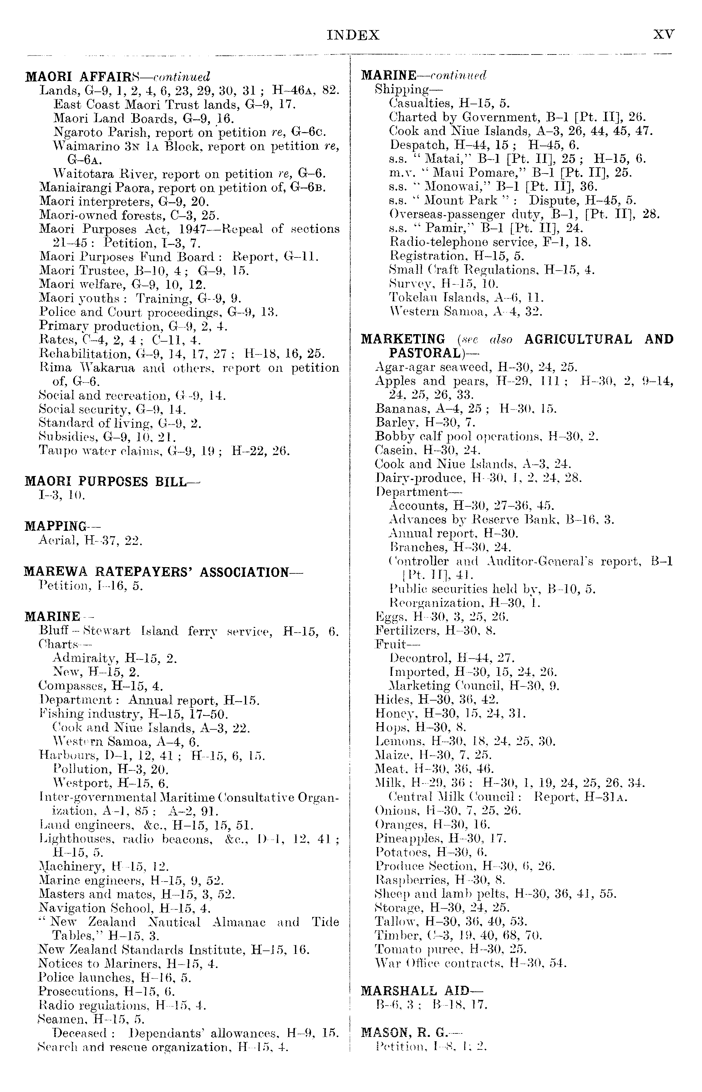 MAORI AFFAlRS—continued Lands, G-9, 1, 2, 4, 6, 23, 29, 30, 31 ; H-46a, 82. East Coast Maori Trust lands, G-9, 17. Maori Land Boards, G-9, 16. Ngaroto Parish, report on petition re, G-6c. Waimarino 3n Ia Block, report on petition re, G-6a. Waitotara River, report on petition re, G-6. Maniairangi Paora, report on petition of, G-6b. Maori interpreters, G-9, 20. Maori-owned forests, C-3, 25. Maori Purposes Act, 1947—Repeal of sections 21-45 : Petition, 1-3, 7. Maori Purposes Fund Board : Report, G-11. Maori Trustee, B-10, 4 ; G-9, 15. Maori welfare, G-9, 10, 12. Maori youths : Training, G-9, 9. Police and Court proceedings, G-9, 13. Primary production, G-9, 2, 4. Rates, C-4, 2, 4; C-11, 4. Rehabilitation, G-9, 14, 17, 27 ; H-18, 16, 25. Rima Wakarua and others, report on petition of, G-6. Social and recreation, G-9, 14. Social security, G-9, 14. Standard of living, G-9, 2. Subsidies, G-9, 10, 21. Taupo water claims, G-9, 19 ; H-22, 26. MAORI PURPOSES BILL—-1-3, 10. MAPPING— Aerial, H-37, 22. MAREWA RATEPAYERS' ASSOCIATION— Petition, 1-16, 5. MARINE— Bluff - Stewart Island ferry service, H-15, 6. Charts — Admiralty, H-15, 2. New, H-15, 2. Compasses, H-15, 4. Department: Annual report, H-15. Fishing industry, H-15, 17-50. Cook and Niue Islands, A-3, 22. Western Samoa, A-4, 6. Harbours, D-l, 12, 41 ; H-15, 6, 15. Pollution, H-3, 20. Westport, H-15, 6. Inter-governmental Maritime Consultative Organization, A-l, 85 : A-2, 91. Land engineers, &c., H-15, 15, 51. Lighthouses, radio beacons, &c., D-l, 12, 41 ; H-15, 5. Machinery, H-15, 12. Marine engineers, H-15, 9, 52. Masters and mates, H-15, 3, 52. Navigation School, H-15, 4. " New Zealand Nautical Almanac and Tide Tables," H-15, 3. New Zealand Standards Institute, H-15, 16. Notices to Mariners, H-15, 4. Police launches, H-16, 5. Prosecutions, H-15, 6. Radio regulations, H-15, 4. Seamen, H-15, 5. Deceased : Dependants' allowances, H-9, 15. Search and rescue organization, H-15, 4.