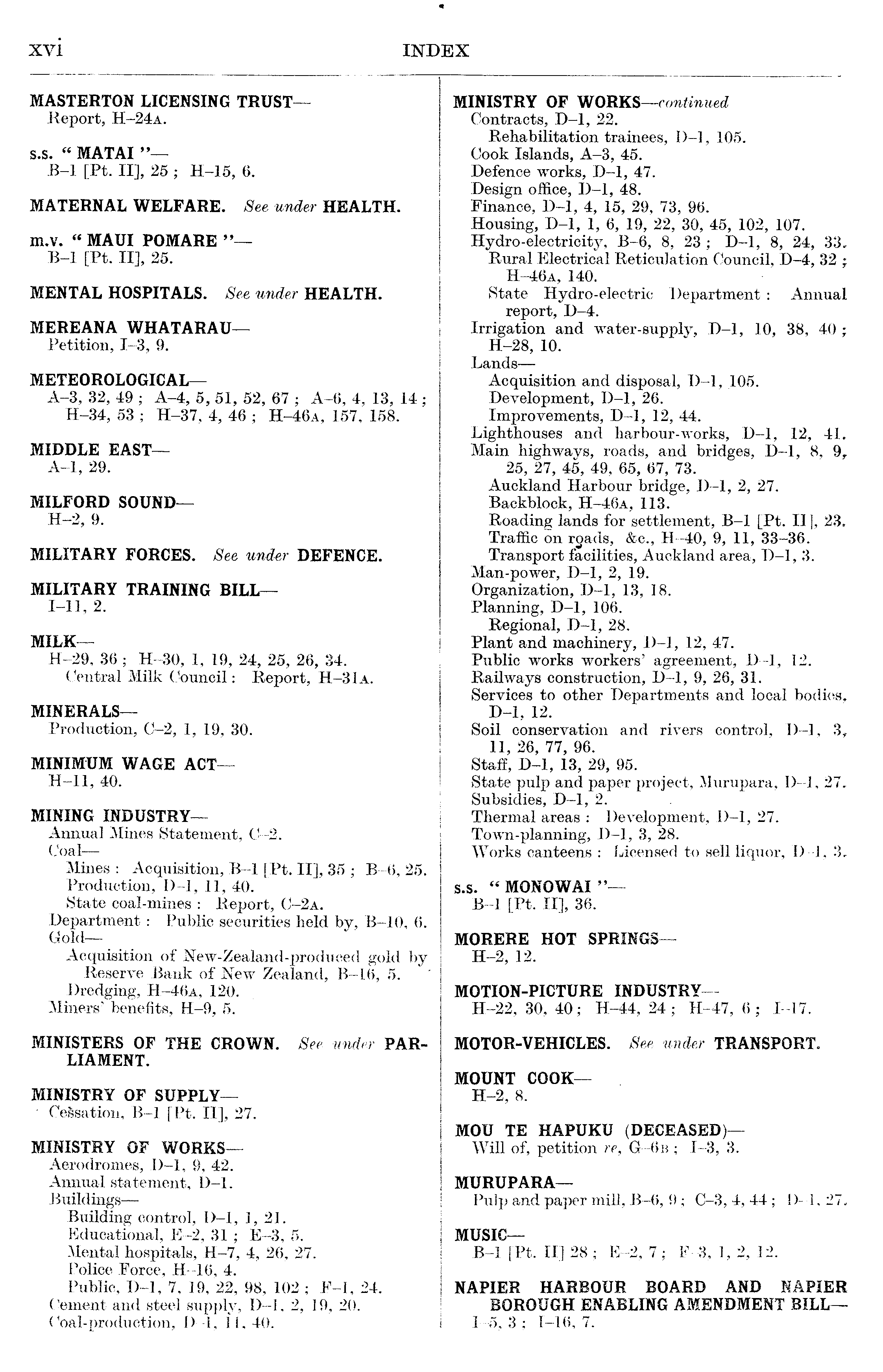 MINISTRY OF WORKS —continued Contracts, D-l, 22. Rehabilitation trainees, D-l, 105.Cook Islands, A-3, 45. Defence works, D-l, 47. Design office, D-l, 48. Finance, D-l, 4, 15, 29, 73, 96. Housing, D-l, 1, 6, 19, 22, 30, 45, 102, 107. Hydro-electricitjr, B-6, 8, 23 ; D-l, 8, 24, 33. Rural Electrical Reticulation Council, D-4, 32 • H-46a, 140. State Hydro-electric Department : Annual report, D-4. Irrigation and water-supply, D-l, 10, 38, 40 ; H-28, 10. Lands— Acquisition and disposal, D-l, 105. Development, D-l, 26. Improvements, D-l, 12, 44. Lighthouses and harbour-works, D-l, 12, 41. Main highways, roads, and bridges, D-l, 8, 9 r 25, 27, 45, 49, 65, 67, 73. Auckland Harbour bridge, D-l, 2, 27. Backblock, H-46a, 113. Roading lands for settlement, B-l [Pt. ll], 23. Traffic on rgads, &c„ H-40, 9, 11, 33-36. Transport facilities, Auckland area, D-l, 3. Man-power, D-l, 2, 19. Organization, D-l, 13, 18. Planning, D-l, 106. Regional, D-l, 28. Plant and machinery, D-l, 12, 47. Public works workers' agreement, D-l, 12. Railways construction, D-l, 9, 26, 31. Services to other Departments and local bodies, D-l, 12. Soil conservation and rivers control, D-l, 3, 11, 26, 77, 96. Staff, D-l, 13, 29, 95. State pulp and paper project, Murupara, D-l, 27. Subsidies, D-l, 2. Thermal areas : Development, D-l, 27. Town-planning, D-l, 3, 28. Works canteens : Licensed to sell liquor, D-l, 3. s.s. " MONOWAI " B-l [Pt. ll], 36. MORERE HOT SPRINGS— H-2, 12. MOTION-PICTURE INDUSTRY— H-22, 30, 40 • H-44, 24 ; H-47, 6 ; 1-17. MOTOR-VEHICLES. See under TRANSPORT. MOUNT COOK— H-2, 8. MOU TE HAPUKU (DECEASED)— Will of, petition re, G-6b ; 1-3, 3. MURUPARA— Pulp and paper mill, B-6, 9; C-3, 4, 44 ; D-l, 27. MUSIC— B-l [Pt. ll] 28 ; E-2, 7; F-3, 1, 2, 12. NAPIER HARBOUR BOARD AND NAPIER BOROUGH ENABLING AMENDMENT BILL—-1-5, 3 ; 1-16, 7.