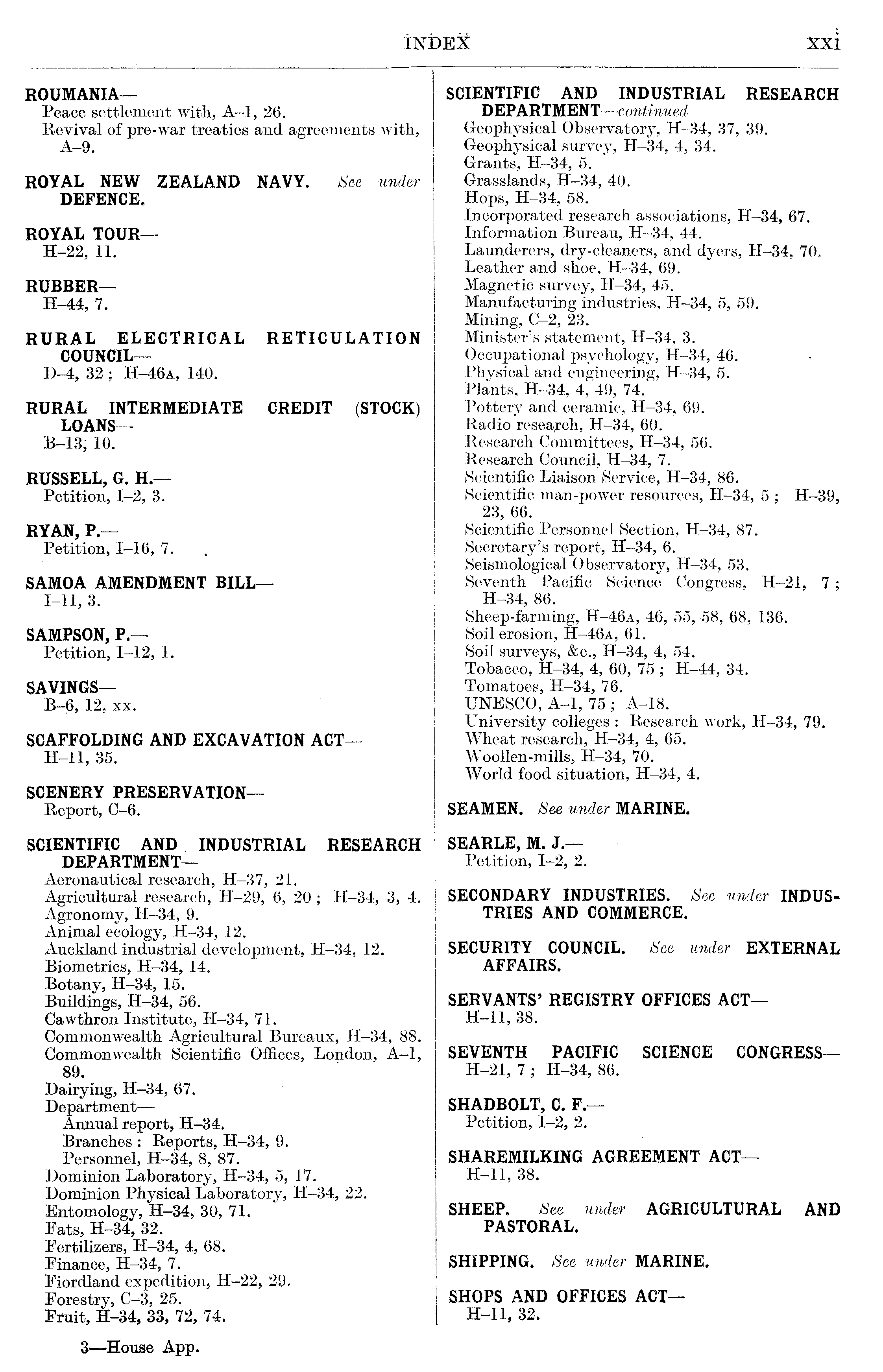 ROUMANIA— Peace settlement with, A-l, 26. Revival of pre-war treaties and agreements with, A-9. ROYAL NEW ZEALAND NAVY. See under DEFENCE. ROYAL TOUR— H-22, 11. RUBBER— H-44, 7. RURAL ELECTRICAL RETICULATION COUNCIL— D-4, 32 ; H-46a, 140. RURAL INTERMEDIATE CREDIT (STOCK) LOANS—--33-13, 10. RUSSELL, G. H.— Petition, 1-2, 3. RYAN, P.— Petition, 1-16, 7. SAMOA AMENDMENT BILL—--1-11, 3. SAMPSON, P.— Petition, 1-12, 1. SAVINGS— B-6, 12, xx. SCAFFOLDING AND EXCAVATION ACT— H-11, 35. SCENERY PRESERVATION— Report, C-6. SCIENTIFIC AND INDUSTRIAL RESEARCH DEPARTMENT— Aeronautical research, H-37, 21. Agricultural research, H-29, 6, 20; H-34, 3, 4. Agronomy, H-34, 9. Animal ecology, H-34, 12. Auckland industrial development, H-34, 12. Biometrics, H-34, 14. Botany, H-34, 15. Buildings, H-34, 56. Cawthron Institute, H-34, 71. Commonwealth Agricultural Bureaux, H-34, 88. Commonwealth Scientific Offices, London, A—l, 89 Dairying, H-34, 67. Department— Annual report, H-34. Branches : Reports, H-34, 9. Personnel, H-34, 8, 87. Dominion Laboratory, H-34, 5, 17. Dominion Physical Laboratory, H-34, 22. Entomology, H-34, 30, 71. Pats, H-34, 32. Fertilizers, H-34, 4, 68. Finance, H-34, 7. Fiordland expedition, H-22, 29. Forestry, C-3, 25. Fruit, H-34, 33, 72, 74.