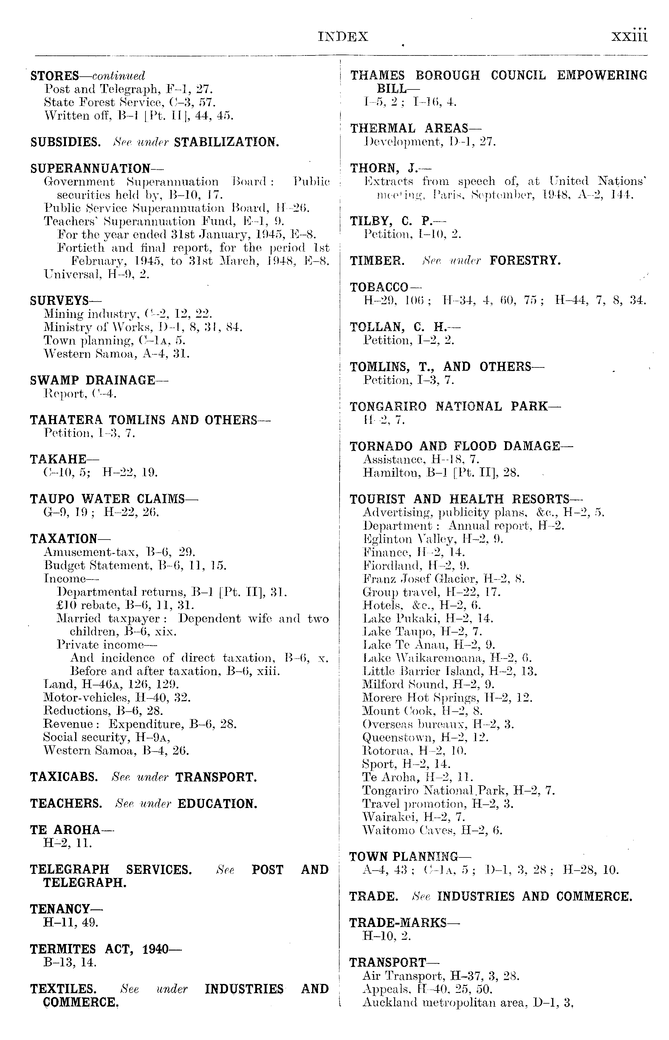 STORES —continued Post and Telegraph, F-l, 27. State Forest Service, C-3, 57. Written off, B-l [Pt. ll], 44, 45. SUBSIDIES. See under STABILIZATION. SUPERANNUATION— Government Superannuation Board : Public securities held by, B-10, 17. Public Service Superannuation Board, H-26. Teachers' Superannuation Fund, E-l, 9. For the year ended 31st January, 1945, E-8. Fortieth and final report, for the period Ist February, 1945, to 31st March, 1948, E-8. Universal, H-9, 2. SURVEYS— Mining industry, C-2, 12, 22. Ministry of Works, D-l, 8, 31, 84. Town planning, C-la, 5. Western Samoa, A-4, 31. SWAMP DRAINAGE— Report, C-4. TAHATERA TOMLINS AND OTHERS— Petition, 1-3, 7. TAKAHE — C-10, 5; H-22, 19. TAUPO WATER CLAIMS— G-9, 19 ; H-22, 26. TAXATION— Amusement-tax, B-6, 29. Budget Statement, B-6, 11, 15. Income — Departmental returns, B-l [Pt. ll], 31. £lO rebate, B-6, 11, 31. Married taxpayer : Dependent wife and two children, B-6, xix. Private income— And incidence of direct taxation, B-6, x. Before and after taxation, B-6, xiii. Land, H-46a, 126, 129. Motor-vehicles, H-40, 32. Reductions, B-6, 28, Revenue : Expenditure, B-6, 28. Social security, H-9a, Western Samoa, B-4, 26. TAXICABS. See under TRANSPORT. TEACHERS. See under EDUCATION. TE AROHA— H-2, 11. TELEGRAPH SERVICES. See POST AND TELEGRAPH. TENANCY— H-11, 49. TERMITES ACT, 1940 B-13, 14. TEXTILES. See under INDUSTRIES AND COMMERCE.