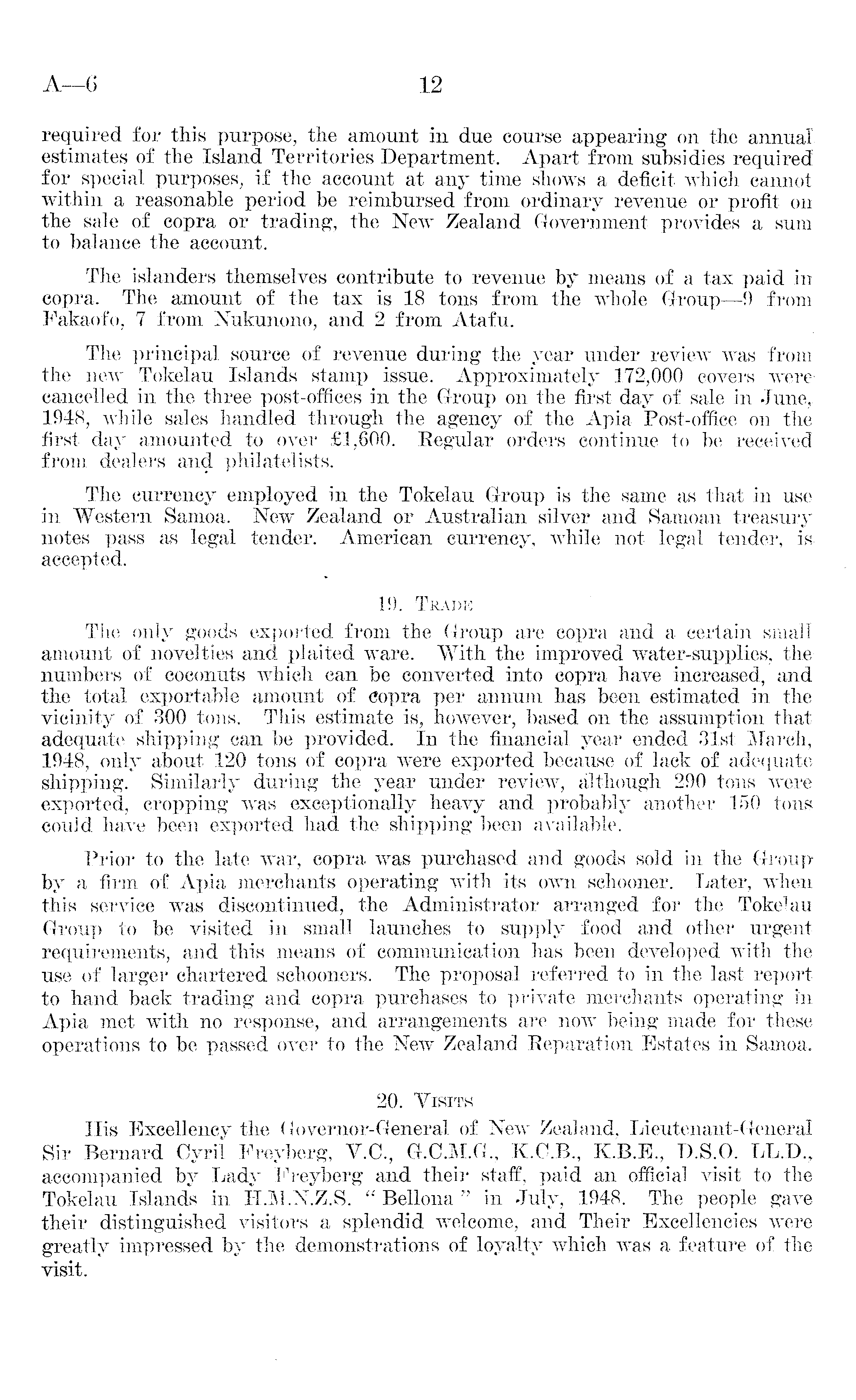 required for this purpose, the amount in due course appearing on the annual estimates of the Island Territories Department. Apart from subsidies required for special purposes, if the account at any time shows a deficit which cannot within a reasonable period be reimbursed from ordinary revenue or profit on the sale of copra or trading, the New Zealand Government provides a sum to balance the account. The islanders themselves contribute to revenue by means of a tax paid in copra. The amount of the tax is 18 tons from the whole G-roup—9 from. Fakaofo, 7 from Nukunono, and 2 from Atafu. The principal source of revenue during the year under review was from the new Tokelau Islands stamp issue. Approximately 172,000 covers were cancelled in the three post-offices in the Group on the first day of sale in June r 1948, while sales handled through the agency of the Apia Post-office on the first day amounted to over £1,600. Regular orders continue to be received from dealers and philatelists. The currency employed in the Tokelau Group is the same as that in use in Western Samoa. New Zealand or Australian silver and Samoan treasury notes pass as legal tender. American currency, while not legal tender, isaccepted. 19. Trade The only goods exported from the Group are copra and a certain small amount of novelties and plaited ware. With the improved water-supplies, the numbers of coconuts which can be converted into copra have increased, and the total exportable amount of Copra per annum has been estimated in the vicinity of 300 tons. This estimate is, however, based on the assumption that adequate shipping can be provided. In the financial year ended 31st March, 1948, only about 120 tons of copra were exported because of lack of adequate shipping. Similarly during the year under review, although 290 tons were exported, cropping was exceptionally heavy and probably another 150 tons could have been exported had the shipping been available. Prior to the late war, copra was purchased and goods sold in the Group by a firm of Apia merchants operating with its own schooner. Later, when this service was discontinued, the Administrator arranged for the Tokelau Group to be visited in small launches to supply food and other urgent requirements, and this means of communication has been developed with the use of larger chartered schooners. The proposal referred to in the last report to hand back trading and copra purchases to private merchants operating in Apia met with no response, and arrangements are now being made for these operations to be passed over to the New Zealand Reparation Estates in Samoa. v 20. Visits His Excellency the Governor-General of New Zealand, Lieutenant-General Sir Bernard Cyril Freyberg, Y.C., G.C.M.G., K.C.8., K.8.E., D.S.O. LL.D., accompanied by Lady Freyberg and their staff, paid an official visit to the Tokelau Islands in H.M.N.Z.S. " Bellona" in July, 1948. The people gave their distinguished visitors a splendid welcome, and Their Excellencies were greatly impressed by the demonstrations of loyalty which was a feature of the visit.