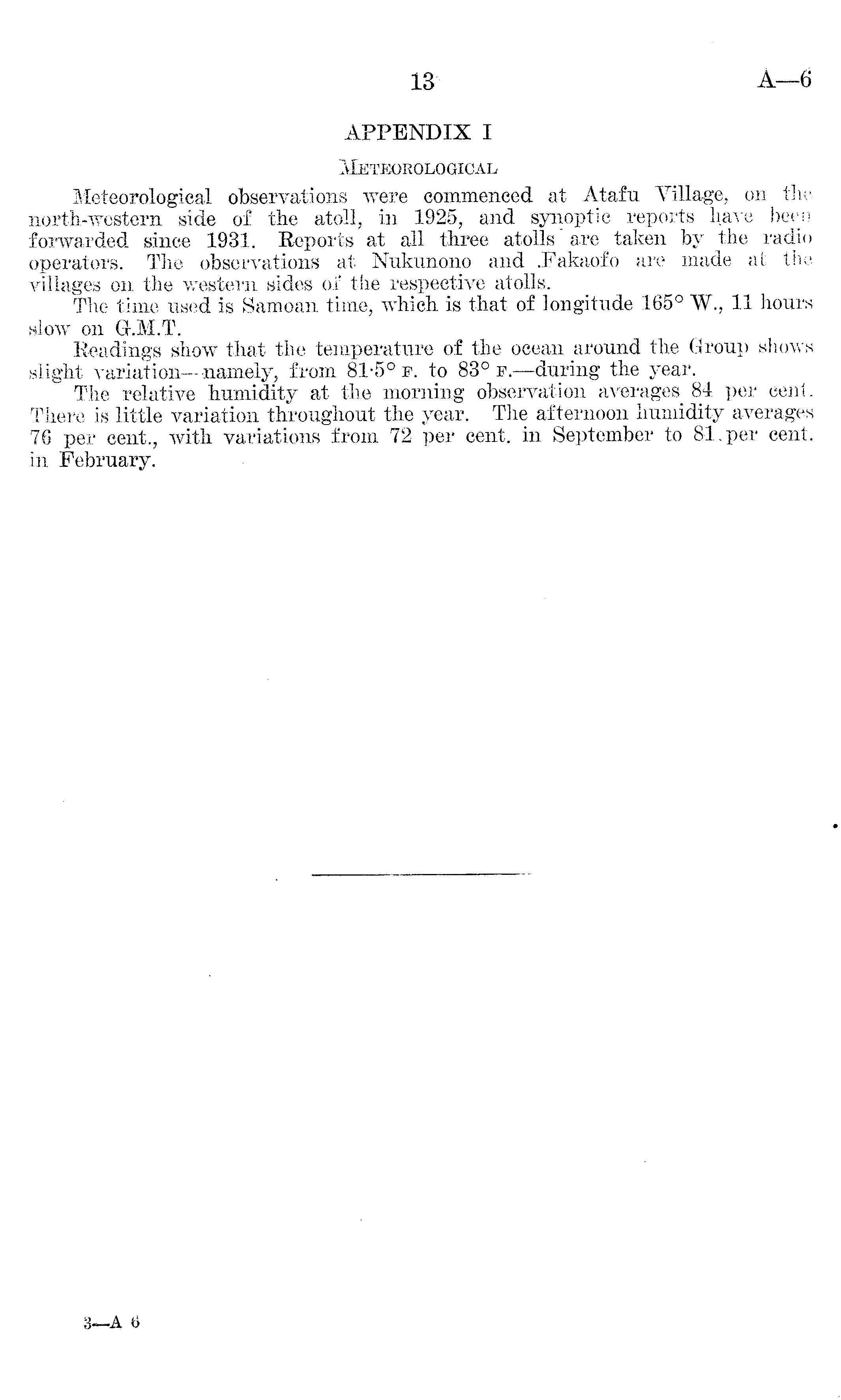 APPENDIX I Meteorological Meteorological observations were commenced at Atafu Village, on the north-western side of the atoll, in 1925, and synoptic reports have been forwarded since 1931. Reports at all three atolls are taken by the radio operators. The observations at Nukunono and .Fakaofo are made at the villages 011 the western sides of the respective atolls. The time used is Samoan time, which is that of longitude 165° W., 11 hours slow on G-.M.T. Readings show that the temperature of the ocean around the Group shows slight variation—namely, from 81-5° f. to 83° p.—during the year. The relative humidity at the morning observation averages 84 per cent. There is little variation throughout the year. The afternoon humidity averages 76 per cent., with variations from 72 per cent, in September to 81. per cent, in February.