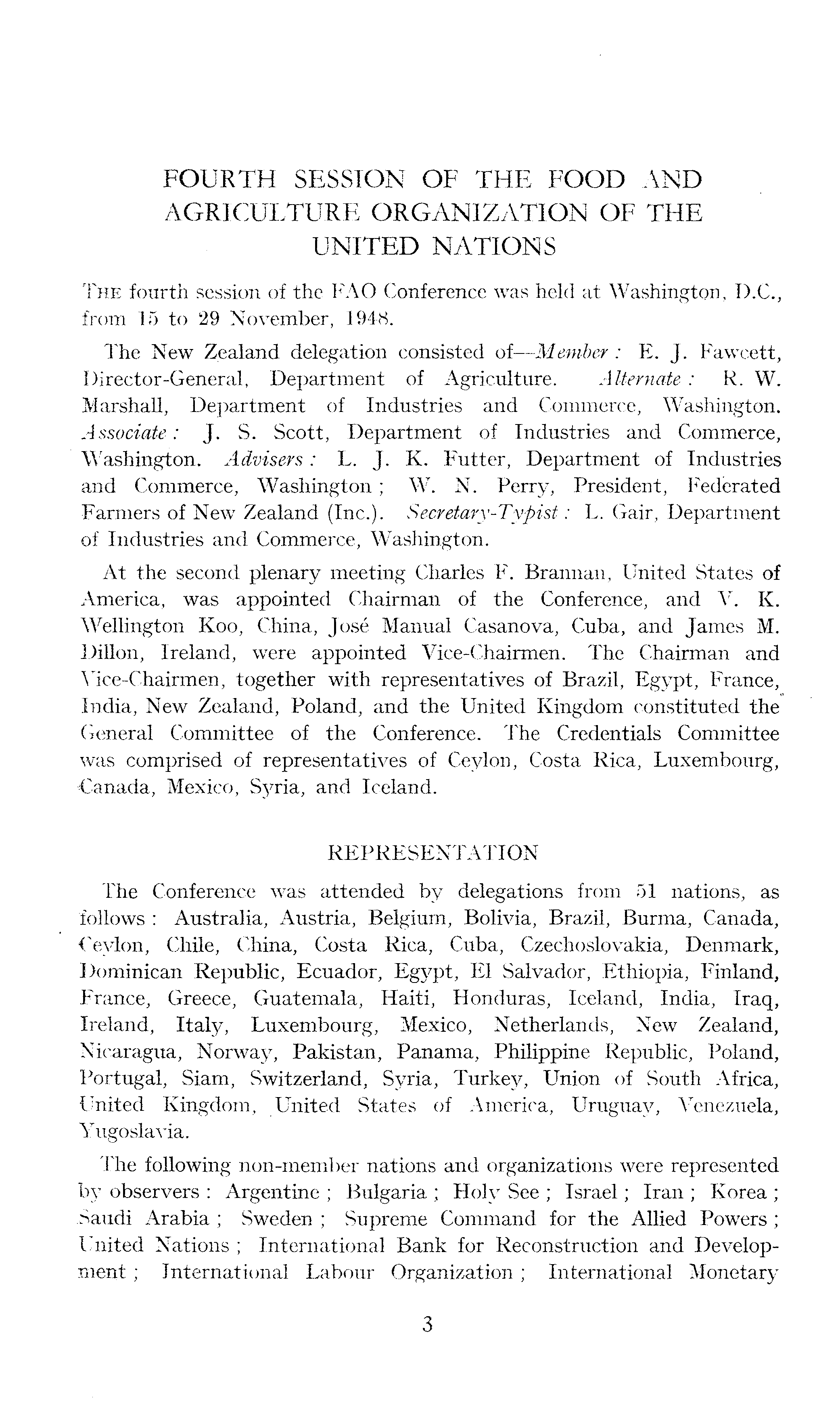 FOURTH SESSION OF THE FOOD AND AGRICULTURE ORGANIZATION OF THE UNITED NATIONS The fourth session of the FAO Conference was held at Washington, D.C., from 15 to 29 November, 1948. The New Zealand delegation consisted of —Member : E. J. Fawcett, Director-General, Department of Agriculture. Alternate : R. W. Marshall, Department of Industries and Commerce, Washington. Associate: J. S. Scott, Department of Industries and Commerce, Washington. Advisers: L. J. K. Futter, Department of Industries and Commerce, Washington; W. N. Perry, President, Federated Farmers of New Zealand (Inc.). Secretary-Typist: L. Gair, Department of Industries and Commerce, Washington. At the second plenary meeting Charles F. Brannan, United States of America, was appointed Chairman of the Conference, and V. K. Wellington Koo, China, Jose Manual Casanova, Cuba, and James M. Dillon, Ireland, were appointed Vice-Chairmen. The Chairman and Yice-Chairmen, together with representatives of Brazil, Egypt, France, India, New Zealand, Poland, and the United Kingdom constituted the General Committee of the Conference. The Credentials Committee was comprised of representatives of Ceylon, Costa Rica, Luxembourg, Canada, Mexico, Syria, and Iceland. REPRESENTATION The Conference was attended by delegations from 51 nations, as follows : Australia, Austria, Belgium, Bolivia, Brazil, Burma, Canada, Ceylon, Chile, China, Costa Rica, Cuba, Czechoslovakia, Denmark, Dominican Republic, Ecuador, Egypt, El Salvador, Ethiopia, Finland, France, Greece, Guatemala, Haiti, Honduras, Iceland, India, Iraq, Ireland, Italy, Luxembourg, Mexico, Netherlands, New Zealand, Nicaragua, Norway, Pakistan, Panama, Philippine Republic, Poland, Portugal, Siam, Switzerland, Syria, Turkey, Union of South Africa, United Kingdom, United States of America, Uruguay, Venezuela, Yugoslavia. The following non-member nations and organizations were represented by observers : Argentine ; Bulgaria ; Holy See ; Israel; Iran ; Korea ; Saudi Arabia ; Sweden ; Supreme Command for the Allied Powers; United Nations ; International Bank for Reconstruction and Development ; International Labour Organization; International Monetary
