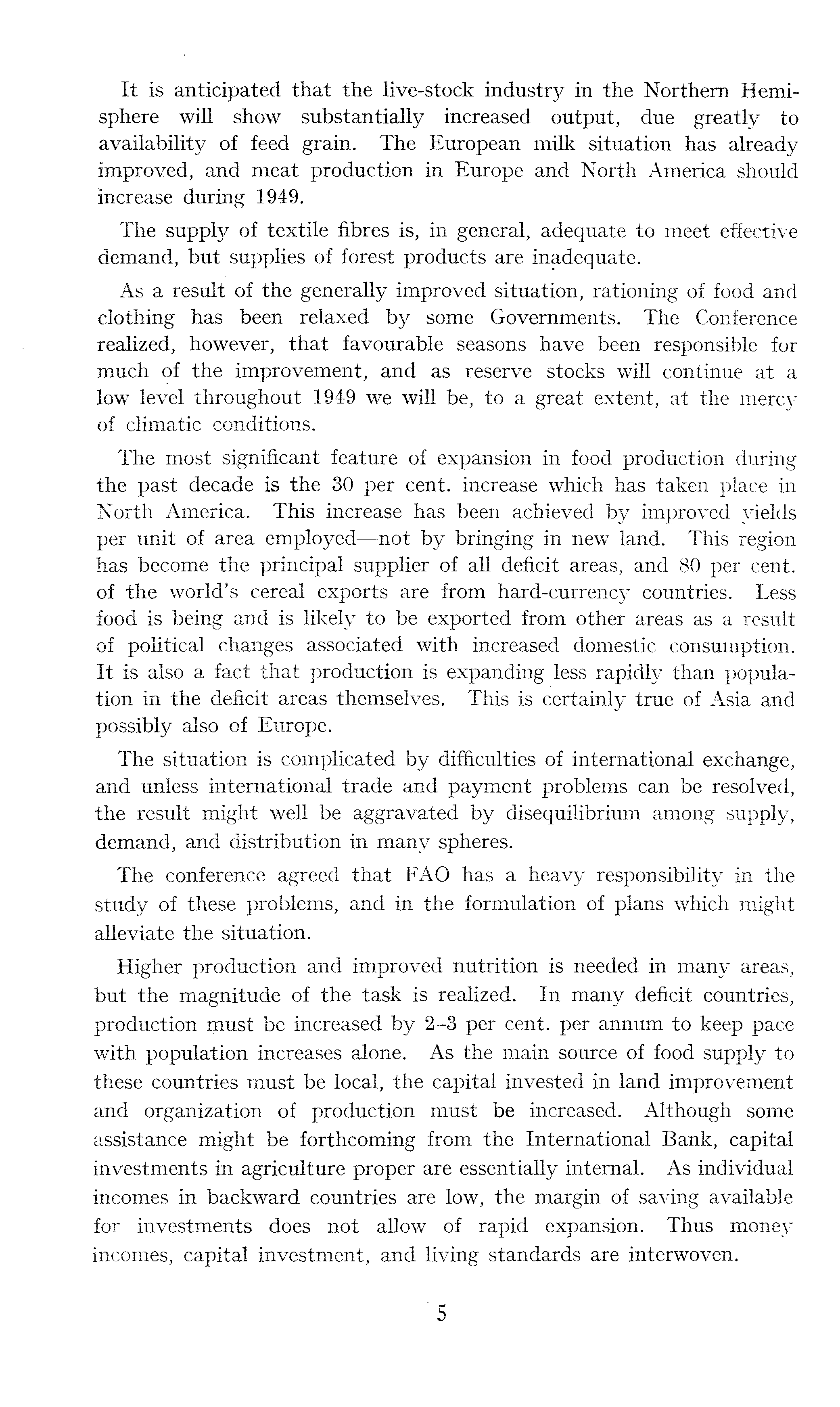 It is anticipated that the live-stock industry in the Northern Hemisphere will show substantially increased output, due greatly to availability of feed grain. The European milk situation has already improved, and meat production in Europe and North America should increase during 1949. The supply of textile fibres is, in general, adequate to meet effective demand, but supplies of forest products are inadequate. As a result of the generally improved situation, rationing of food and clothing has been relaxed by some Governments. The Conference realized, however, that favourable seasons have been responsible for much of the improvement, and as reserve stocks will continue at a low level throughout 1949 we will be, to a great extent, at the mercy of climatic conditions. The most significant feature of expansion in food production during the past decade is the 30 per cent, increase which has taken place in North America. This increase has been achieved by improved yields per unit of area employed—not by bringing in new land. This region has become the principal supplier of all deficit areas, and 80 per cent, of the world's cereal exports are from hard-currency countries. Less food is being and is likely to be exported from other areas as a result of political changes associated with increased domestic consumption. It is also a fact that production is expanding less rapidly than population in the deficit areas themselves. This is certainly true of Asia and possibly also of Europe. The situation is complicated by difficulties of international exchange, and unless international trade and payment problems can be resolved, the result might well be aggravated by disequilibrium among supply, demand, and distribution in many spheres. The conference agreed that FAO has a heavy responsibility in the study of these problems, and in the formulation of plans which might alleviate the situation. Higher production and improved nutrition is needed in many areas, but the magnitude of the task is realized. In many deficit countries, production must be increased by 2-3 per cent, per annum to keep pace with population increases alone. As the main source of food supply to these countries must be local, the capital invested in land improvement and organization of production must be increased. Although some assistance might be forthcoming from the International Bank, capital investments in agriculture proper are essentially internal. As individual incomes in backward countries are low, the margin of saving available for investments does not allow of rapid expansion. Thus money incomes, capital investment, and living standards are interwoven.