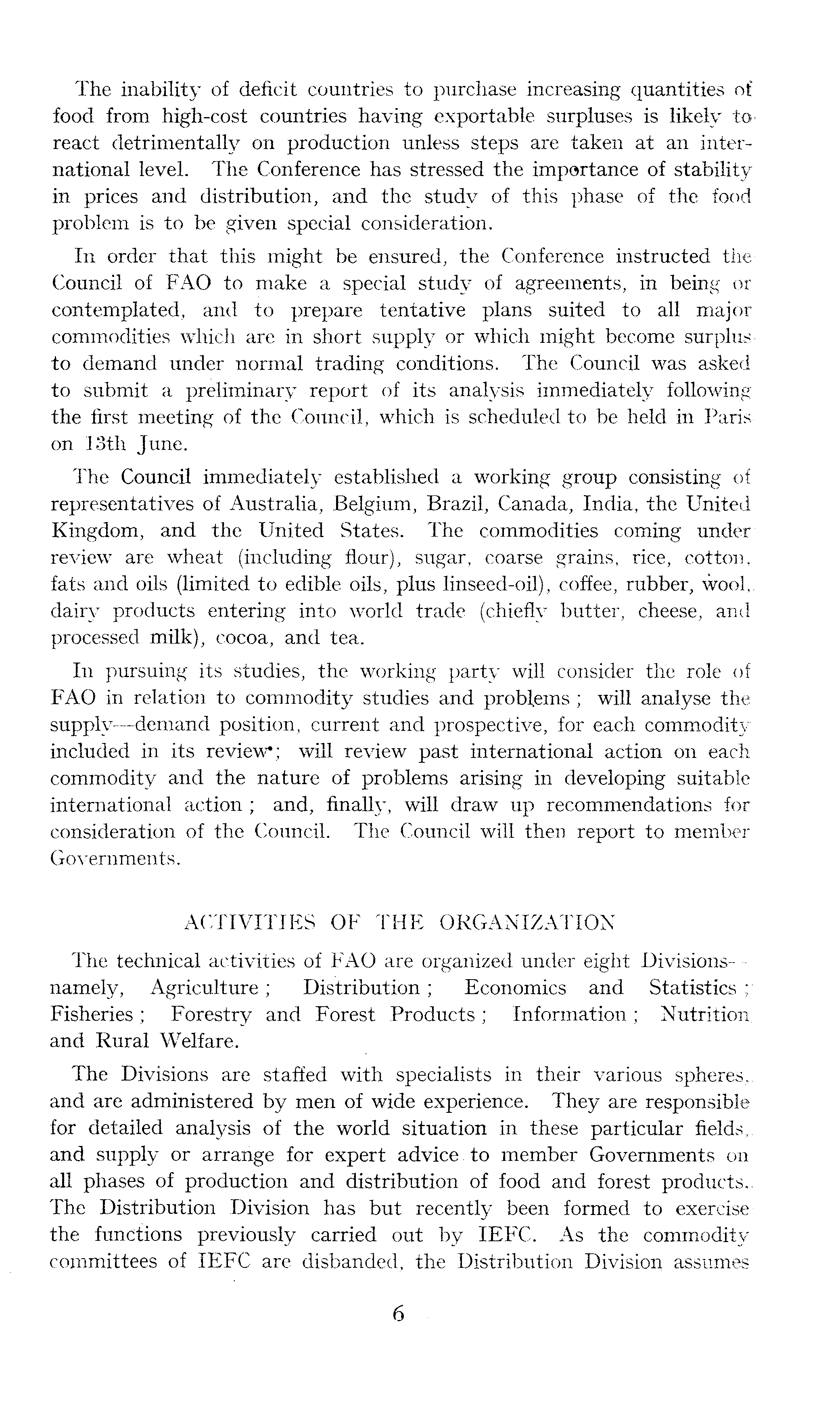 The inability of deficit countries to purchase increasing quantities of food from high-cost countries having exportable surpluses is likely to react detrimentally on production unless steps are taken at an international level. The Conference has stressed the importance of stability in prices and distribution, and the study of this phase of the food problem is to be given special consideration. In order that this might be ensured, the Conference instructed the Council of FAO to make a special study of agreements, in being or contemplated, and to prepare tentative plans suited to all major commodities which are in short supply or which might become surplus to demand under normal trading conditions. The Council was asked to submit a preliminary report of its analysis immediately following the first meeting of the Council, which is scheduled to be held in Paris on 13th June. The Council immediately established a working group consisting of representatives of Australia, Belgium, Brazil, Canada, India, the United Kingdom, and the United States. The commodities coming under review are wheat (including flour), sugar, coarse grains, rice, cotton, fats and oils (limited to edible oils, plus linseed-oil), coffee, rubber, wool,, dairy products entering into world trade (chiefly butter, cheese, and processed milk), cocoa, and tea. In pursuing its studies, the working party will consider the role of FAO in relation to commodity studies and problems ; will analyse the supply—demand position, current and prospective, for each commodity included in its review*; will review past international action on each commodity and the nature of problems arising in developing suitable international action ; and, finally, will draw up recommendations for consideration of the Council. The Council will then report to member Governments. ACTIVITIES OF THE ORGANIZATION The technical activities of FAO are organized under eight Divisions—namely, Agriculture; Distribution; Economics and Statistics Fisheries ; Forestry and Forest Products ; Information ; Nutrition, and Rural Welfare. The Divisions are staffed with specialists in their various spheres,, and are administered by men of wide experience. They are responsible for detailed analysis of the world situation in these particular fields, and v supply or arrange for expert advice to member Governments on all phases of production and distribution of food and forest products.. The Distribution Division has but recently been formed to exercise the functions previously carried out by IEFC. As the commodity committees of IEFC are disbanded, the Distribution Division assumes