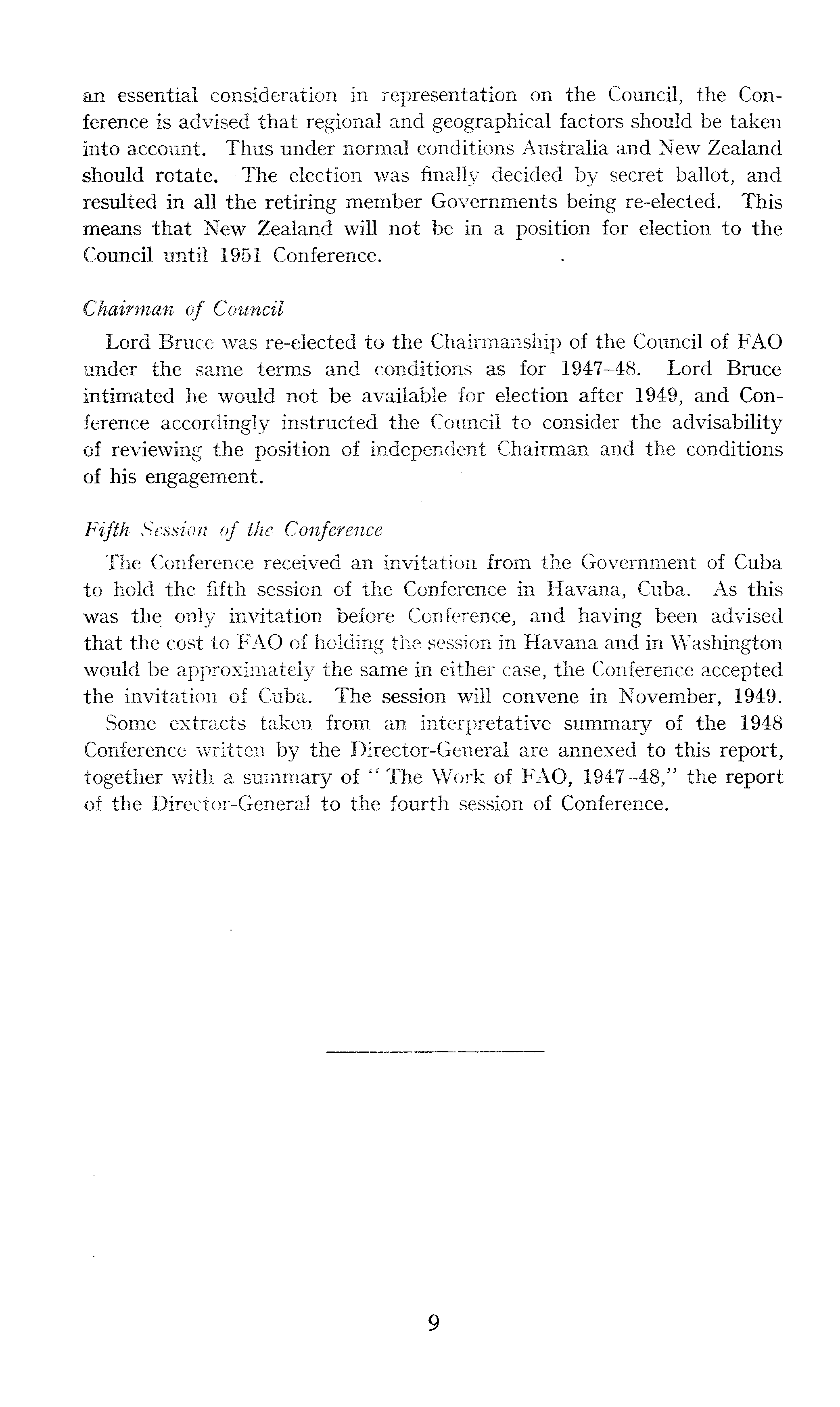 an essential consideration in representation on the Council, the Conference is advised that regional and geographical factors should be taken into account. Thus under normal conditions Australia and New Zealand should rotate. The election was finally decided by secret ballot, and resulted in all the retiring member Governments being re-elected. This means that New Zealand will not be in a position for election to the Council until 1951 Conference. Chairman of Council Lord Bruce was re-elected to the Chairmanship of the Council of FAO under the same terms and conditions as for 1947-48. Lord Bruce intimated he would not be available for election after 1949, and Conference accordingly instructed the Council to consider the advisability of reviewing the position of independent Chairman and the conditions of his engagement. Fifth Session of the Conference The Conference received an invitation from the Government of Cuba to hold the fifth session of the Conference in Havana, Cuba. As this was the only invitation before Conference, and having been advised that the cost to FAO of holding the session in Havana and in Washington would be approximately the same in either case, the Conference accepted the invitation of Cuba. The session will convene in November, 1949. Some extracts taken from an interpretative summary of the 1948 Conference written by the Director-General are annexed to this report, together with a summary of " The Work of FAO, 1947—48," the report of the Director-General to the fourth session of Conference.