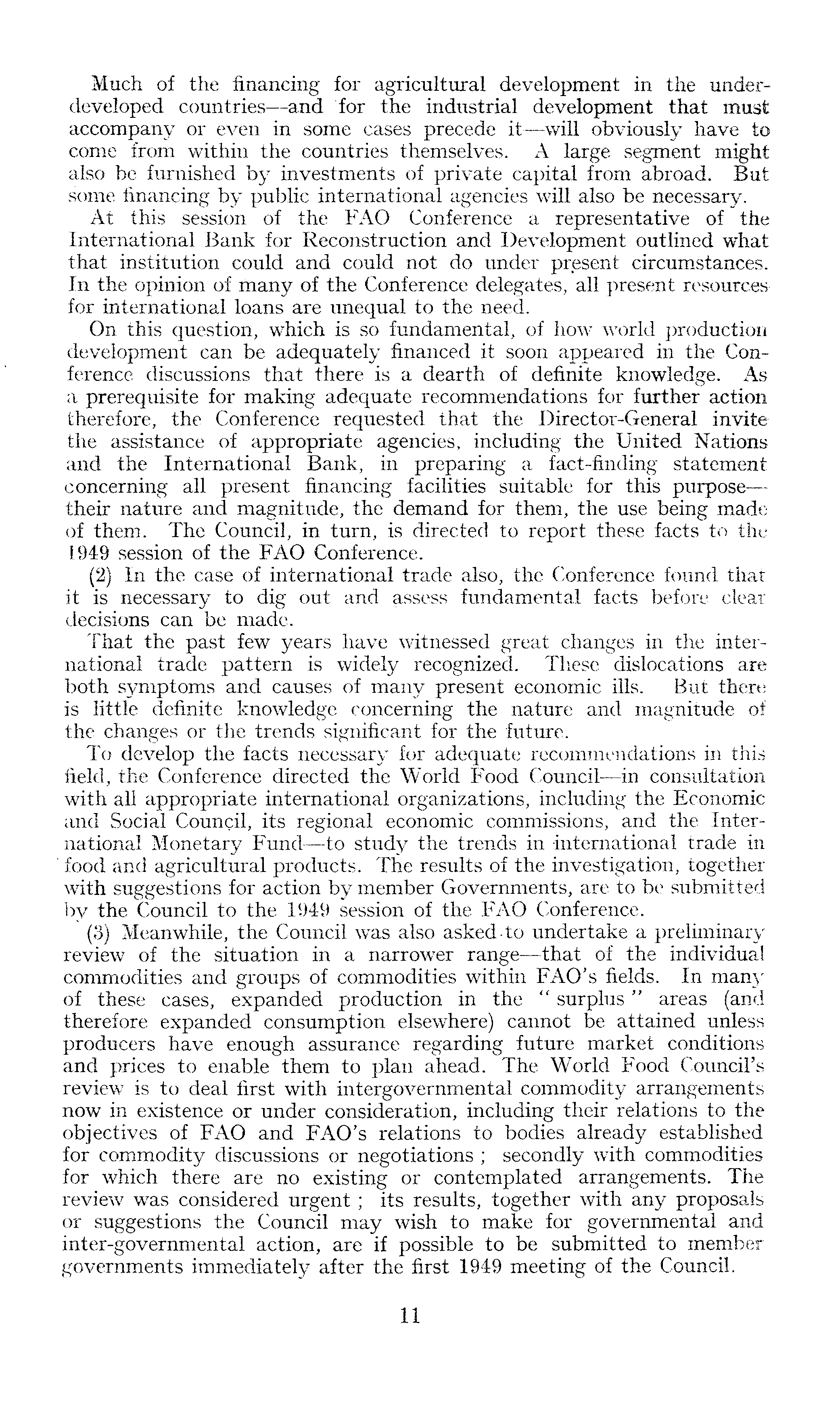 Much of the financing for agricultural development in the underdeveloped countries—and for the industrial development that must accompany or even in some cases precede it —will obviously have to come from within the countries themselves. A large segment might also be furnished by investments of private capital from abroad. But some financing by public international agencies will also be necessary. At this session of the FAO Conference a representative of the International Bank for Reconstruction and Development outlined what that institution could and could not do under present circumstances. In the opinion of many of the Conference delegates, all present resources for international loans are unequal to the need. On this question, which is so fundamental, of how world production development can be adequately financed it soon appeared in the Conference discussions that there is a dearth of definite knowledge. As a prerequisite for making adequate recommendations for further action therefore, the Conference requested that the Director-General invite the assistance of appropriate agencies, including the United Nations and the International Bank, in preparing a fact-finding statement concerning all present financing facilities suitable for this purposetheir nature and magnitude, the demand for them,' the use being made of them. The Council, in turn, is directed to report these facts to the 1949 session of the FAO Conference. (2) In the case of international trade also, the Conference found that it is necessary to dig out and assess fundamental facts before clear decisions can be made. That the past few years have witnessed great changes in the international trade pattern is widely recognized. These dislocations are both symptoms and causes of many present economic ills. But there is little definite knowledge concerning the nature and magnitude of the changes or the trends significant for the future. To develop the facts necessary for adequate recommendations in this field, the Conference directed the World Food Council —in consultation with all appropriate international organizations, including the Economic and Social Council, its regional economic commissions, and the International Monetary Fund—to study the trends in international trade in food and agricultural products. The results of the investigation, together with suggestions for action by member Governments, are to be submitted by the Council to the 1949 session of the FAO Conference. (3) Meanwhile, the Council was also asked-to undertake a preliminary review of the situation in a narrower range —that of the individual commodities and groups of commodities within FAO's fields. In many of these cases, expanded production in the " surplus" areas (and therefore expanded consumption elsewhere) cannot be attained unless producers have enough assurance regarding future market conditions and prices to enable them to plan ahead. The World Food Council's review is to deal first with intergovernmental commodity arrangements now in existence or under consideration, including their relations to the objectives of FAO and FAO's relations to bodies already established for commodity discussions or negotiations ; secondly with commodities for which there are no existing or contemplated arrangements. The review was considered urgent; its results, together with any proposals or suggestions the Council may wish to make for governmental and inter-governmental action, are if possible to be submitted to member governments immediately after the first 1949 meeting of the Council.