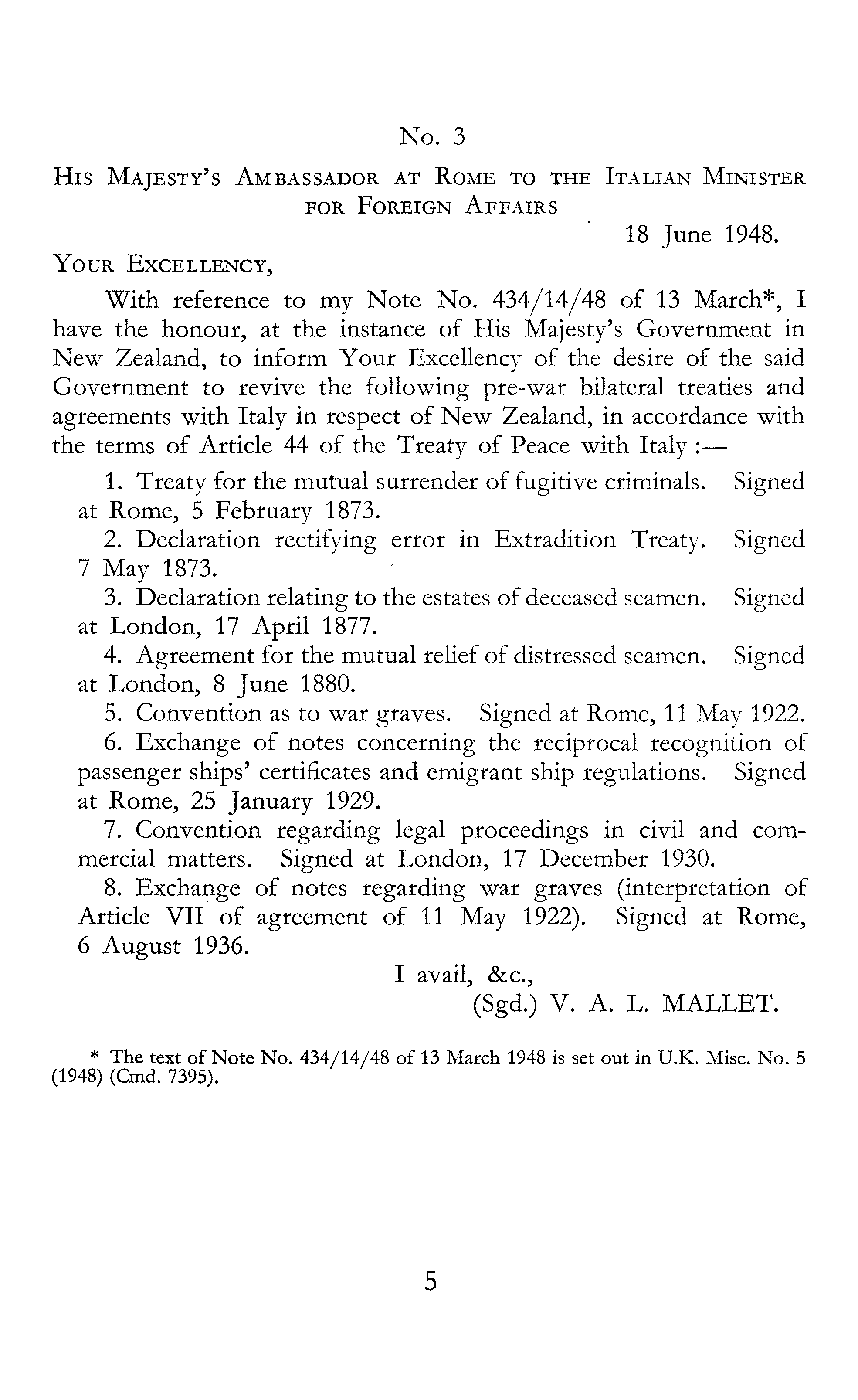 No. 3 His Majesty's Ambassador at Rome to the Italian Minister for Foreign Affairs 18 June 1948. Your Excellency, With reference to my Note No. 434/14/48 of 13 March*, I have the honour, at the instance of His Majesty's Government in New Zealand, to inform Your Excellency of the desire of the said Government to revive the following pre-war bilateral treaties and agreements with Italy in respect of New Zealand, in accordance with the terms of Article 44 of the Treaty of Peace with Italy : 1. Treaty for the mutual surrender of fugitive criminals. Signed at Rome, 5 February 1873. 2. Declaration rectifying error in Extradition Treaty. Signed 7 May 1873. 3. Declaration relating to the estates of deceased seamen. Signed at London, 17 April 1877. 4. Agreement for the mutual relief of distressed seamen. Signed at London, 8 June 1880. 5. Convention as to war graves. Signed at Rome, 11 May 1922. 6. Exchange of notes concerning the reciprocal recognition of passenger ships' certificates and emigrant ship regulations. Signed at Rome, 25 January 1929. 7. Convention regarding legal proceedings in civil and commercial matters. Signed at London, 17 December 1930. 8. Exchange of notes regarding war graves (interpretation of Article VII of agreement of 11 May 1922). Signed at Rome, 6 August 1936. I avail, &c, (Sgd.) V. A. L. MALLET.