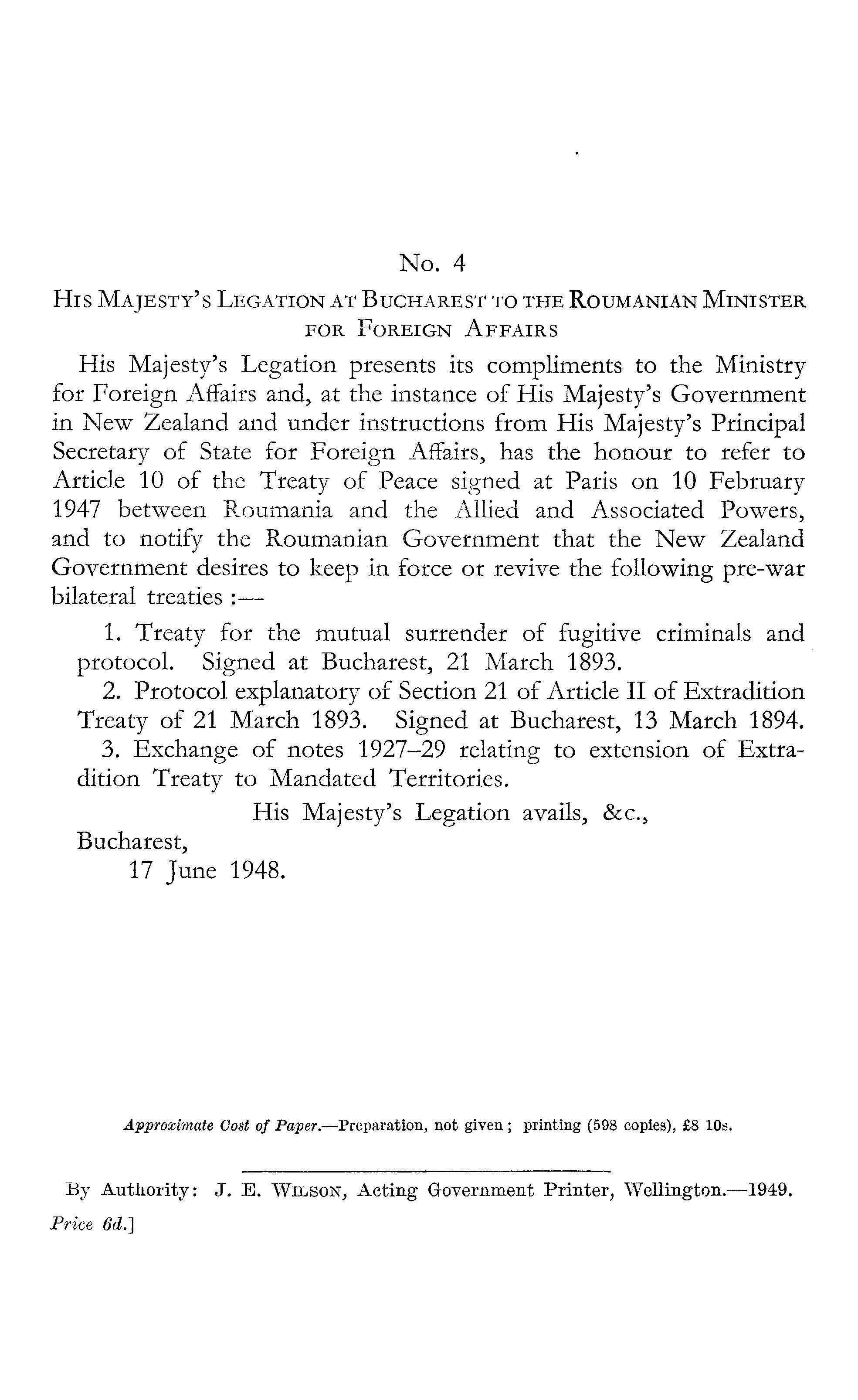 No. 4 His Majesty's Legation at Bucharest to the Roumanian Minister for Foreign Affairs His Majesty's Legation presents its compliments to the Ministry for Foreign Affairs and, at the instance of His Majesty's Government in New Zealand and under instructions from His Majesty's Principal Secretary of State for Foreign Affairs, has the honour to refer to Article 10 of the Treaty of Peace signed at Paris on 10 February 1947 between R.oumania and the Allied and Associated Powers, and to notify the Roumanian Government that the New Zealand Government desires to keep in force or revive the following pre-war bilateral treaties : 1. Treaty for the mutual surrender of fugitive criminals and protocol. Signed at Bucharest, 21 March 1893. 2. Protocol explanatory of Section 21 of Article II of Extradition Treaty of 21 March 1893. Signed at Bucharest, 13 March 1894. 3. Exchange of notes 1927-29 relating to extension of Extradition Treaty to Mandated Territories. His Majesty's Legation avails, &c, Bucharest, 17 June 1948.