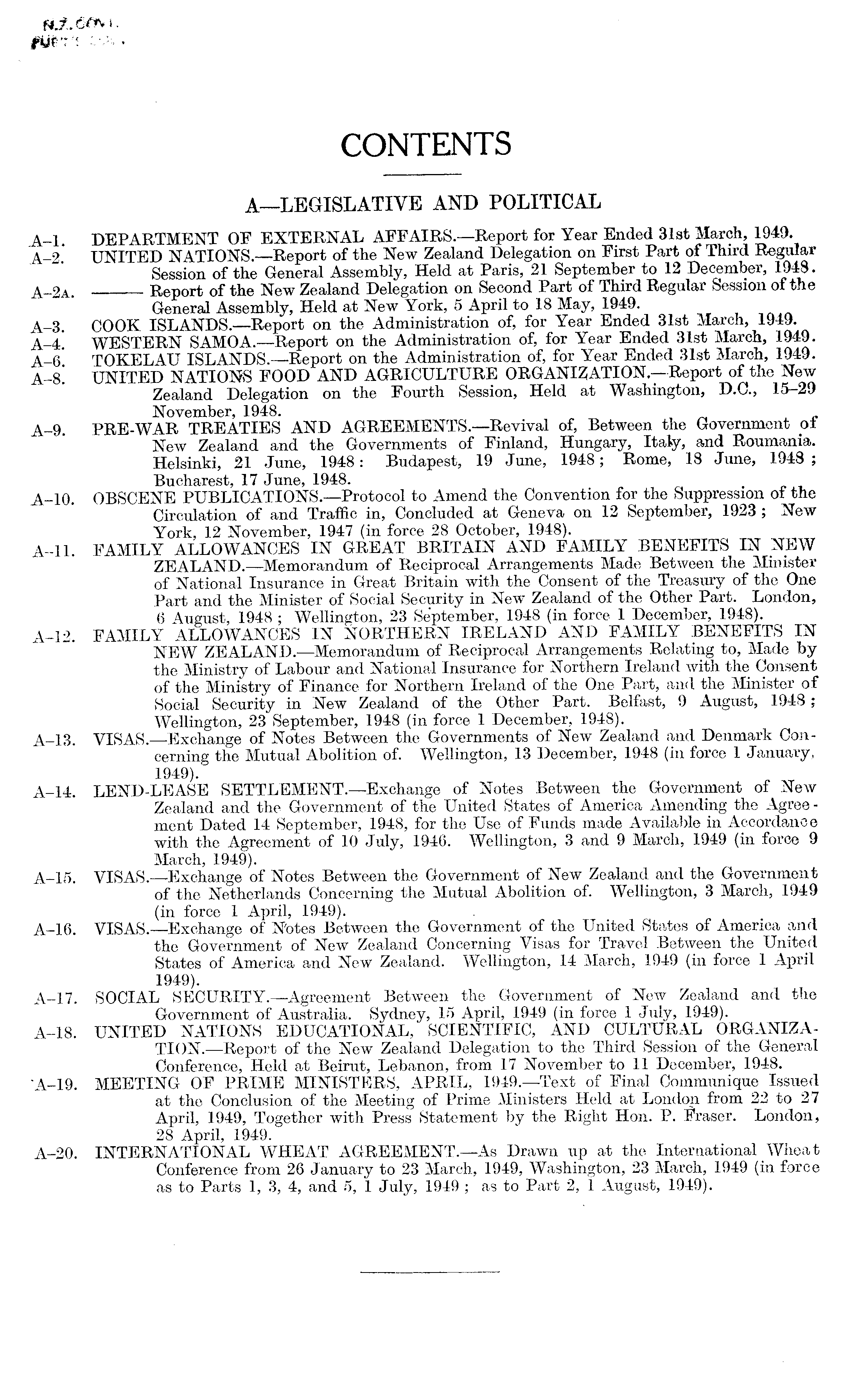 CONTENTS A—LEGISLATIVE AND POLITICAL A-l DEPARTMENT OF EXTERNAL AFFAIRS.—Report for Year Ended 31st March, 1949. A-2 UNITED NATIONS.—Report of the New Zealand Delegation on First Part of Third Regular Session of the General Assembly, Held at Paris, 21 September to 12 December, 1943. A-2a Report of the New Zealand Delegation on Second Part of Third Regular Session of the General Assembly, Held at New York, 5 April to 18 May, 1949. \-3 COOK ISLANDS.—Report on the Administration of, for Year Ended 31st March, 1949. A-4 WESTERN SAMOA.—Report on the Administration of, for Year Ended 31st March, 1949. A-6 TOKELAU ISLANDS.—Report on the Administration of, for Year Ended 31st March, 1949. A-S. UNITED NATIONS FOOD AND AGRICULTURE ORGANIZATION.—Report of the New Zealand Delegation on the Fourth Session, Held at Washington, D.C., 15-29 November, 1948. „ A-9. PRE-WAR TREATIES AND AGREEMENTS.—RevivaI of, Between the Government of New Zealand and the Governments of Finland, Hungary, Italy, and Roumania. Helsinki, 21 June, 1948: Budapest, 19 June, 1948; Rome, 18 June, 1948 ; Bucharest, 17 June, 1948. , A-10. OBSCENE PUBLICATIONS.—ProtocoI to Amend the Convention for the Suppression of the Circulation of and Traffic in, Concluded at Geneva on 12 September, 1923 ; New York, 12 November, 1947 (in force 28 October, 1948). A-11. FAMILY ALLOWANCES IN GREAT BRITAIN AND FAMILY BENEFITS IN NEW ZEALAND. —Memorandum of Reciprocal Arrangements Made Between the Minister of National Insurance in Great Britain with the Consent of the Treasury of the One Part and the Minister of Social Security in New Zealand of the Other Part. London, 6 August, 1948 ; Wellington, 23 September, 1948 (in force 1 December, 1948). A-12. FAMILY ALLOWANCES IN NORTHERN IRELAND AND FAMILY BENEFITS IN NEW ZEALAND.—Memorandum of Reciprocal Arrangements Relating to, Made by the Ministry of Labour and National Insurance for Northern Ireland with the Consent of the Ministry of Finance for Northern Ireland of the One Part, and the Minister of Social Security in New Zealand of the Other Part. Belfast, 9 August, 1948; Wellington, 23 September, 1948 (in force 1 December, 1948). A-13. VISAS. Exchange of Notes Between the Governments of New Zealand and Denmark Concerning the Mutual Abolition of. Wellington, 13 December, 1948 (in force 1 January, 1949). A-14. LEND-LEASE SETTLEMENT.—Exchange of Notes Between the Government of New Zealand and the Government of the United States of America Amending the Agree - ment Dated 14 September, 1948, for the Use of Funds made Available in Accordance with the Agreement of 10 July, 1946. Wellington, 3 and 9 March, 1949 (in force 9 March, 1949). A-15. VlSAS.—Exchange of Notes Between the Government of New Zealand and the Government of the Netherlands Concerning the Mutual Abolition of. Wellington, 3 March, 1949 (in force 1 April, 1949). A-16. VlSAS.—Exchange of Notes Between the Government of the United States of America and the Government of New Zealand Concerning Visas for Travel Between the United States of America and New Zealand. Wellington, 14 March, 1949 (in force 1 April 1949). A-17. SOCIAL SECURlTY.—Agreement Between the Government of New Zealand and the Government of Australia. Sydney, 15 April, 1949 (in force 1 July, 1949). A-18. UNITED NATIONS EDUCATIONAL, SCIENTIFIC, AND CULTURAL ORGANIZATION.—Report of the New Zealand Delegation to the Third Session of the General Conference, Held at Beirut, Lebanon, from 17 November to 11 December, 1948. A-19. MEETING OF PRIME MINISTERS, APRIL, 1949.—Text of Final Communique Issued at the Conclusion of the Meeting of Prime Ministers Held at London from 22 to 27 April, 1949, Together with Press Statement by the Right Hon. P. Fraser. London, 28 April, 1949. A-20. INTERNATIONAL WHEAT AGREEMENT.—As Drawn up at the International Wheat Conference from 26 January to 23 March, 1949, Washington, 23 March, 1949 (in force as to Parts 1, 3, 4, and 5, 1 July, 1949 ; as to Part 2, 1 August, 1949).