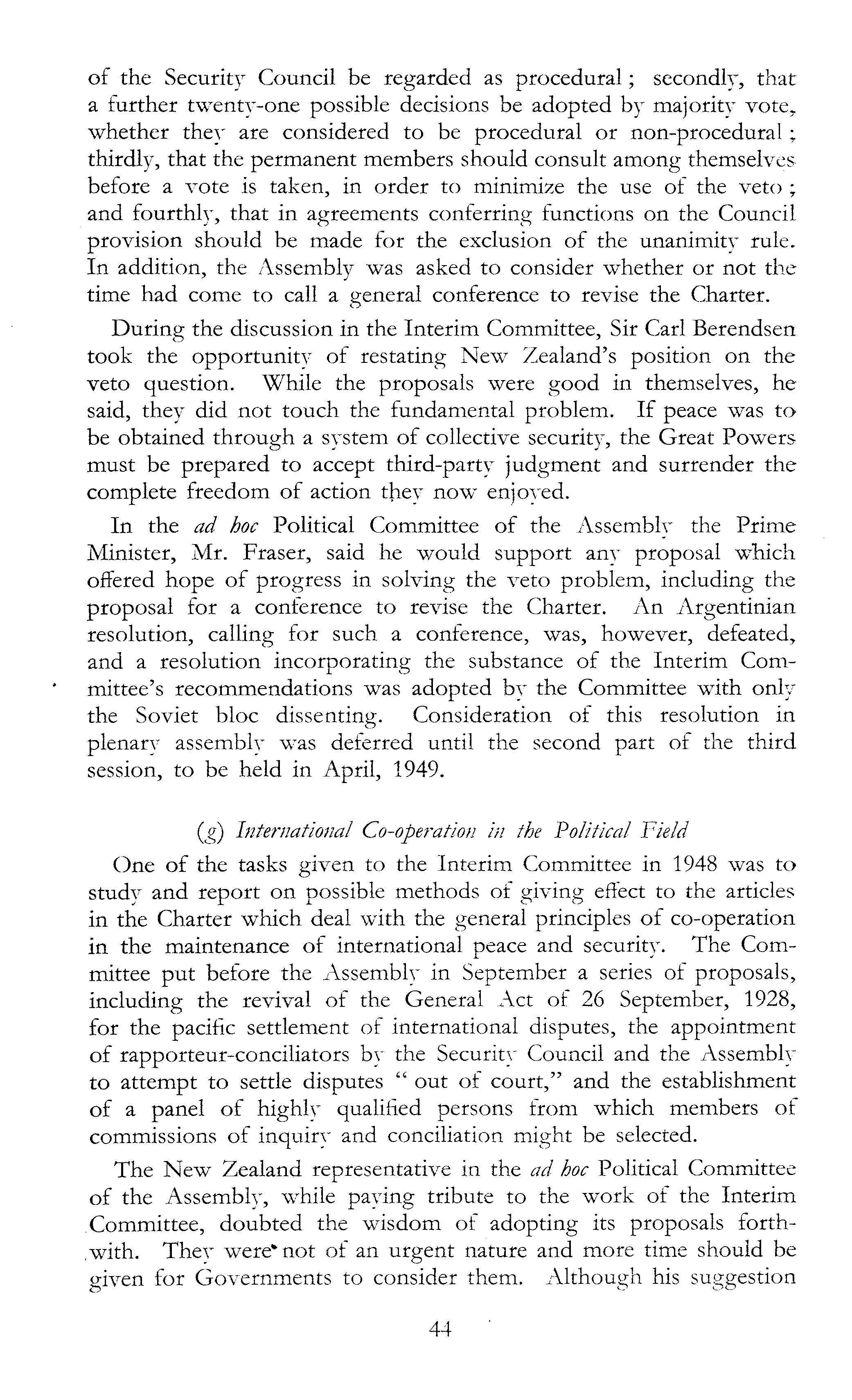 of the Security Council be regarded as procedural; secondly, that a further twenty-one possible decisions be adopted by majority vote, whether they are considered to be procedural or non-procedural; thirdly, that the permanent members should consult among themselves before a vote is taken, in order to minimize the use of the veto ; and fourthly, that in agreements conferring functions on the Council provision should be made for the exclusion of the unanimity rule. In addition, the Assembly was asked to consider whether or not the time had come to call a general conference to revise the Charter. During the discussion in the Interim Committee, Sir Carl Berendsen took the opportunity of restating New Zealand's position on the veto question. While the proposals were good in themselves, he said, they did not touch the fundamental problem. If peace was to be obtained through a system of collective security, the Great Powers must be prepared to accept third-party judgment and surrender the complete freedom of action they now enjoyed. In the ad hoc Political Committee of the Assembly the Prime Minister, Mr. Fraser, said he would support any proposal which offered hope of progress in solving the veto problem, including the proposal for a conference to revise the Charter. An Argentinian resolution, calling for such a conference, was, however, defeated, and a resolution incorporating the substance of the Interim Committee's recommendations was adopted by the Committee with only the Soviet bloc dissenting. Consideration of this resolution in plenary assembly was deferred until the second part of the third session, to be held in April, 1949. (g) International Co-operation in the Political Field One of the tasks given to the Interim Committee in 1948 was to study and report on possible methods of giving e,ffect to the articles in the Charter which deal with the general principles of co-operation in the maintenance of international peace and security. The Committee put before the Assembly in September a series of proposals, including the revival of the General Act of 26 September, 1928, for the pacific settlement of international disputes, the appointment of rapporteur-conciliators by the Security Council and the Assembly to attempt to settle disputes " out of court," and the establishment of a panel of highly qualified persons from which members of commissions of inquiry and conciliation might be selected. The New Zealand representative in the ad hoc Political Committee of the Assembly, while paying tribute to the work of the Interim Committee, doubted the wisdom of adopting its proposals forth,with. They were" not of an urgent nature and more time should be given for Governments to consider them. Although his suggestion