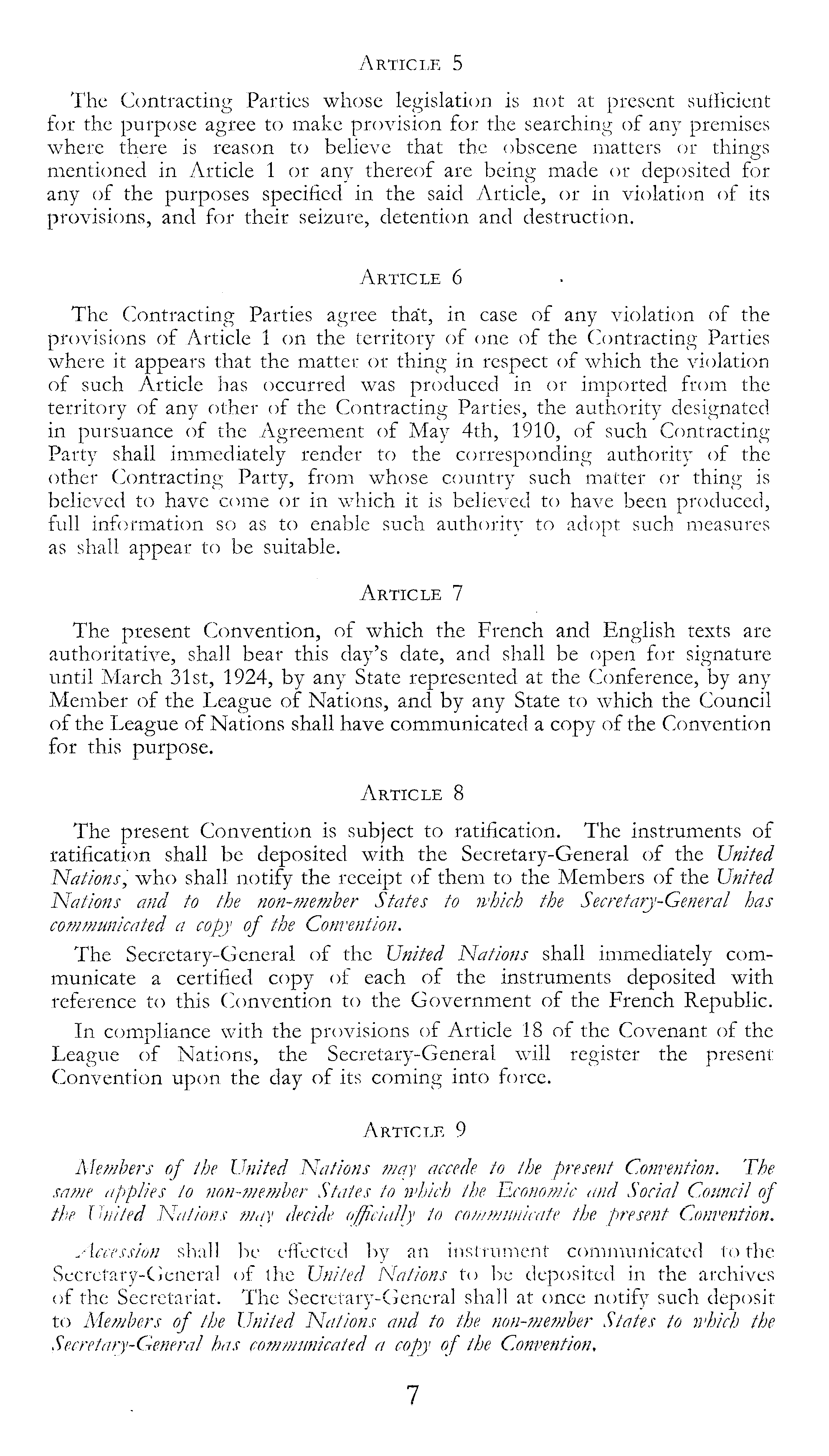 Article 5 The Contracting Parties whose legislation is not at present sufficient for the purpose agree to make provision for the searching of any premises where there is reason to believe that the obscene matters or things mentioned in Article 1 or any thereof are being made or deposited for any of the purposes specified in the said Article, or in violation of its provisions, and for their seizure, detention and destruction. Article 6 The Contracting Parties agree tha't, in case of any violation of the provisions of Article 1 on the territory of one of the Contracting Parties where it appears that the matter or thing in respect of which the violation of such Article has occurred was produced in or imported from the territory of any other of the Contracting Parties, the authority designated in pursuance of the Agreement of May 4th, 1910, of such Contracting Party shall immediately render to the corresponding authority of the other Contracting Party, from whose country such matter or thing is believed to have come or in which it is believed to have been produced, full information so as to enable such authority to adopt such measures as shall appear to be suitable. Article 7 The present Convention, of which the French and English texts are authoritative, shall bear this day's date, and shall be open for signature until March 31st, 1924, by any State represented at the Conference, by any Member of the League of Nations, and by any State to which the Council of the League of Nations shall have communicated a copy of the Convention for this purpose. Article 8 The present Convention is subject to ratification. The instruments of ratification shall be deposited with the Secretary-General of the United Nations, who shall notify the receipt of them to the Members of the United Nations and to the non-member States to which the Secretary-General has communicated a copy of the Convention. The Secretary-General of the United Nations shall immediately communicate a certified copy of each of the instruments deposited with reference to this Convention to the Government of the French Republic. In compliance with the provisions of Article 18 of the Covenant of the League of Nations, the Secretary-General will register the present Convention upon the day of its coming into force. Article 9 v Members of the United Nations may accede to the present Convention. The same applies to non-member States to which the Economic and Social Council of the United Nations may decide officially to communicate the present Convention. Accession shall be effected by an instrument communicated to the Secretary-General of the United Nations to be deposited in the archives of the Secretariat. The Secretary-General shall at once notify such deposit to Members of the United Nations and to the non-member States to which the Secretary-General has communicated a copy of the Convention,