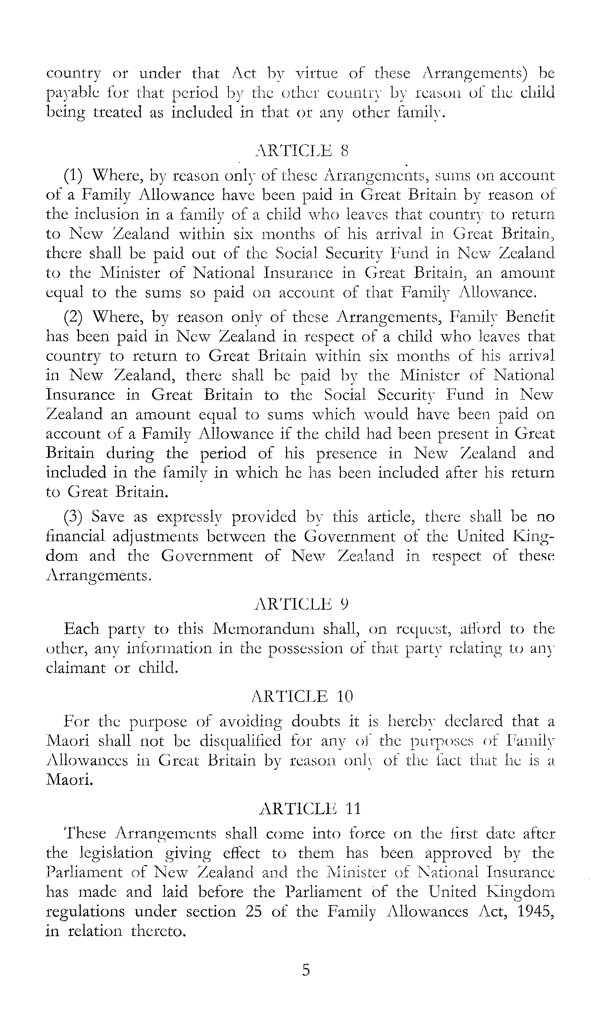 country or under that Act by virtue of these Arrangements) be payable for that period by the other country by reason of the child being treated as included in that or any other family. ARTICLE 8 (1) Where, by reason only of these Arrangements, sums on account of a Family Allowance have been paid in Great Britain by reason of the inclusion in a family of a child who leaves that country to return to New Zealand within six months of his arrival in Great Britain, there shall be paid out of the Social Security Fund in New Zealand to the Minister of National Insurance in Great Britain, an amount equal to the sums so paid on account of that Family Allowance. (2) Where, by reason only of these Arrangements, Family Benefit has been paid in New Zealand in respect of a child who leaves that country to return to Great Britain within six months of his arrival in New Zealand, there shall be paid by the Minister of National Insurance in Great Britain to the Social Security Fund in New Zealand an amount equal to sums which would have been paid on account of a Family Allowance if the child had been present in Great Britain during the period of his presence in New Zealand and included in the family in which he has been included after his return to Great Britain. (3) Save as expressly provided by this article, there shall be no financial adjustments between the Government of the United Kingdom and the Government of New Zealand in respect of these Arrangements. ARTICLE 9 Each party to this Memorandum shall, on request, afford to the other, any information in the possession of that party relating to any claimant or child. ARTICLE 10 For the purpose of avoiding doubts it is hereby declared that a Maori shall not be disqualified for any of the purposes of Family Allowances in Great Britain by reason only of the fact that he is a Maori. V ARTICLE 11 These Arrangements shall come into force on the first date after the legislation giving effect to them has been approved by the Parliament of New Zealand and the Minister of National Insurance has made and laid before the Parliament of the United Kingdom regulations under section 25 of the Family Allowances Act, 1945, in relation thereto.