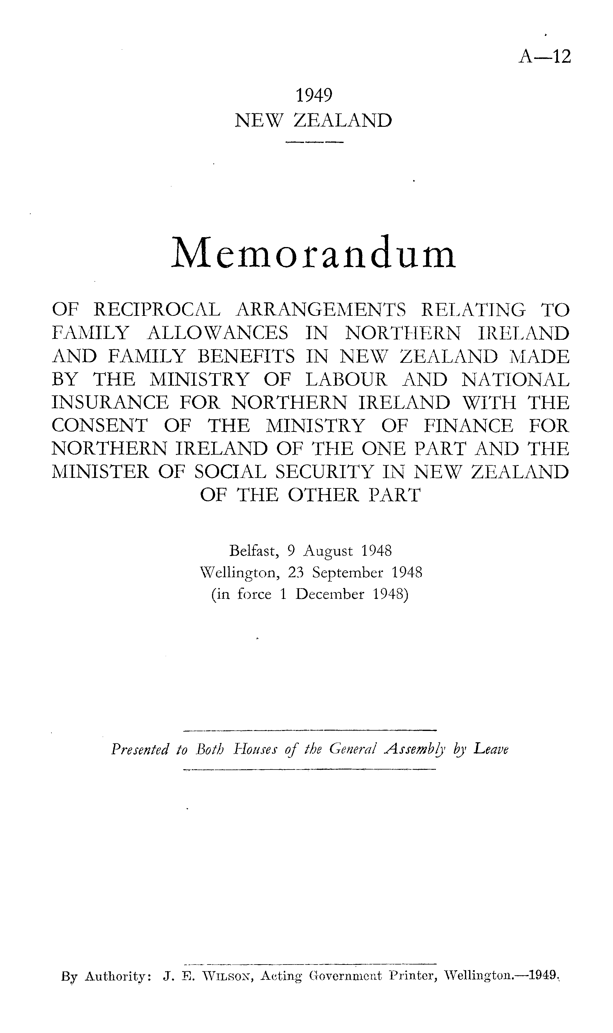 Memorandum OF RECIPROCAL ARRANGEMENTS RELATING TO FAMILY ALLOWANCES IN NORTHERN IRELAND AND FAMILY BENEFITS IN NEW ZEALAND MADE BY THE MINISTRY OF LABOUR AND NATIONAL INSURANCE FOR NORTHERN IRELAND WITH THE CONSENT OF THE MINISTRY OF FINANCE FOR NORTHERN IRELAND OF THE ONE PART AND THE MINISTER OF SOCIAL SECURITY IN NEW ZEALAND OF THE OTHER PART