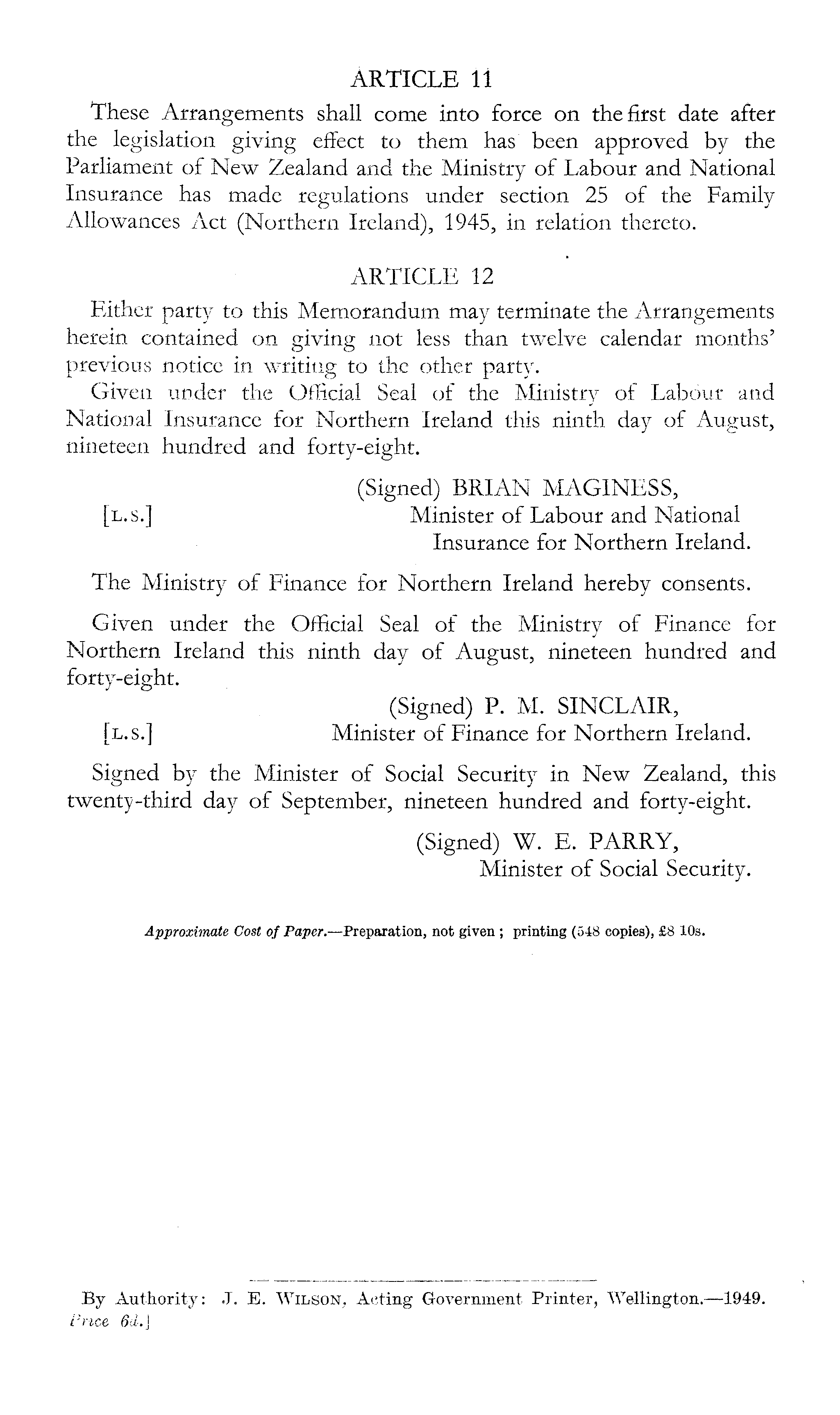 ARTICLE li These Arrangements shall come into force on the first date after the legislation giving effect to them has' been approved by the Parliament of New Zealand and the Ministry of Labour and National Insurance has made regulations under section 25 of the Family Allowances Act (Northern Ireland), 1945, in relation thereto. ARTICLE 12 Either party to this Memorandum may terminate the Arrangements herein contained on giving not less than twelve calendar months' previous notice in writing to the other party. Given under the Official Seal of the Ministry of Labour and National Insurance for Northern Ireland this ninth day of August, nineteen hundred and forty-eight. (Signed) BRIAN MAGINESS, [l.s.] Minister of Labour and National Insurance for Northern Ireland. The Ministry of Finance for Northern Ireland hereby consents. Given under the Official Seal of the Ministry of Finance for Northern Ireland this ninth day of August, nineteen hundred and forty-eight. (Signed) P. M. SINCLAIR, [l.s.] Minister of Finance for Northern Ireland. Signed by the Minister of Social Security in New Zealand, this twenty-third day of September, nineteen hundred and forty-eight. (Signed) W. E. PARRY, Minister of Social Security.