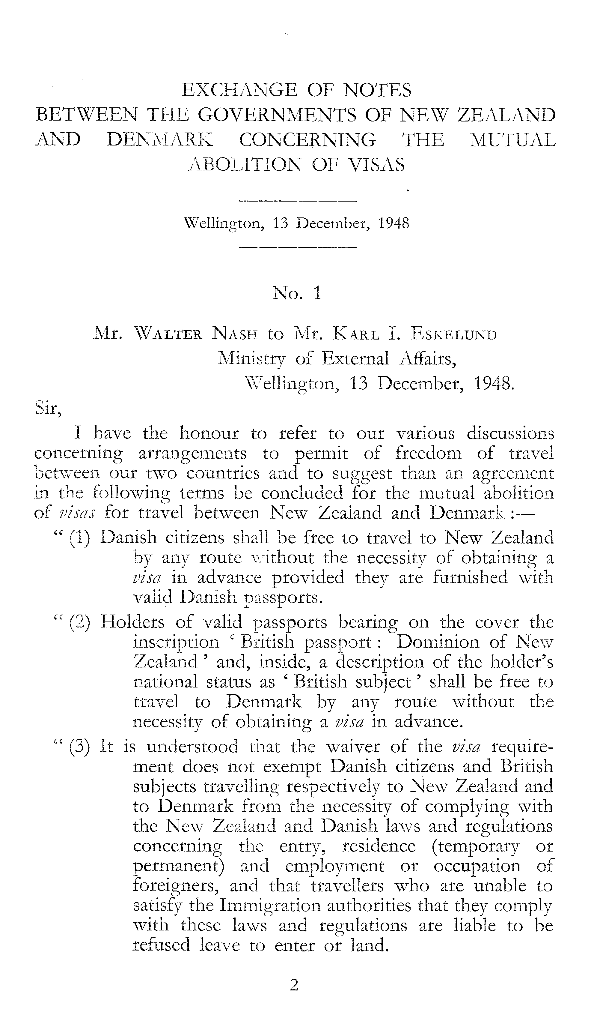 No. 1 Mr. Walter Nash to Mr. Karl I. Eskelund Ministry of External Affairs, Wellington, 13 December, 1948. Sir, I have the honour to refer to our various discussions concerning arrangements to permit of freedom of travel between our two countries and to suggest than an agreement in the following terms be concluded for the mutual abolition of visas for travel between New Zealand and Denmark : " (1) Danish citizens shall be free to travel to New Zealand by any route without the necessity of obtaining a visa in advance provided they are furnished with valid Danish passports. " (2) Holders of valid passports bearing on the cover the inscription ' British passport: Dominion of New Zealand' and, inside, a description of the holder's national status as 4 British subject' shall be free to travel to Denmark by any route without the necessity of obtaining a visa in advance. " (3) It is understood that the waiver of the visa requirement does not exempt Danish citizens and British subjects travelling respectively to New Zealand and to Denmark from the necessity of complying with the New Zealand and Danish laws and regulations concerning the entry, residence (temporary or permanent) and employment or occupation of foreigners, and that travellers who are unable to satisfy the Immigration authorities that they comply with these laws and regulations are liable to be refused leave to enter or land.