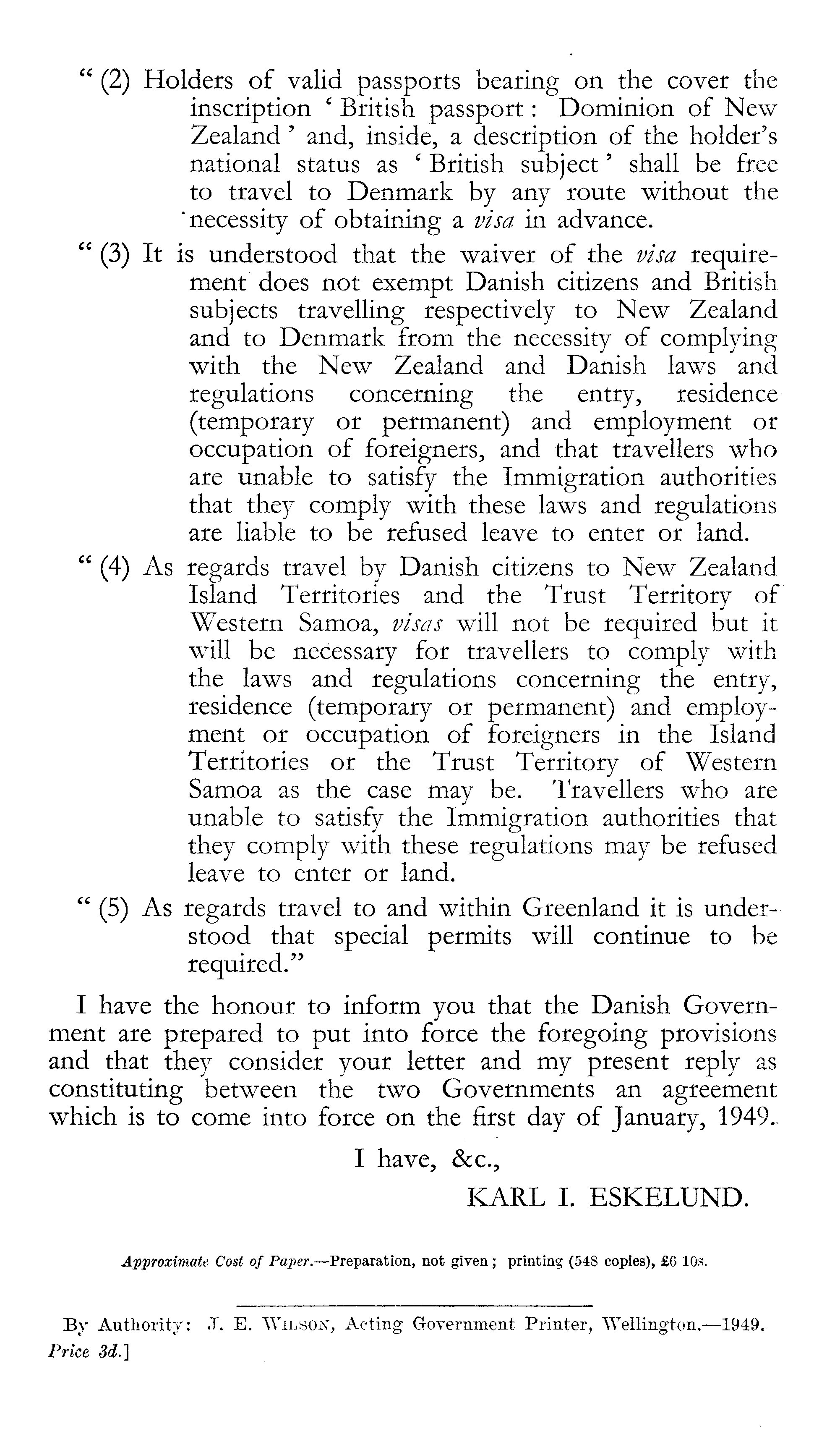 " (2) Holders of valid passports bearing on the cover the inscription ' British passport: Dominion of New Zealand' and, inside, a description of the holder's national status as ' British subject' shall be free to travel to Denmark by any route without the 'necessity of obtaining a visa in advance. " (3) It is understood that the waiver of the visa requirement does not exempt Danish citizens and British subjects travelling respectively to New Zealand and to Denmark from the necessity of complying with the New Zealand and Danish laws and regulations concerning the entry, residence (temporary or permanent) and employment or occupation of foreigners, and that travellers who are unable to satisfy the Immigration authorities that they comply with these laws and regulations are liable to be refused leave to enter or land. " (4) As regards travel by Danish citizens to New Zealand Island Territories and the Trust Territory of Western Samoa, visas will not be required but it will be necessary for travellers to comply with the laws and regulations concerning the entry, residence (temporary or permanent) and employment or occupation of foreigners in the Island Territories or the Trust Territory of Western Samoa as the case may be. Travellers who are unable to satisfy the Immigration authorities that they comply with these regulations may be refused leave to enter or land. " (5) As regards travel to and within Greenland it is understood that special permits will continue to be required." I have the honour to inform you that the Danish Government are prepared to put into force the foregoing provisions and that they consider your letter and my present reply as constituting between the two Governments an agreement which is to come into force on the first day of January, 1949.. I have, &c., KARL I, ESKELUND.