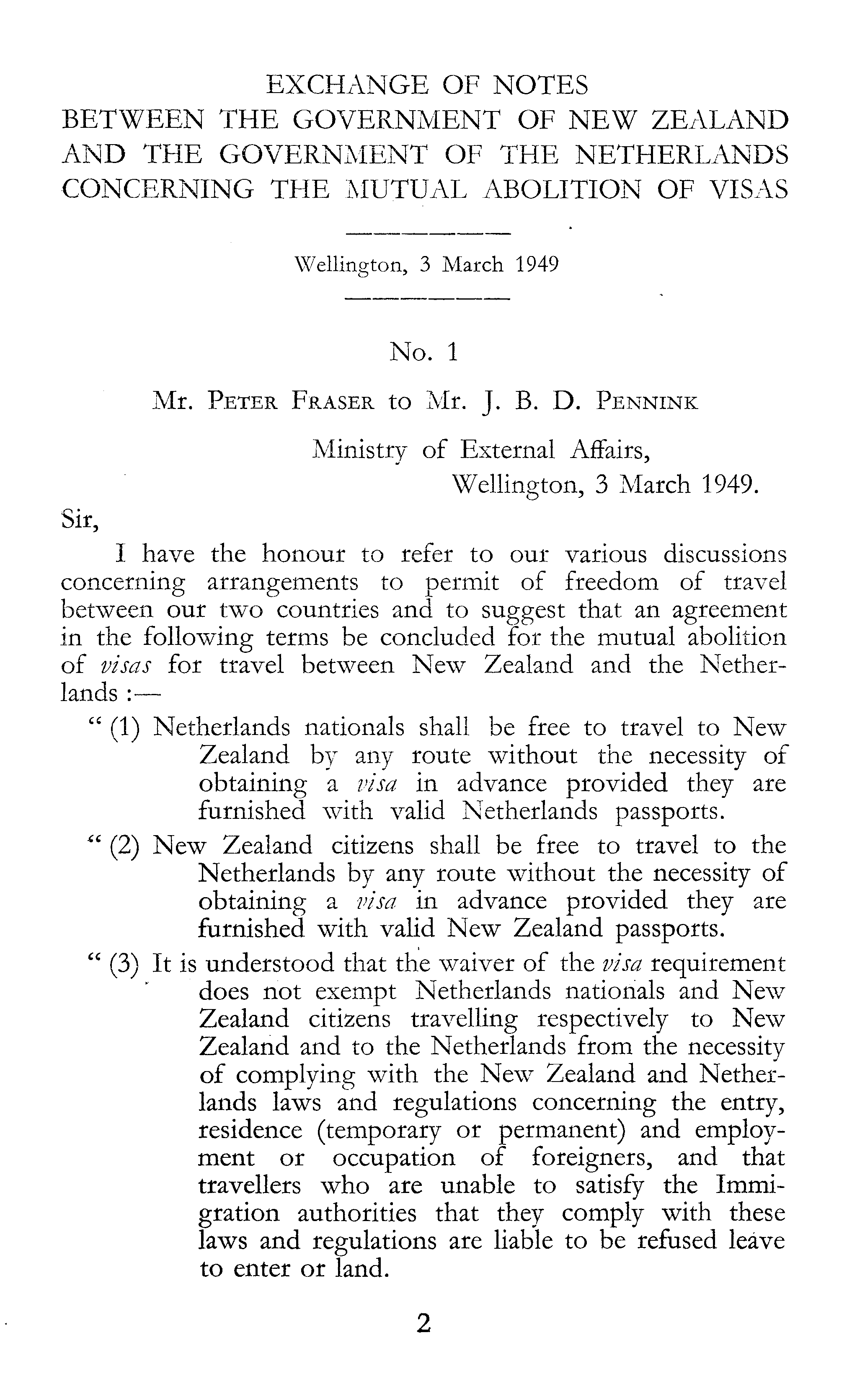 Wellington, 3 March 1949 No. 1 Mr. Peter Fraser to Mr. J. B. D. Pennink ■ Ministry of External Affairs, Wellington, 3 March 1949. Sir, I have the honour to refer to our various discussions concerning arrangements to permit of freedom of travel between our two countries and to suggest that an agreement in the following terms be concluded for the mutual abolition of visas for travel between New Zealand and the Netherlands : " (1) Netherlands nationals shall be free to travel to New Zealand by any route without the necessity of obtaining a visa in advance provided they are furnished with valid Netherlands passports. " (2) New Zealand citizens shall be free to travel to the Netherlands by any route without the necessity of obtaining a visa in advance provided they are furnished with valid New Zealand passports. *' (3) It is understood that the waiver of the visa requirement does not exempt Netherlands nationals and New Zealand citizens travelling respectively to New Zealand and to the Netherlands from the necessity of complying with the New Zealand and Netherlands laws and regulations concerning the entry, residence (temporary or permanent) and employment or occupation of foreigners, and that travellers who are unable to satisfy the Immigration authorities that they comply with these laws and regulations are liable to be refused leave to enter or land.