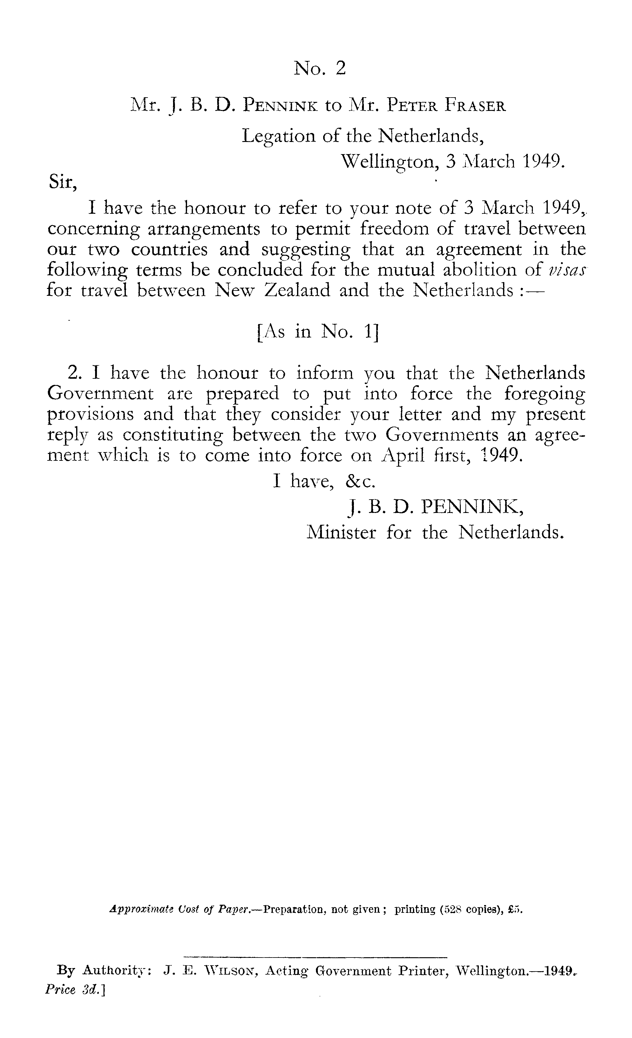 No. 2 Mr. J. B. D. Pennink to Mr. Peter Fraser Legation of the Netherlands, Wellington, 3 March 1949. Sir, I have the honour to refer to your note of 3 March 1949,. concerning arrangements to permit freedom of travel between our two countries and suggesting that an agreement in the following terms be concluded for the mutual abolition of visas for travel between New Zealand and the Netherlands : [As in No. 1] 2. I have the honour to inform you that the Netherlands Government are prepared to put into force the foregoing provisions and that they consider your letter and my present reply as constituting between the two Governments an agreement which is to come into force on April first, 1949. I have, &c. J. B. D. PENNINK, Minister for the Netherlands.