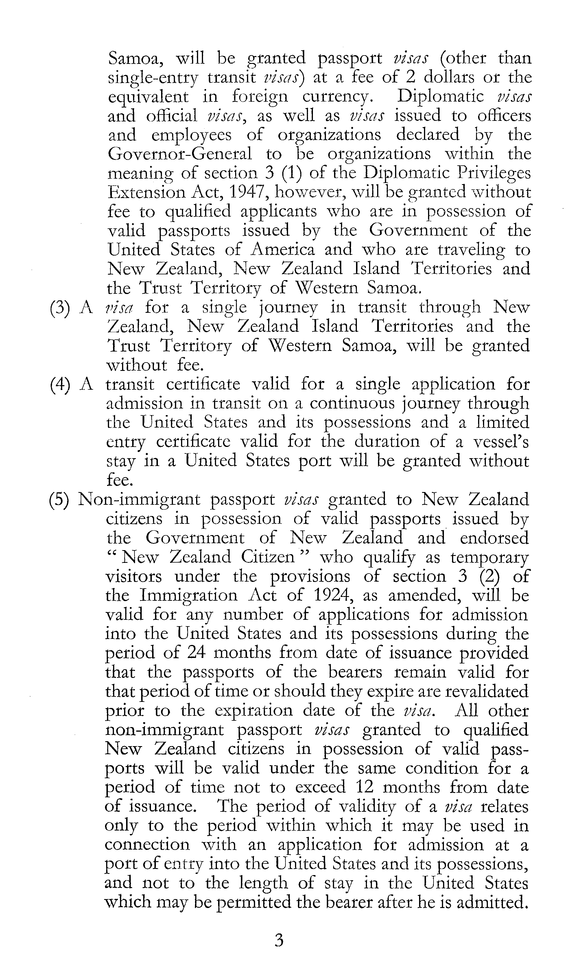 Samoa, will be granted passport visas (other than single-entry transit visas) at a fee of 2 dollars or the equivalent in foreign currency. Diplomatic visas and official visas, as well as visas issued to officers and employees of organizations declared by the Governor-General to be organizations within the meaning of section 3 (1) of the Diplomatic Privileges Extension Act, 1947, however, will be granted without fee to qualified applicants who are in possession of valid passports issued by the Government of the United States of America and who are traveling to New Zealand, New Zealand Island Territories and the Trust Territory of Western Samoa. (3) A visa for a single journey in transit through New Zealand, New Zealand Island Territories and the Trust Territory of Western Samoa, will be granted without fee. (4) A transit certificate valid for a single application for admission in transit on a continuous journey through the United States and its possessions and a limited entry certificate valid for the duration of a vessel's stay in a United States port will be granted without fee. (5) Non-immigrant passport visas granted to New Zealand citizens in possession of valid passports issued by the Government of New Zealand and endorsed " New Zealand Citizen " who qualify as temporary visitors under the provisions of section 3 (2) of the Immigration Act of 1924, as amended, will be valid for any number of applications for admission into the United States and its possessions during the period of 24 months from date of issuance provided that the passports of the bearers remain valid for that period of time or should they expire are revalidated prior to the expiration date of the visa. All other non-immigrant passport visas granted to qualified New Zealand citizens in possession of valid passports will be valid under the same condition for a period of time not to exceed 12 months from date of issuance. The period of validity of a visa relates only to the period within which it may be used in connection with an application for admission at a port of entry into the United States and its possessions, and not to the length of stay in the United States which may be permitted the bearer after he is admitted.