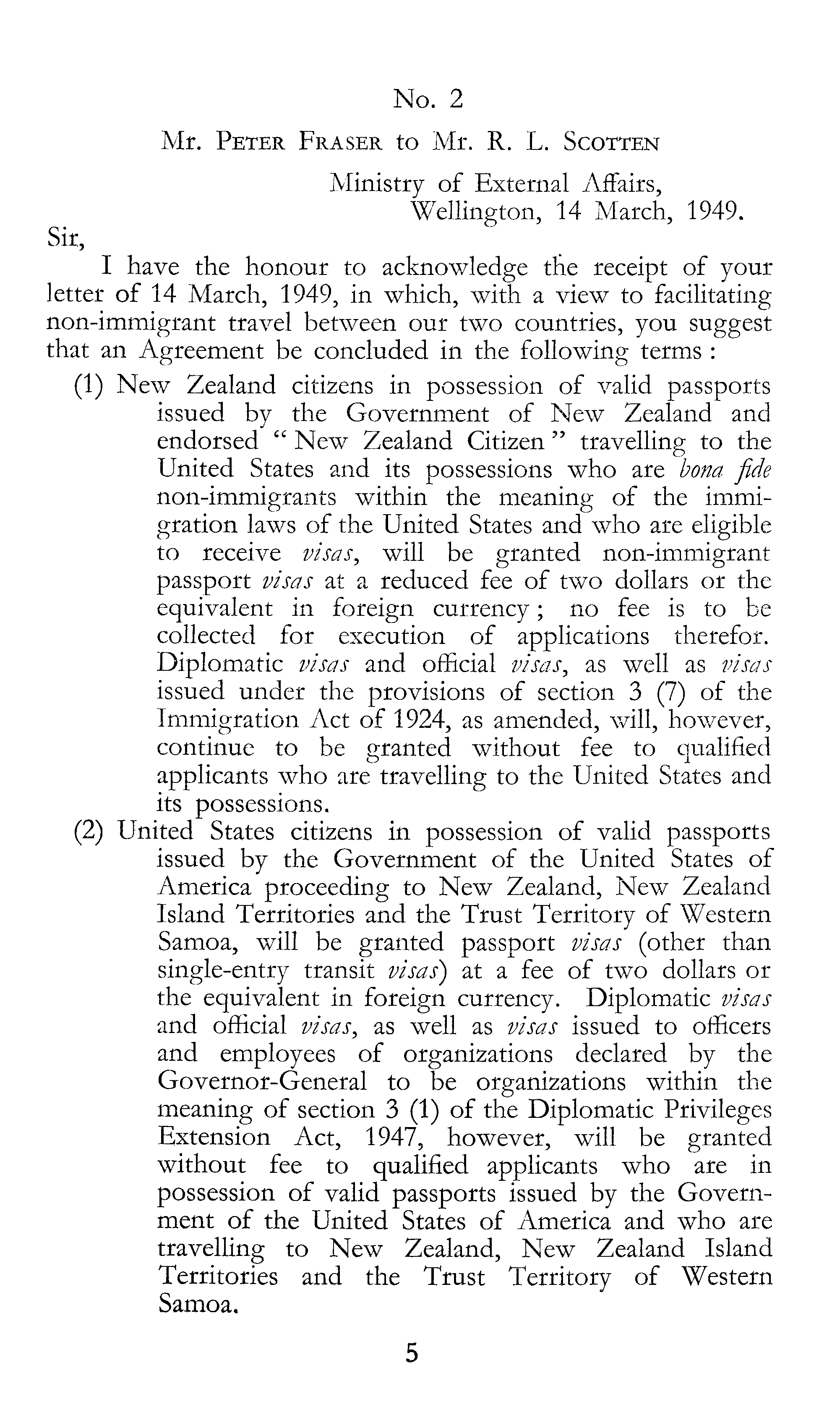 No. 2 Mr. Peter Fraser to Mr. R. L. Scotten Ministry of External Affairs, Wellington, 14 March, 1949. Sir, I have the honour to acknowledge the receipt of your letter of 14 March, 1949, in which, with a view to facilitating non-immigrant travel between our two countries, you suggest that an Agreement be concluded in the following terms : (1) New Zealand citizens in possession of valid passports issued by the Government of New Zealand and endorsed " New Zealand Citizen " travelling to the United States and its possessions who are bona fide non-immigrants within the meaning of the immigration laws of the United States and who are eligible to receive visas, will be granted non-immigrant passport visas at a reduced fee of two dollars or the equivalent in foreign currency; no fee is to be collected for execution of applications therefor. Diplomatic visas and official visas, as well as visas issued under the provisions of section 3 (7) of the Immigration Act of 1924, as amended, will, however, continue to be granted without fee to qualified applicants who are travelling to the United States and its possessions. (2) United States citizens in possession of valid passports issued by the Government of the United States of America proceeding to New Zealand, New Zealand Island Territories and the Trust Territory of Western Samoa, will be granted passport visas (other than single-entry transit visas) at a fee of two dollars or the equivalent in foreign currency. Diplomatic visas and official visas, as well as visas issued to officers and employees of organizations declared by the Governor-General to be organizations within the meaning of section 3 (1) of the Diplomatic Privileges Extension Act, 1947, however, will be granted without fee to qualified applicants who are in possession of valid passports issued by the Government of the United States of America and who are travelling to New Zealand, New Zealand Island Territories and the Trust Territory of Western Samoa.