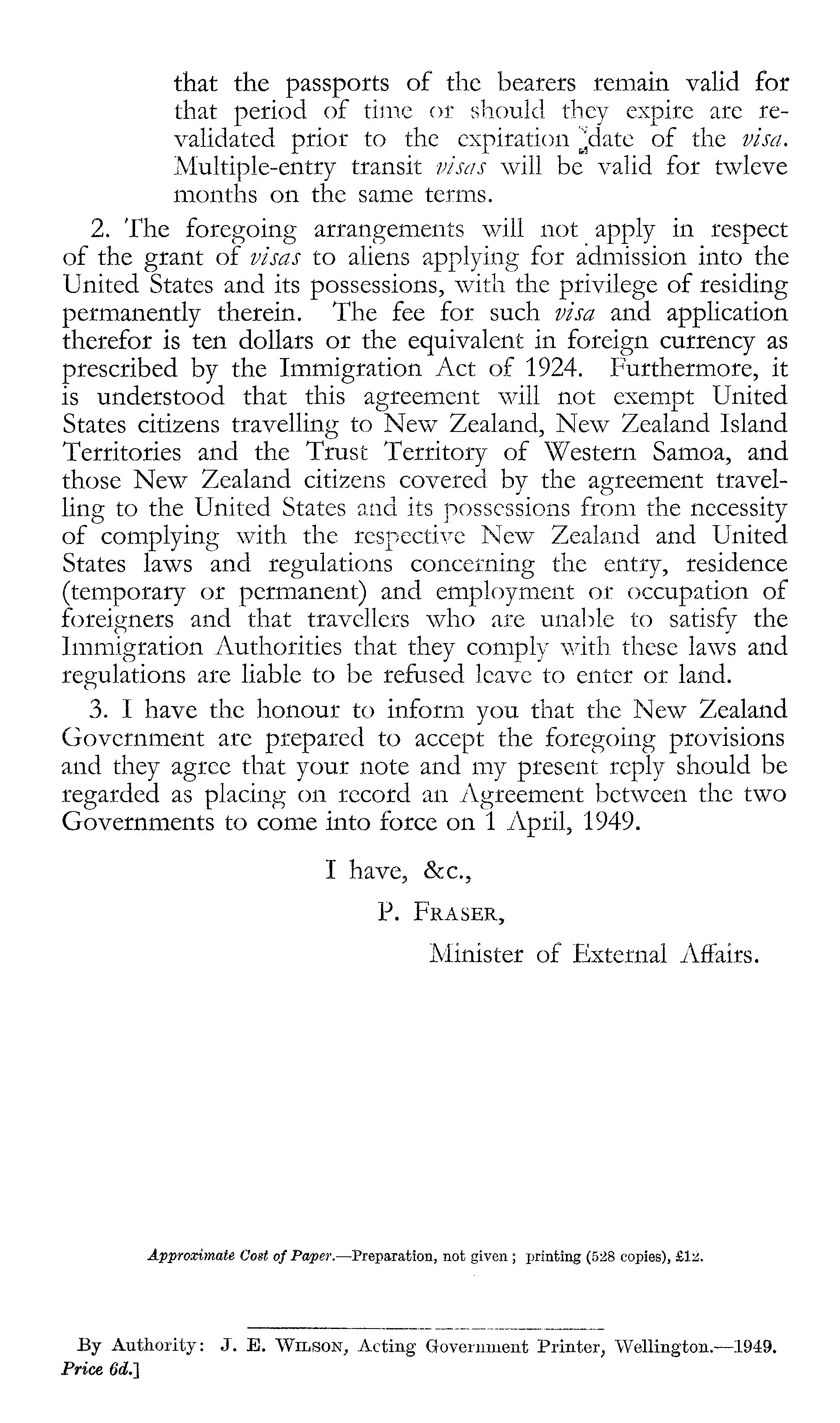 that the passports of the bearers remain valid for that period of time or should they expire are revalidated prior to the expiration ]date of the visa. Multiple-entry transit visas will be valid for twleve months on the same terms. 2. The foregoing arrangements will not apply in respect of the grant of visas to aliens applying for admission into the United States and its possessions, with the privilege of residing permanently therein. The fee for such visa and application therefor is ten dollars or the equivalent in foreign currency as prescribed by the Immigration Act of 1924. Furthermore, it is understood that this agreement will not exempt United States citizens travelling to New Zealand, New Zealand Island Territories and the Trust Territory of Western Samoa, and those New Zealand citizens covered by the agreement travelling to the United States and its possessions from the necessity of complying with the respective New Zealand and United States laws and regulations concerning the entry, residence (temporary or permanent) and employment or occupation of foreigners and that travellers who are unable to satisfy the Immigration Authorities that they comply with these laws and regulations are liable to be refused leave to enter or land. 3. I have the honour to inform you that the New Zealand Government are prepared to accept the foregoing provisions and they agree that your note and my present reply should be regarded as placing on record an Agreement between the two Governments to come into force on 1 April, 1949. I have, &c., P. Fraser, Minister of External Affairs. %