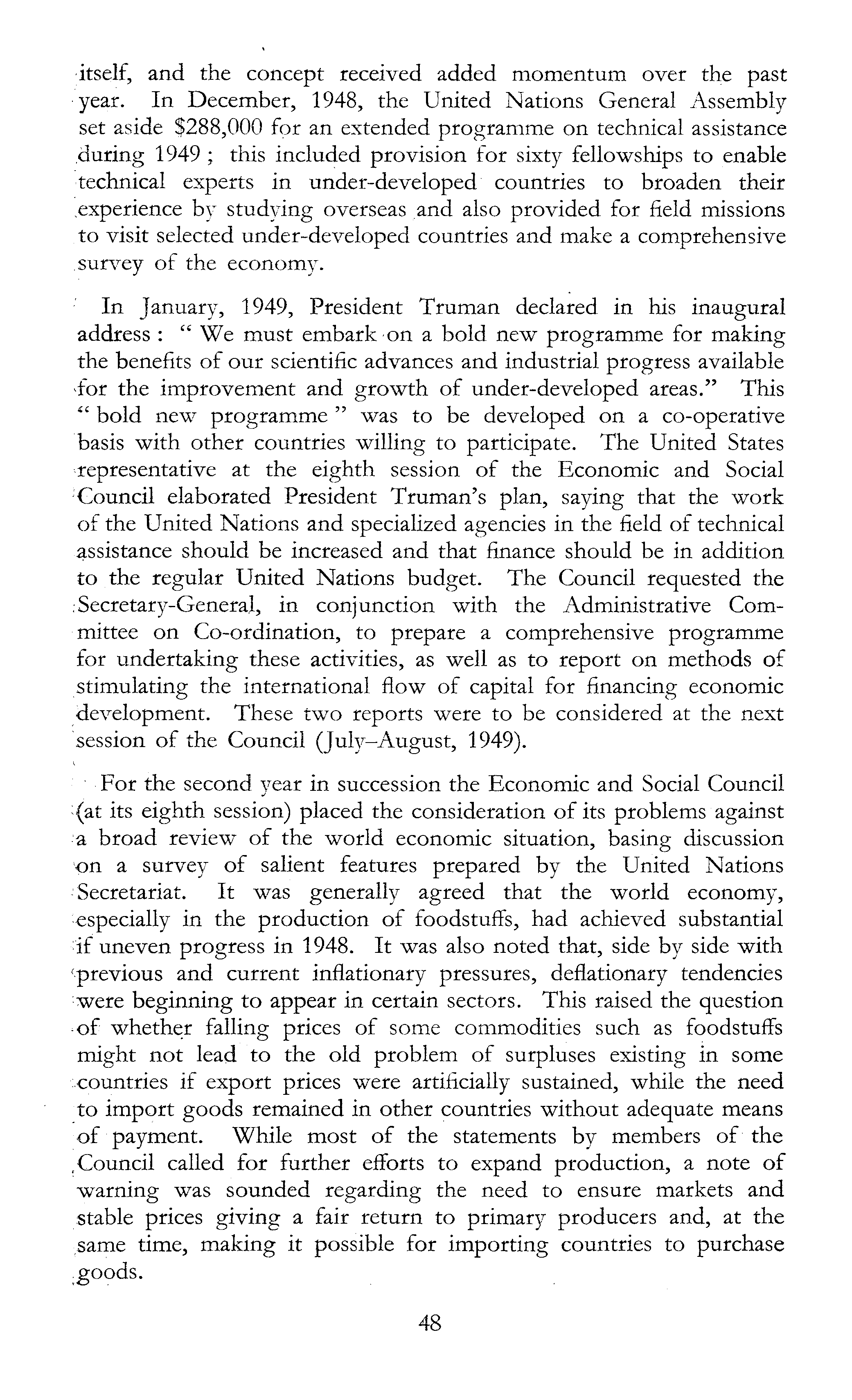 itself, and the concept received added momentum over the past year. In December, 1948, the United Nations General Assembly set aside $288,000 for an extended programme on technical assistance during 1949 ; this included provision for sixty fellowships to enable technical experts in under-developed countries to broaden their experience by studying overseas and also provided for field missions to visit selected under-developed countries and make a comprehensive survey of the economy. In January, 1949, President Truman declared in his inaugural address : "We must embark on a bold new programme for making the benefits of our scientific advances and industrial progress available for the improvement and growth of under-developed areas." This " bold new programme " was to be developed on a co-operative basis with other countries willing to participate. The United States representative at the eighth session of the Economic and Social Council elaborated President Truman's plan, saying that the work of the United Nations and specialized agencies in the field of technical assistance should be increased and that finance should be in addition to the regular United Nations budget. The Council requested the .Secretary-General, in conjunction with the Administrative Committee on Co-ordination, to prepare a comprehensive programme for undertaking these activities, as well as to report on methods of stimulating the international flow of capital for financing economic development. These two reports were to be considered at the next session of the Council (July-August, 1949). For the second year in succession the Economic and Social Council (at its eighth session) placed the consideration of its problems against a broad review of the world economic situation, basing discussion on a survey of salient features prepared by the United Nations Secretariat. It was generally agreed that the world economy, especially in the production of foodstuffs, had achieved substantial if uneven progress in 1948. It was also noted that, side by side with 'previous and current inflationary pressures, deflationary tendencies were beginning to appear in certain sectors. This raised the question ■of whether falling prices of some commodities such as foodstuffs might not lead to the old problem of surpluses existing in some -countries if export prices were artificially sustained, while the need to import goods remained in other countries without adequate means of payment. While most of the statements by members of the .Council called for further efforts to expand production, a note of warning was sounded regarding the need to ensure markets and stable prices giving a fair return to primary producers and, at the ■same time, making it possible for importing countries to purchase goods.