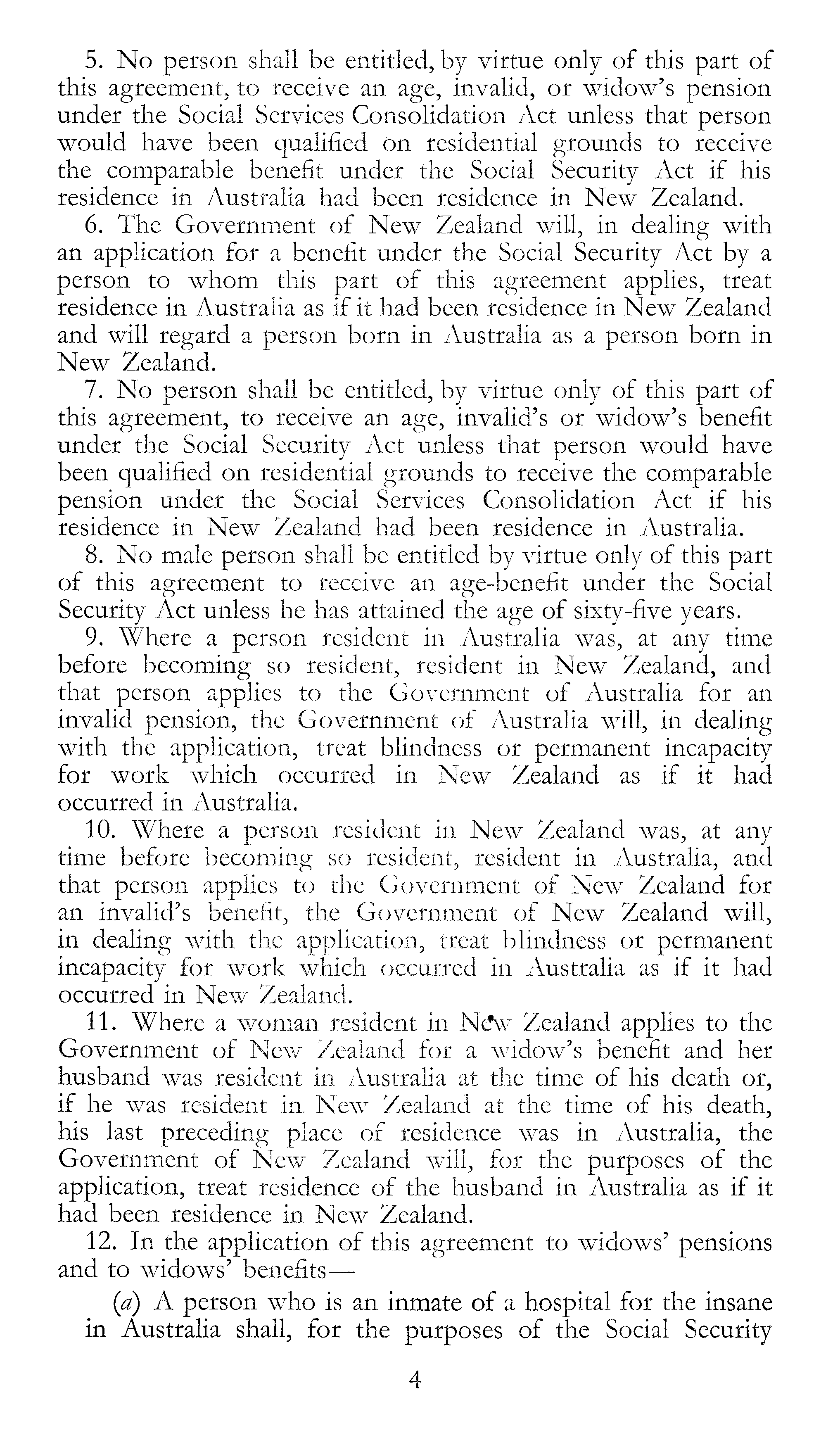 5. No person shall be entitled, by virtue only of this part of this agreement, to receive an age, invalid, or widow's pension under the Social Services Consolidation Act unless that person would have been qualified On residential grounds to receive the comparable benefit under the Social Security Act if his residence in Australia had been residence in New Zealand. 6. The Government of New Zealand will, in dealing with an application for a benefit under the Social Security Act by a person to whom this part of this agreement applies, treat residence in Australia as if it had been residence in New Zealand and will regard a person born in Australia as a person born in New Zealand. 7. No person shall be entitled, by virtue only of this part of this agreement, to receive an age, invalid's or widow's benefit under the Social Security Act unless that person would have been qualified on residential grounds to receive the comparable pension under the Social Services Consolidation Act if his residence in New Zealand had been residence in Australia. 8. No male person shall be entitled by virtue only of this part of this agreement to receive an age-benefit under the Social Security Act unless he has attained the age of sixty-five years. 9. Where a person resident in Australia was, at any time before becoming so resident, resident in New Zealand, and that person applies to the Government of Australia for an invalid pension, the Government of Australia will, in dealing with the application, treat blindness or permanent incapacity for work which occurred in New Zealand as if it had occurred in Australia. 10. Where a person resident in New Zealand was, at any time before becoming so resident, resident in Australia, and that person applies to the Government of New Zealand for an invalid's benefit, the Government of New Zealand will, in dealing with the application, treat blindness or permanent incapacity for work which occurred in Australia as if it had occurred in New Zealand. 11. Where a woman resident in NeV Zealand applies to the Government of New Zealand for a widow's benefit and her husband was resident in Australia at the time of his death or, if he was resident in. New Zealand at the time of his death, liis last preceding place of residence was in Australia, the Government of New Zealand will, for the purposes of the application, treat residence of the husband in Australia as if it had been residence in New Zealand. 12. In the application of this agreement to widows' pensions and to widows' benefits—(a) A person who is an inmate of a hospital for the insane in Australia shall, for the purposes of the Social Security