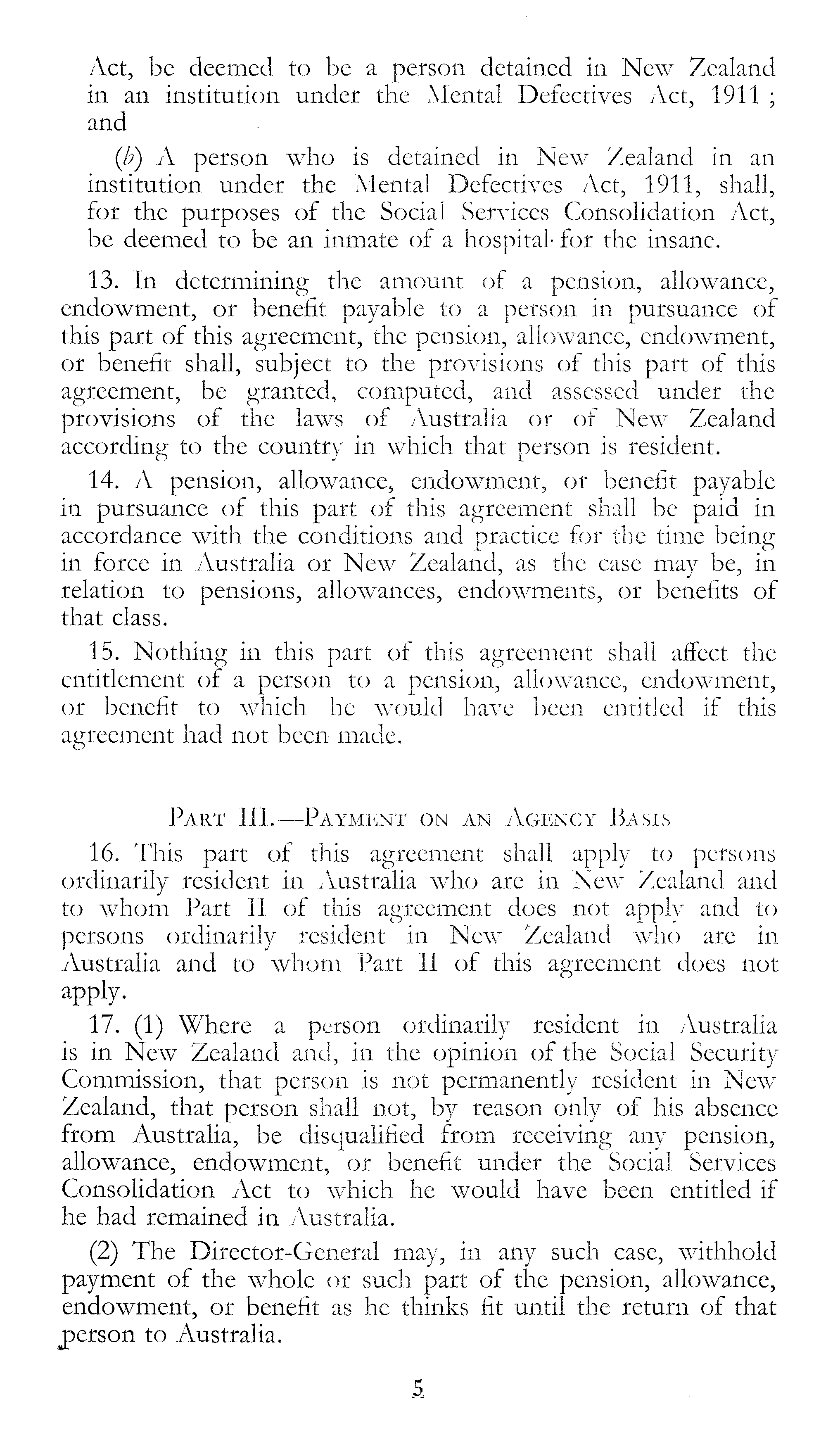 Act, be deemed to be a person detained in New Zealand in an institution under the Mental Defectives Act, 1911 ; and (b) A person who is detained in New Zealand in an institution under the Mental Defectives Act, 1911, shall, for the purposes of the Social Services Consolidation Act, be deemed to be an inmate of a hospital- for the insane. 13. In determining the amount of a pension, allowance, endowment, or benefit payable to a person in pursuance of this part of this agreement, the pension, allowance, endowment, or benefit shall, subject to the provisions of this part of this agreement, be granted, computed, and assessed under the provisions of the laws of Australia or of New Zealand according to the country in which that person is resident. 14. A pension, allowance, endowment, or benefit payable in pursuance of this part of this agreement shall be paid in accordance with the conditions and practice for the time being in force in Australia or New Zealand, as the case may be, in relation to pensions, allowances, endowments, or benefits of that class. 15. Nothing in this part of this agreement shall affect the entitlement of a person to a pension, allowance, endowment, or benefit to which he would have been entitled if this agreement had not been made. Part lll.—Payment on an Agency Basis 16. This part of this agreement shall apply to persons ordinarily resident in Australia who are in New Zealand and to whom Part II of this agreement does not apply and to persons ordinarily resident in New Zealand who are in Australia and to whom Part II of this agreement does not apply. 17. (1) Where a person ordinarily resident in Australia is in New Zealand and, in the opinion of the Social Security Commission, that person is not permanently resident in New Zealand, that person shall not, by reason only of his absence from Australia, be disqualified from receiving any pension, allowance, endowment, or benefit under the Social Services Consolidation Act to which he would have been entitled if he had remained in Australia. (2) The Director-General may, in any such case, withhold payment of the whole or such part of the pension, allowance, endowment, or benefit as he thinks fit until the return of that to Australia.