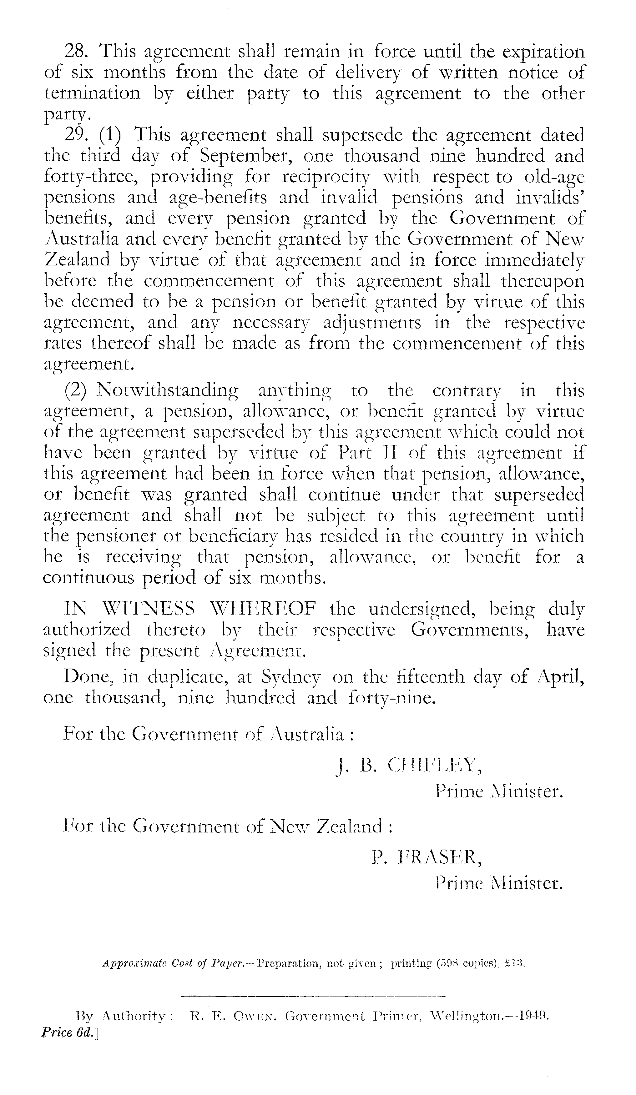 28. This agreement shall remain in force until the expiration of six months from the date of delivery of written notice of termination by either party to this agreement to the other party. 29. (1) This agreement shall supersede the agreement dated the third day of September, one thousand nine hundred and forty-three, providing for reciprocity with respect to old-age pensions and age-benefits and invalid pensions and invalids' benefits, and every pension granted by the Government of Australia and every benefit granted by the Government of New Zealand by virtue of that agreement and in force immediately before the commencement of this agreement shall thereupon be deemed to be a pension or benefit granted by virtue of this agreement, and any necessary adjustments in the respective rates thereof shall be made as from the commencement of this agreement. (2) Notwithstanding anything to the contrary in this agreement, a pension, allowance, or benefit granted by virtue of the agreement superseded by this agreement which could not have been granted by virtue of Part II of this agreement if this agreement had been in force when that pension, allowance, or benefit was granted shall continue under that superseded agreement and shall not be subject to this agreement until the pensioner or beneficiary has resided in the country in which he is receiving that pension, allowance, or benefit for a continuous period of six months. IN WITNESS WHEREOF the undersigned, being duly authorized thereto by their respective Governments, have signed the present Agreement. Done, in duplicate, at Sydney on the fifteenth day of April, one thousand, nine hundred and forty-nine. For the Government of Australia : J. B. CHIFLEY, Prime Minister. For the Government of New Zealand : P. FRASER, Prime Minister.
