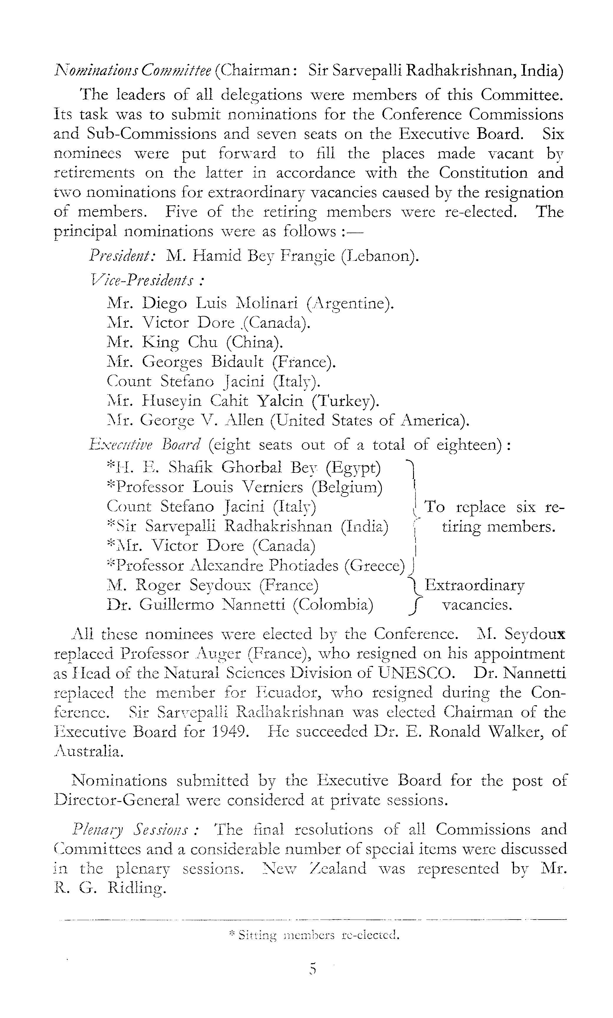 Nominations Committee (Chairman: Sir Sarvepalli Radhakrishnan, India) The leaders of all delegations were members of this Committee. Its task was to submit nominations for the Conference Commissions and Sub-Commissions and seven seats on the Executive Board. Six nominees were put forward to fill the places made vacant by retirements on the latter in accordance with the Constitution and two nominations for extraordinary vacancies caused by the resignation of members. Five of the retiring members were re-elected. The -principal nominations were as follows : President: M. Hamid Bey Frangie (Lebanon). Vice-Presidents : Mr. Diego Luis Molinari (Argentine). Mr. Victor Dore .(Canada). Mr. King Chu (China). Mr. Georges Bidault (France). Count Stefano Jacini (Italy). Mr. Huseyin Cahit Yalcin (Turkey). Mr. George V. Allen (United States of America). 'Executive Board (eight seats out of a total of eighteen) : *H. E. Shafik Ghorbal Bey (Egypt) * Professor Louis Verniers (Belgium) Count Stefano Jacini (Italy) , JTo replace six re- * Sir Sarvepalli Radhakrishnan (India) \ tiring members. *Mr. Victor Dore (Canada) • j Alexandre; Photiades (Greece) J M. Roger Seydoux (France) \ Extraordinary Dr. Guillermo Nannetti (Colombia) J vacancies. All these nominees were elected by the Conference. M. Seydoux replaced Professor Auger (France), who resigned on his appointment as Head of the Natural Sciences Division of UNESCO. Dr. Nannetti replaced the member for Ecuador, who resigned during the Conference. Sir Sarvepalli Radhakrishnan was elected Chairman of the Executive Board for 1949. He succeeded Dr. E. Ronald Walker, of Australia. Nominations submitted by the Executive Board for the post of Director-General were considered at private sessions. Plenary Sessions : The final resolutions of all Commissions and Committees and a considerable number of special items were discussed in the plenary sessions. New Zealand was represented by Mr. R. G. Ridling.