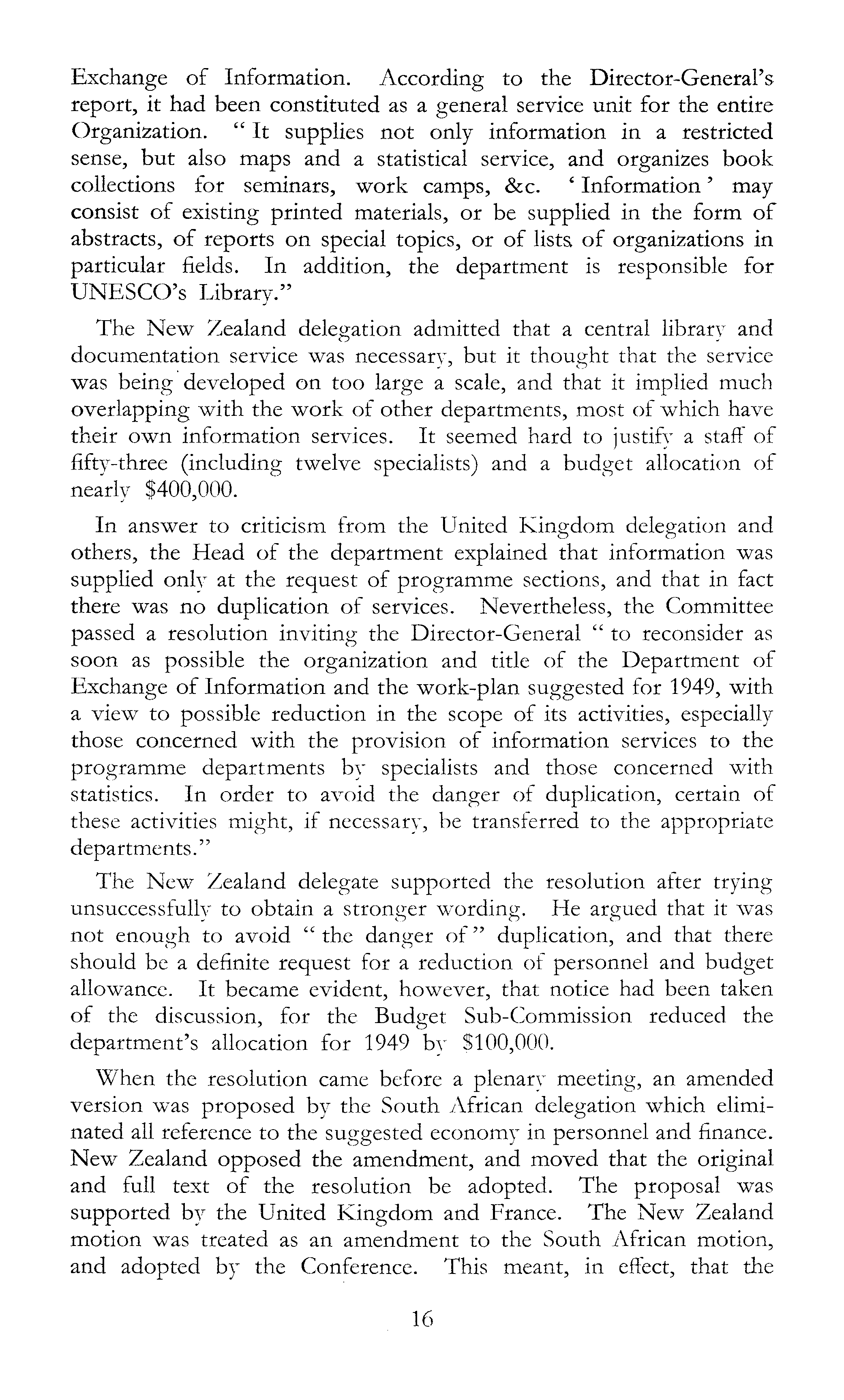 Exchange of Information. According to the Director-General's report, it had been constituted as a general service unit for the entire Organization. "It supplies not only information in a restricted sense, but also maps and a statistical service, and organizes book collections for seminars, work camps, &c. £ Information' may consist of existing printed materials, or be supplied in the form of abstracts, of reports on special topics, or of lists of organizations in particular fields. In addition, the department is responsible for UNESCO's Library." The New Zealand delegation admitted that a central library and documentation service was necessary, but it thought that the service was being developed on too large a scale, and that it implied much overlapping with the work of other departments, most of which have their own information services. It seemed hard to justify a staff of fifty-three (including twelve specialists) and a budget allocation of nearly $400,000. In answer to criticism from the United Kingdom delegation and others, the Head of the department explained that information was .supplied only at the request of programme sections, and that in fact there was no duplication of services. Nevertheless, the Committee passed a resolution inviting the Director-General " to reconsider as soon as possible the organization and title of the Department of Exchange of Information and the work-plan suggested for 1949, with a view to possible reduction in the scope of its activities, especially those concerned with the provision of information services to the programme departments by specialists and those concerned with statistics. In order to avoid the danger of duplication, certain of these activities might, if necessary, be transferred to the appropriate departments." The New Zealand delegate supported the resolution after trying unsuccessfully to obtain a stronger wording. He argued that it was not enough to avoid " the danger of" duplication, and that there should be a definite request for a reduction of personnel and budget allowance. It became evident, however, that notice had been taken of the discussion, for the Budget Sub-Commission reduced the department's allocation for 1949 by SIOO,OOO. When the resolution came before a plenary meeting, an amended version was proposed by the South African delegation which eliminated all reference to the suggested economy in personnel and finance. New Zealand opposed the amendment, and moved that the original and full text of the resolution be adopted. The proposal was supported by the United Kingdom and France. The New Zealand motion was treated as an amendment to the South African motion, and adopted by the Conference. This meant, in effect, that the