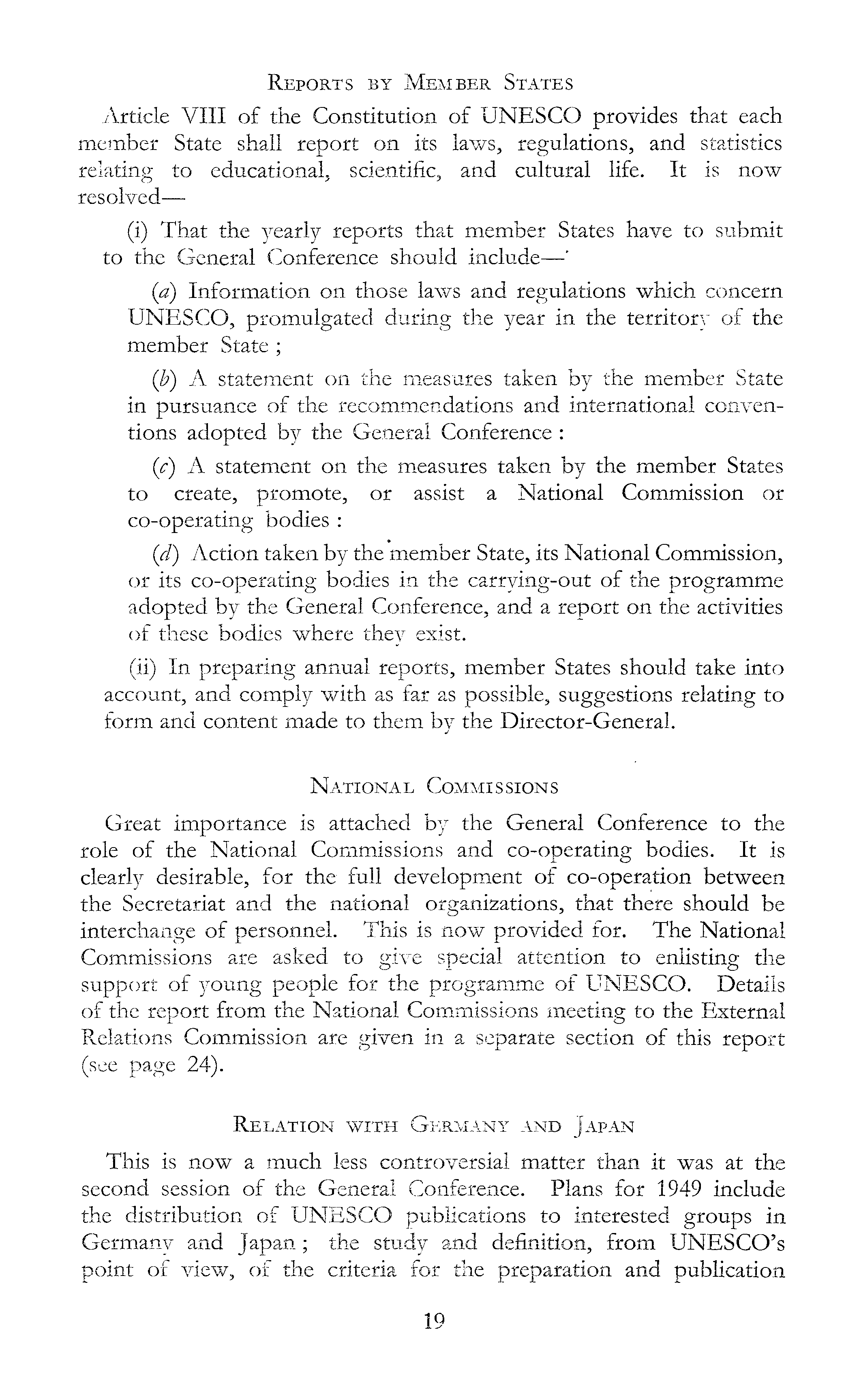 Reports by Member States Article VIII of the Constitution of UNESCO provides that each member State shall report on its laws, regulations, and statistics relating to educational, scientific, and cultural life. It is now resolved—(i) That the yearly reports that member States have to submit to the General Conference should include—' (a) Information on those laws and regulations which concern UNESCO, promulgated during the year in the territory of the member State ; (,b) A statement on the measures taken by the member State in pursuance of the recommendations and international conventions adopted by the General Conference : (c) A statement on the measures taken by the member States to create, promote, or assist a National Commission or co-operating bodies : (d) Action taken by the member State, its National Commission, or its co-operating bodies in the carrying-out of the programme adopted by the General Conference;, and a report on the activities of these bodies where they exist. (ii) In preparing annual reports, member States should take into account, and comply with as far as possible, suggestions relating to form and content made to them by the Director-General. National Commissions Great importance is attached by the General Conference to the role of the National Commissions and co-operating bodies. It is clearly desirable, for the full development of co-operation between the Secretariat and the national organizations, that there should be interchange of personnel. This is now provided for. The National Commissions are asked to give special attention to enlisting the support of young people for the programme of UNESCO. Details of the report from the National Commissions meeting to the External Relations Commission are given in a separate section of this report (see page 24). Relation with Germany and Japan This is now a much less controversial matter than it was at the second session of the General Conference. Plans for 1949 include the distribution of UNESCO publications to interested groups in Germany and Japan; the study and definition, from UNESCO's point of view, of the criteria for the preparation and publication