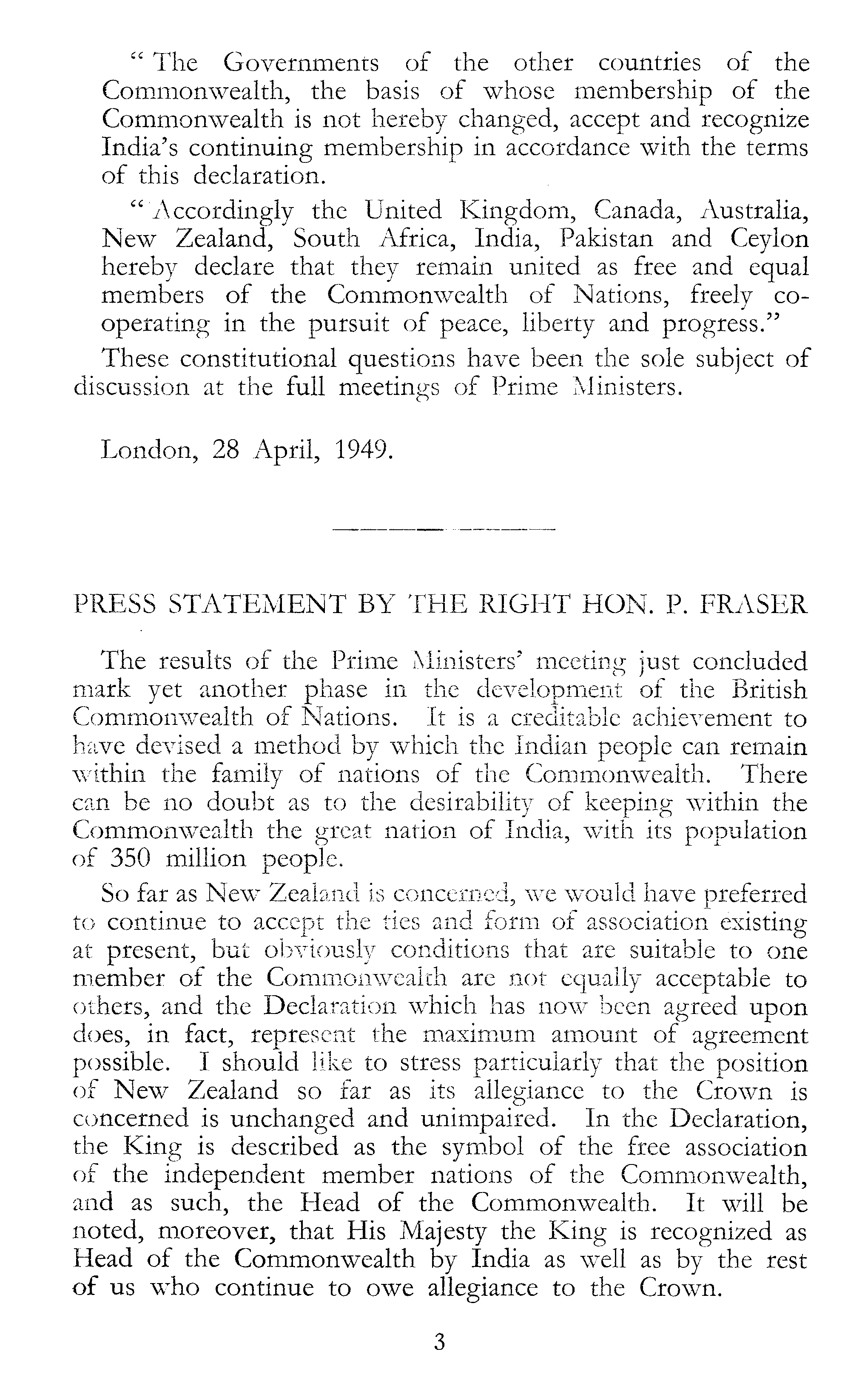 PRESS STATEMENT BY THE RIGHT HON. P. FRASER The results of the Prime Ministers' meeting just concluded mark yet another phase in the development of the British Commonwealth of Nations. It is a creditable achievement to have devised a method by which the Indian people can remain within the family of nations of the Commonwealth. There can be no doubt as to the desirability of keeping within the Commonwealth the great nation of India, with its population of 350 million people. So far as New Zealand is concerned, we would have preferred to continue to accept the ties and form of association existing at present, but obviously conditions that are suitable to one member of the Commonwealth are not equally acceptable to others, and the Declaration which has now been agreed upon does, in fact, represent the maximum amount of agreement possible. I should like to stress particularly that the position of New Zealand so far as its allegiance to the Crown is concerned is unchanged and unimpaired. In the Declaration, the King is described as the symbol of the free association of the independent member nations of the Commonwealth, and as such, the Head of the Commonwealth. It will be noted, moreover, that His Majesty the King is recognized as Head of the Commonwealth by India as well as by the rest of us who continue to owe allegiance to the Crown.