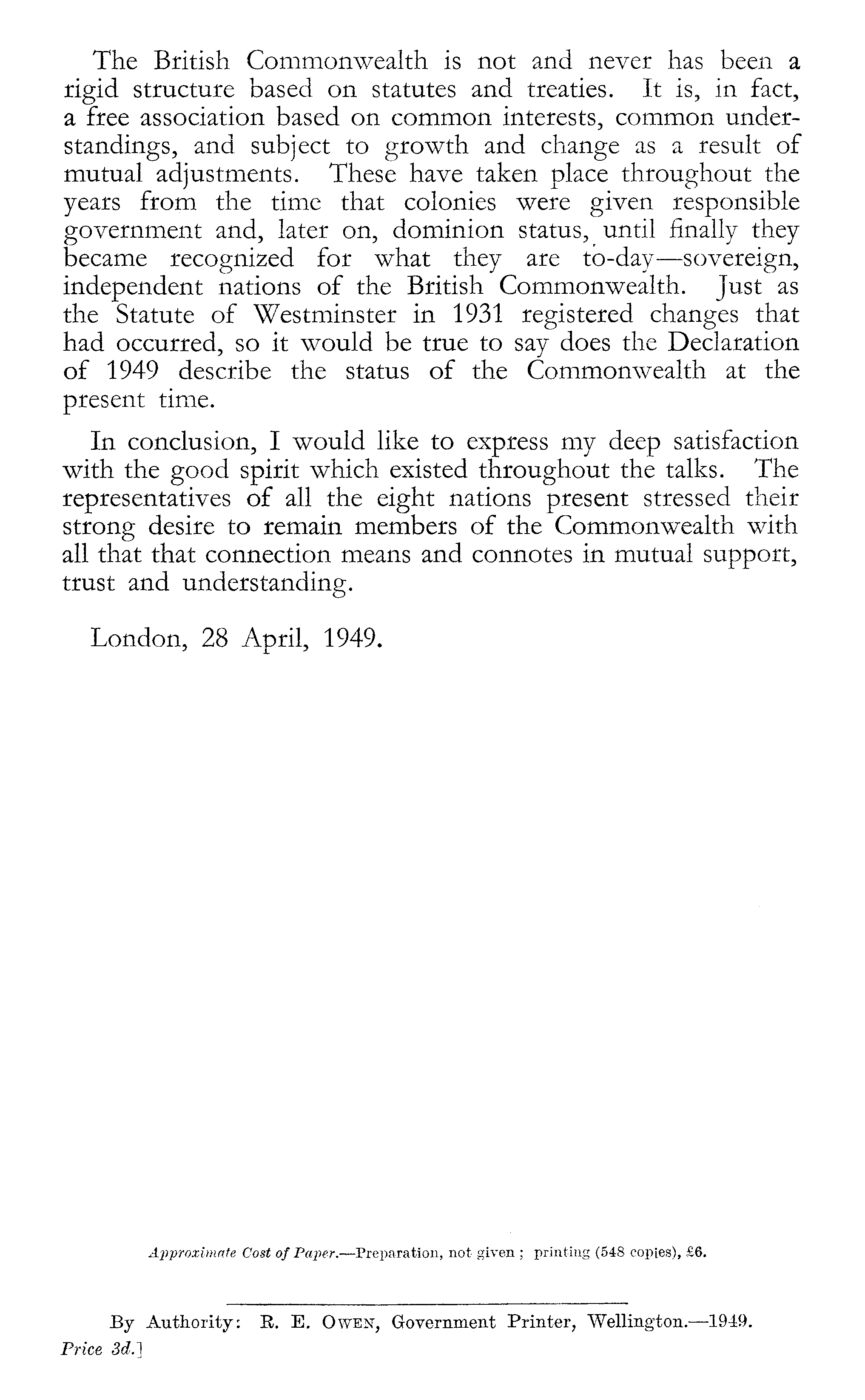 The British Commonwealth is not and never has been a rigid structure based on statutes and treaties. It is, in fact, a free association based on common interests, common understandings, and subject to growth and change as a result of mutual adjustments. These have taken place throughout the years from the time that colonies were given responsible government and, later on, dominion status, until finally they became recognized for what they are to-day—sovereign, independent nations of the British Commonwealth. Just as the Statute of Westminster in 1931 registered changes that had occurred, so it would be true to say does the Declaration of 1949 describe the status of the Commonwealth at the present time. In conclusion, I would like to express my deep satisfaction with the good spirit which existed throughout the talks. The representatives of all the eight nations present stressed their strong desire to remain members of the Commonwealth with all that that connection means and connotes in mutual support, trust and understanding. London, 28 April, 1949.