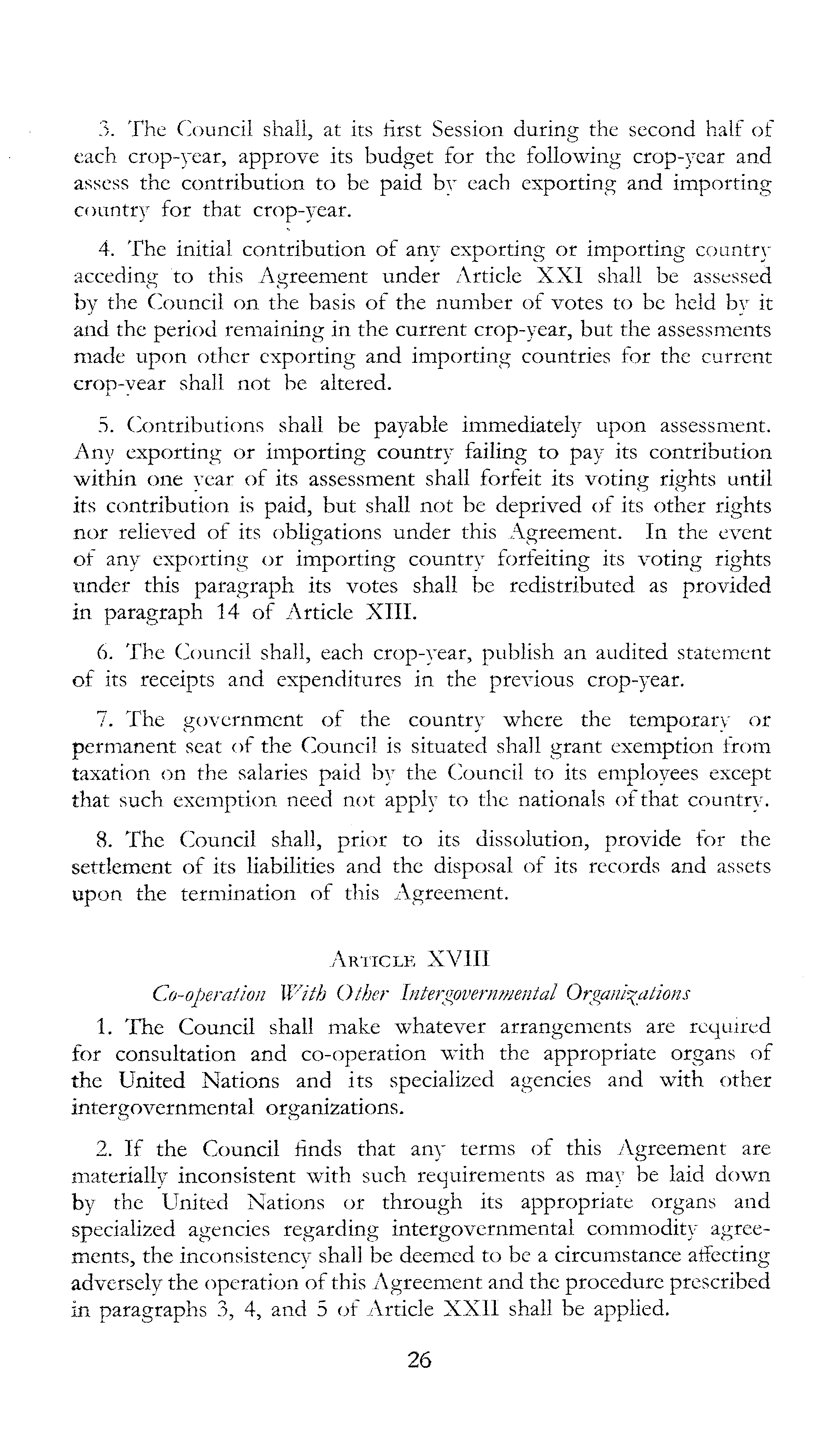 3. The Council shall, at its first Session during the second half of each crop-year, approve its budget for the following crop-year and assess the contribution to be paid by each exporting and importing country for that crop-year. 4. The initial contribution of any exporting or importing country acceding to this Agreement under Article XXI shall be assessed by the Council on the basis of the number of votes to be held by it and the period remaining in the current crop-year, but the assessments made upon other exporting and importing countries for the current crop-year shall not be altered. 5. Contributions shall be payable immediately upon assessment. Any exporting or importing country failing to pay its contribution within one year of its assessment shall forfeit its voting rights until its contribution is paid, but shall not be deprived of its other rights nor relieved of its obligations under this Agreement. In the event of any exporting or importing country forfeiting its voting rights under this paragraph its votes shall be redistributed as provided in paragraph 14 of Article XIII. 6. The Council shall, each crop-year, publish an audited statement of its receipts and expenditures in the previous crop-year. 7. The government of the country where the temporary or permanent seat of the Council is situated shall grant exemption from taxation on the salaries paid by the Council to its employees except that such exemption need not apply to the nationals of that country. 8. The Council shall, prior to its dissolution, provide for the settlement of its liabilities and the disposal of its records and assets upon the termination of this Agreement. Article XVIII Co-operation, With Other Intergovernmental Organisations 1. The Council shall make whatever arrangements are required for consultation and co-operation with the appropriate organs of the United Nations and its specialized agencies and with other intergovernmental organizations. v 2. If the Council finds that any terms of this Agreement are materially inconsistent with such requirements as may be laid down by the United Nations or through its appropriate organs and specialized agencies regarding intergovernmental commodity agreements, the inconsistency shall be deemed to be a circumstance affecting, adversely the operation of this Agreement and the procedure prescribed in paragraphs 3, 4, and 5 of Article XXII shall be applied.