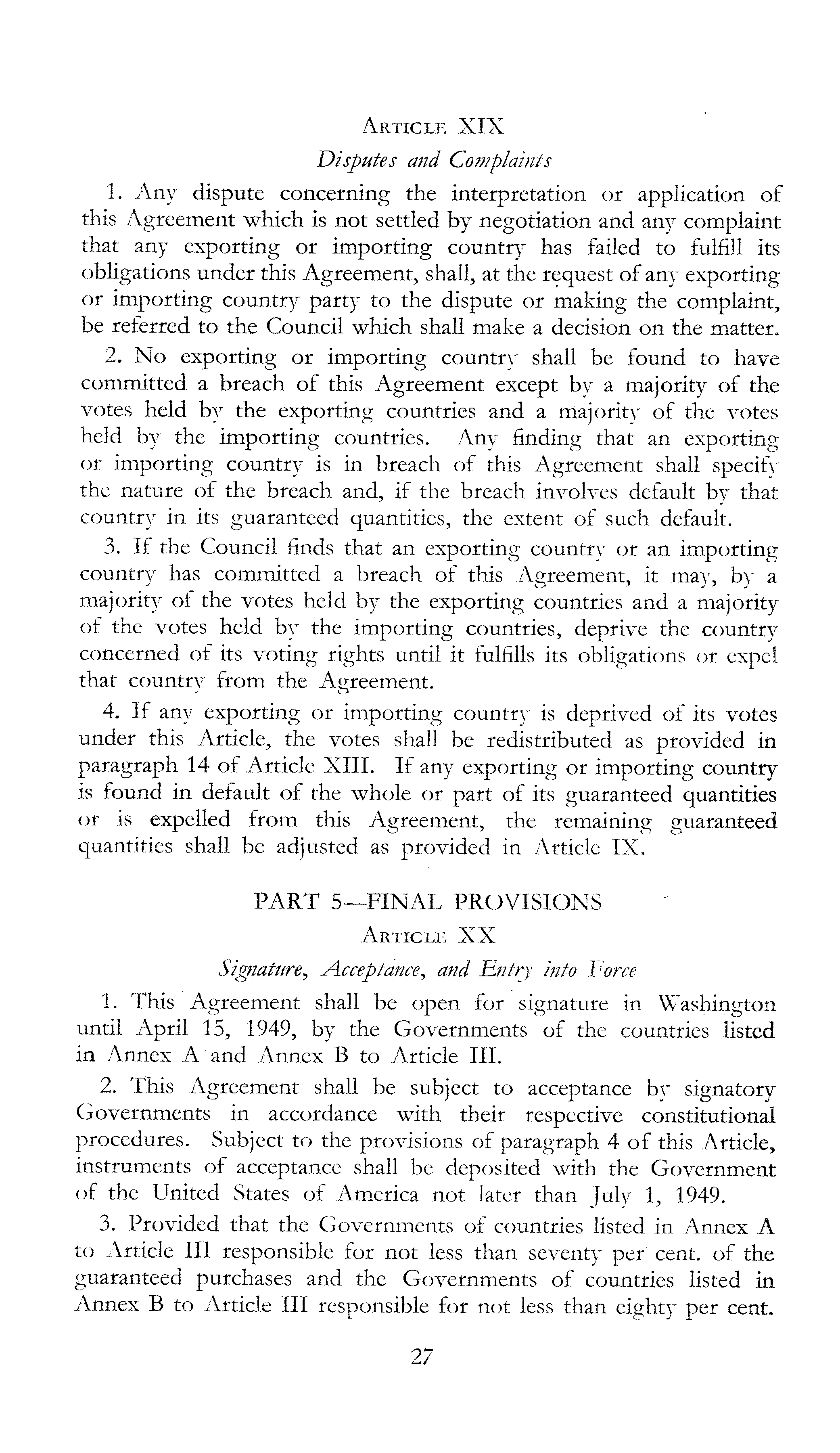 Article XIX Disputes and Complaints 1. Any dispute concerning the interpretation or application of this Agreement which is not settled by negotiation and any complaint that any exporting or importing country has failed to fulfill its obligations under this Agreement,' shall, at the request of any exporting or importing country party to the dispute or making the complaint, be referred to the Council which shall make a decision on the matter. 2. No exporting or importing country shall be found to have committed a breach of this Agreement except by a majority of the votes held by the exporting countries and a majority of the votes held by the importing countries. Any finding that an exporting or importing country is in breach of this Agreement shall specify the nature of the breach and, if the breach involves default by that country in its guaranteed quantities, the extent of such default. 3. If the Council finds that an exporting country or an importing country has committed a breach of this Agreement, it may, by a majority of the votes held by the exporting countries and a majority of the votes held by the importing countries, deprive the country concerned of its voting rights until it fulfills its obligations or expel that country from the Agreement. 4. If any exporting or importing country is deprived of its votes under this Article, the votes shall be redistributed as provided in paragraph 14 of Article XIII. If any exporting or importing country is found in default of the whole or part of its guaranteed quantities or is expelled from this Agreement, the remaining guaranteed quantities shall be adjusted as provided in Article IX. PART S—FINAL PROVISIONS Article XX Signature, Acceptance, and Entry into Force 1. This Agreement shall be open for signature in Washington until April 15, 1949, by the Governments of the countries listed in Annex A and Annex B to Article 111. 2. This Agreement shall be subject to acceptance by signatory Governments in accordance with their respective constitutional procedures. Subject to the provisions of paragraph 4of this Article, instruments of acceptance shall be deposited with the Government of the United States of America not later than July 1, 1949. 3. Provided that the Governments of countries listed in Annex A to Article 111 responsible for not less than seventy per cent, of the guaranteed purchases and the Governments of countries listed in Annex B to Article 111 responsible for not less than eighty per cent.