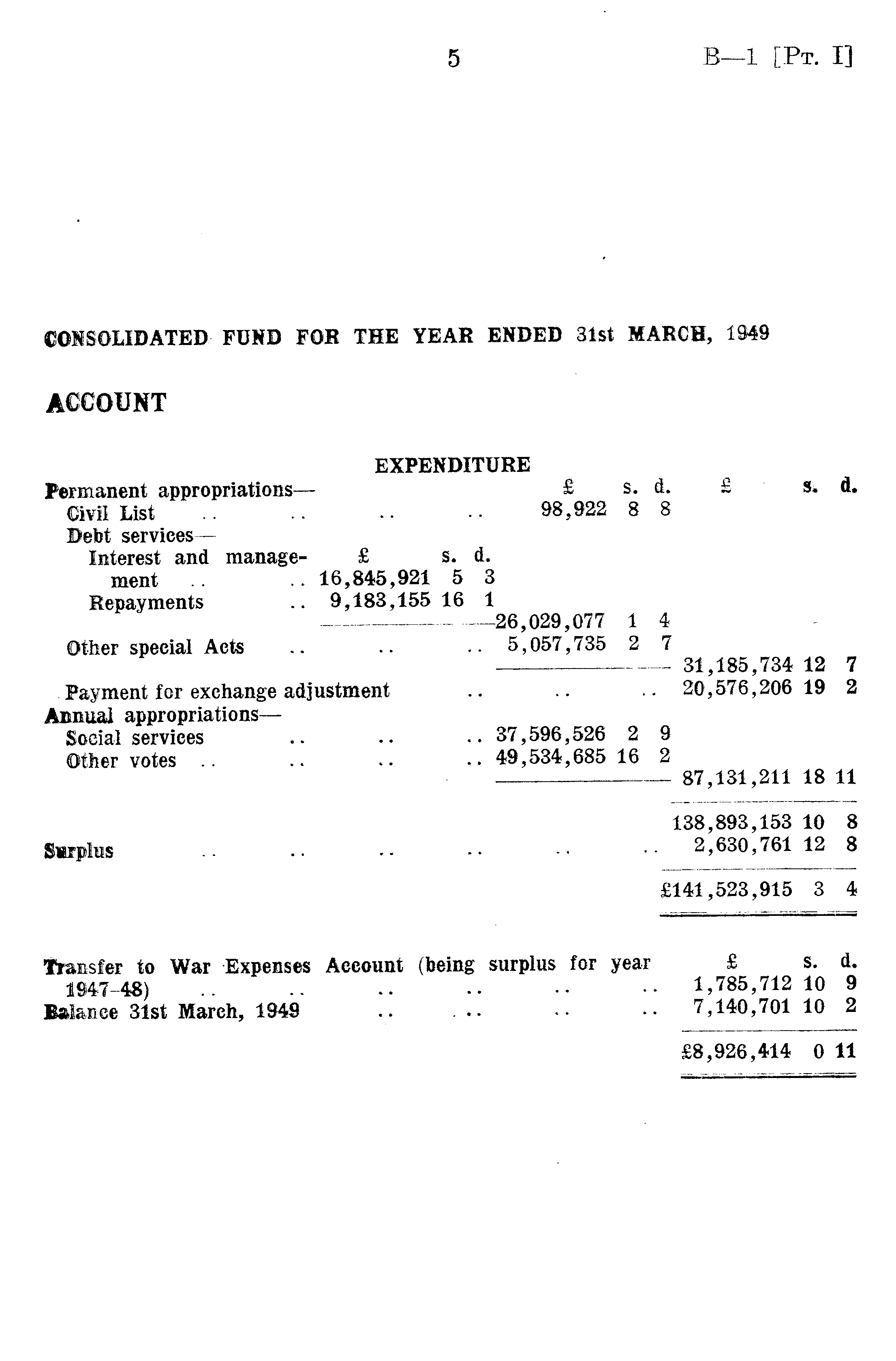 CONSOLIDATED FUND FOR THE YEAR ENDED 31st MARCH, 1949 ACCOUNT EXPENDITURE Permanent appropriations— £ s. d. £ s. d. Civil List .. • - 98,922 8 8 Debt services— Interest and manage- £ s. d. ment .. 16,845,921 5 3 Repayments .. 9,183,155 16 1 26,029,077 1 4 Other special Acts .. .. .. 5,057,735 2 7 31,185,734 12 7 Payment for exchange adjustment .. .. .. 20,576,206 19 2 Annual appropriations— Social services .. .. .. 37,596,526 2 9 Other votes .. .. .. •• 49,534,685 16 2 87,131,211 18 11 138,893,153 10 8 Sirplus •• •• •• •• 2,630,761 12 8 £141,523,915 3 4 transfer to War Expenses Account (being surplus for year £ s. d. 1947-48) .. .. •• •• •• 1,785,712 10 9 Balance 31st March, 1949 .. .. •• •• 7,140,701 10 2 £8,926,414 0 11